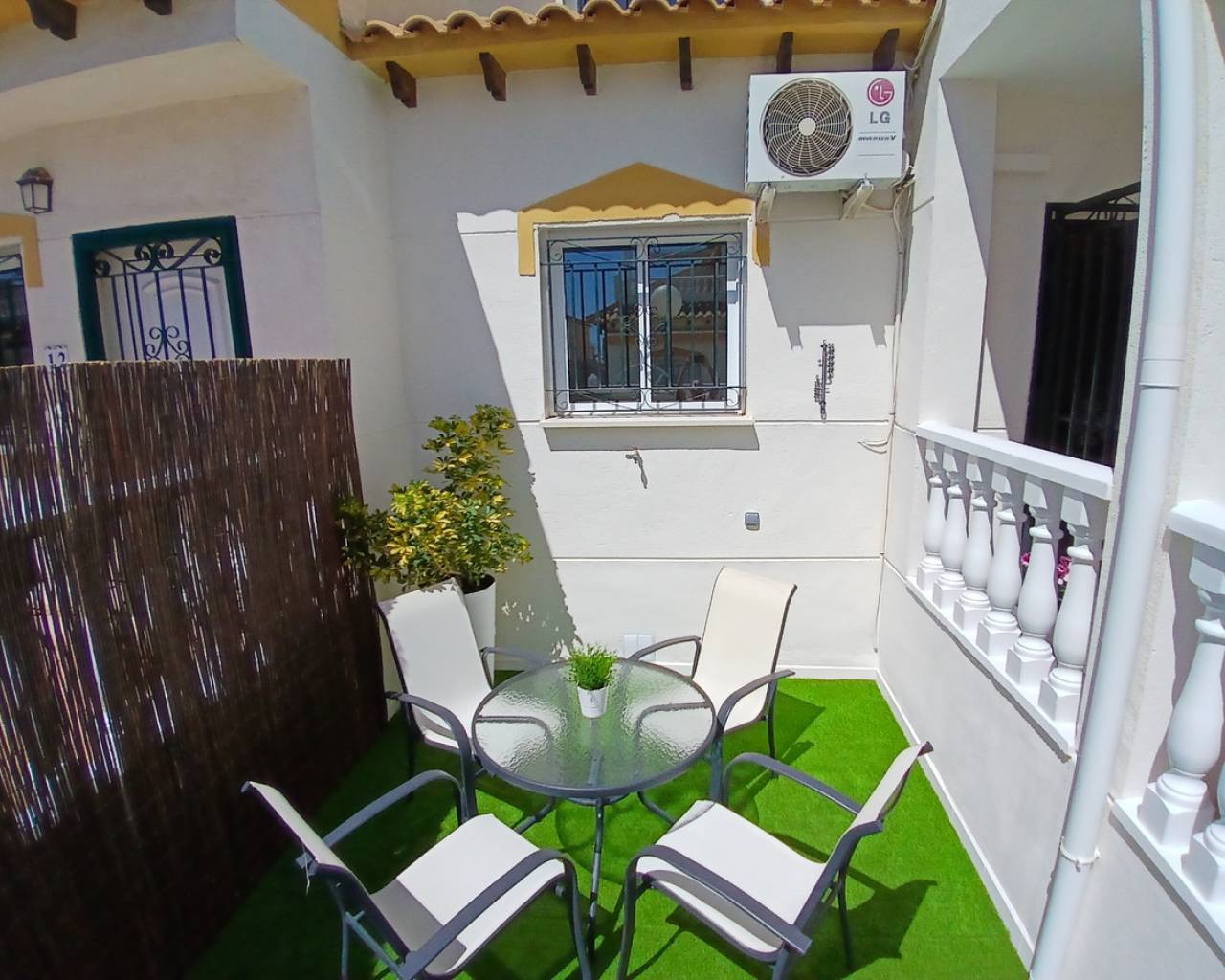 Se ofrece esta vivienda adosada de dos plantas, completamente renovada, situada en una urbanización tranquila entre Los Altos, La Florida y Punta Prima, en Orihuela Costa. La propiedad ha sido actualizada con un estilo moderno y funcional, y se presenta en excelente estado, lista para entrar a vivir. En la planta baja se encuentra un salón-comedor con buena entrada de luz natural y aire acondicionado, una cocina independiente equipada con electrodomésticos actuales, un dormitorio doble, un baño con ducha y una zona de lavandería. Desde el salón se accede a una terraza orientada al sur, ideal para disfrutar del clima de la zona. La planta superior dispone de un dormitorio principal amplio, también con aire acondicionado y espacio de trabajo, un tercer dormitorio con dos camas individuales y un segundo baño completo con ducha. La vivienda cuenta con un porche cubierto, jardín privado y mobiliario exterior. Se entrega completamente amueblada, salvo objetos personales y decorativos. Forma parte de un residencial bien mantenido con piscina comunitaria y ofrece facilidad de aparcamiento en la misma calle. Ubicada a pocos minutos de la playa de Punta Prima, la propiedad también está cerca de supermercados, restaurantes, transporte público y centros comerciales como Zenia Boulevard. Una opción ideal tanto como residencia habitual como para uso vacacional.