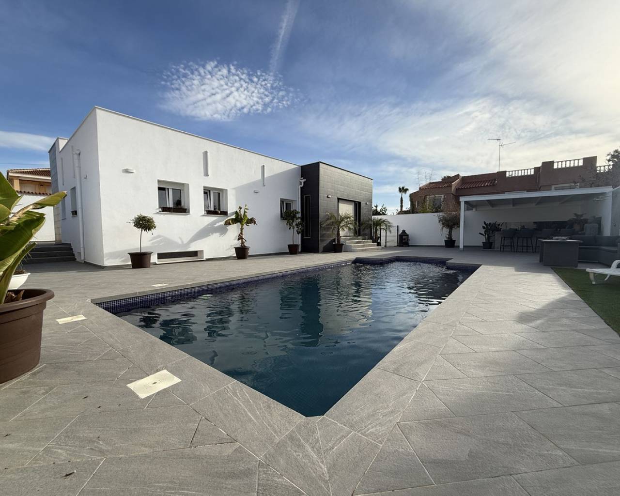 Descubra esta impresionante villa independiente, completamente renovada en 2023 y que ofrece un confort moderno con prestaciones de alta calidad. Idealmente situada en el corazón de Ciudad Quesada, la propiedad se encuentra cerca de todas las comodidades y a solo 15 minutos del mar, combinando a la perfección comodidad y vida costera. Cuenta con una hermosa piscina privada de 8x4 m con bomba de calor, ideal para disfrutar todo el año. La casa dispone de 4 amplios dormitorios y 2 baños, además de un luminoso salón de 47 m² con cocina americana moderna y totalmente equipada, y un anexo adicional. Todas las estancias cuentan con aire acondicionado nuevo. En el sótano encontrará una versátil habitación de 22 m², perfecta como dormitorio de invitados, estudio independiente o sala de ocio, con su propio cuarto de ducha. La renovación incluye ventanas de PVC con doble acristalamiento, garantizando un excelente aislamiento. El exterior orientado al sur ofrece una cocina exterior, barbacoa y zonas ideales para relajarse. La propiedad dispone también de aparcamiento interior y se vende totalmente amueblada.