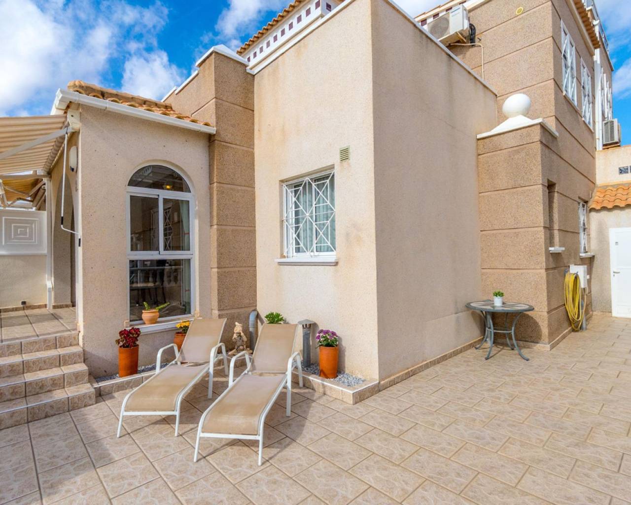 Atractiva casa adosada en la popular zona de Altos de la Bahía, Aguas Nuevas, a tan solo 1,7 km de la playa de La Mata. La propiedad cuenta con cuatro dormitorios y dos baños, una terraza de 47 m2 y un solárium de 19 m2 orientado al sur. La urbanización dispone de una preciosa piscina, ideal para relajarse en los días soleados.~~Se vende amueblada.~~A poca distancia de la playa, tiendas y restaurantes. Perfecta como casa de vacaciones o residencia permanente.