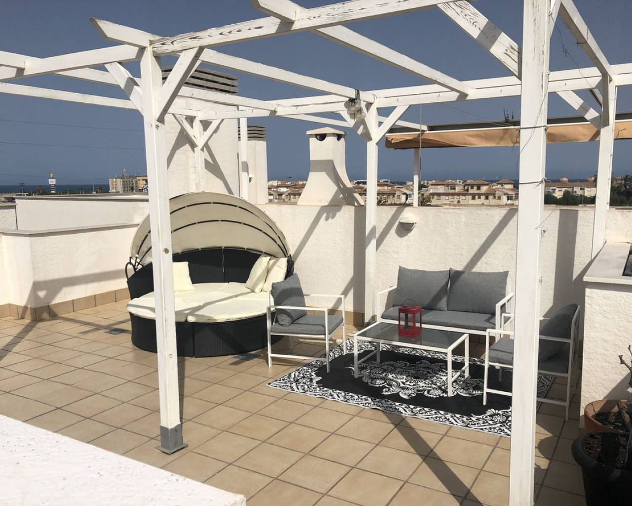 Roof terrace apartment in Punta Prima Torrevieja. Modern Home with Private Rooftop Terrace in a Prime Location This residential complex consists of 33 apartments and offers a communal pool, jacuzzi, and lush garden areas. The property for sale is located on the top floor and features a private rooftop terrace. Upon entering, you are welcomed by an open-plan kitchen with an adjoining laundry area. The kitchen is separated from the living room by a breakfast bar, creating a social and inviting atmosphere. The living room has direct access to a spacious terrace—perfect for family gatherings and relaxation. From here, you can enjoy stunning views of the communal green areas and the pool. The apartment has two bedrooms: one adjacent to the living room and the other to the left of the hallway. A staircase in the living room leads up to the private rooftop terrace, which offers ample space for relaxation and entertaining. The property includes an open parking space within the complex, as well as access to a bicycle storage area. PROPERTY DETAILS Total area: 141 m² Living area: 67.66 m² Terrace/Balcony: 13.98 m² Rooftop terrace: 64 m² Rooms: 3 (2 bedrooms, 1 bathroom) Orientation: South-facing, with views of the pool and garden Amenities: Communal pool and jacuzzi PRICE An additional cost of approximately 13% applies, including 10% VAT and the remaining amount covering administrative and legal fees. OPERATING COSTS Community fee: approx. €323/quarter Property tax (IBI): approx. €203/year Electricity subscription: approx. €29/month Water subscription: approx. €36/quarter Home insurance: approx. €244/year Garbage collection: approx. €60/year (from 2025) Non-resident income tax: approx. €170/year Availability: Handover upon registration of the title deed. SURROUNDINGS The property is ideally located in Punta Prima, close to Torrevieja and Orihuela Costa. Within walking distance, you will find restaurants, bars, supermarkets, shopping centers, and beautiful beaches. The beach of Punta Prima is just a short stroll away, and within a few minutes by car, you can reach all the beaches of Orihuela Costa. Torrevieja's city center is only a five-minute drive, and the area is also easily accessible by bicycle. Punta Prima's shopping center is less than a 10-minute walk away, with all essential services conveniently nearby. For golf enthusiasts, three renowned 18-hole golf courses—Villamartin, Campoamor, and La Rambla—are just a 10-minute drive away. The area has excellent public transport connections, with buses to Torrevieja and further links to the airport. There are also bus connections to nearby locations, including La Zenia Boulevard. Alicante Airport is approximately 40 km away, and Murcia Airport can be reached in about 50 minutes by car.