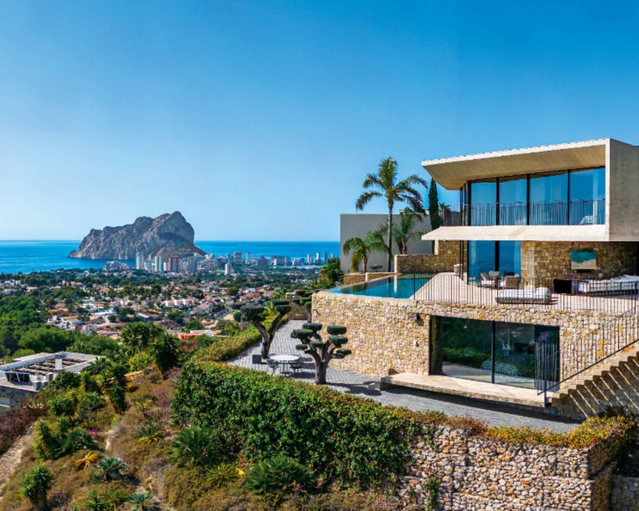 Fascinante villa de estilo moderno minimalista con piscina desbordante, amplia terraza, estudio de invitados, dormitorio separado e impresionantes vistas al mar. Resaltando sobre todas las demás casas de la zona por su diseño y su estilo, con el mar como protagonista en cada estancia y con la elegancia de una verdadera obra de arte arquitectónica digna de las mejores revistas especializadas del mundo, esta hermosa villa de lujo destaca por su luz y personalidad propias. Sus formas cuadradas en varios niveles, sus materiales de hormigón y piedra natural y su gran piscina alargada conforman una atípica y moderna estética que sorprende a primera vista. Su gran confort y su extrema practicidad, enamoran. Como si fuera construida para el deleite de los sentidos y de un templo para el descanso y la diversión se tratase, todo invita a disfrutar el momento...la espectacular piscina con maravillosas vistas al mar y conectada perfectamente con unos grandes ventanales que se abren al salón-comedor y a la moderna cocina con isla central que invita a tumbarse en una tumbona bajo la caricia del sol, un refrescante baño, despertarse viendo el amanecer desde la cama, darse un baño en su elegante bañera digna de un hotel de lujo, compartir animadas celebraciones en su terraza disfrutando de los encantadores atardeceres de la zona y recibir visitas que se pueden alojar en sus apartamentos independientes; es un lugar perfecto para construir momentos inolvidables. Situada en una tranquila zona residencial con muy poco tráfico, está a pocos minutos del bullicioso centro de Calpe y de todos sus servicios, de algunas de las playas y calas más espectaculares de toda la costa, de su elegante club náutico, de actividades deportivas como su club de bolos y su club de golf con vista al icónico Peñón de Ifach e infinidad de actividades acuáticas como cruceros, excursiones a vela y tours acuáticos que harán las delicias de familia y amigos tanto si destinan la casa a residencia permanente y disfrutan el relajante estilo de vida mediterráneo como si es para perfecta residencia de vacaciones.