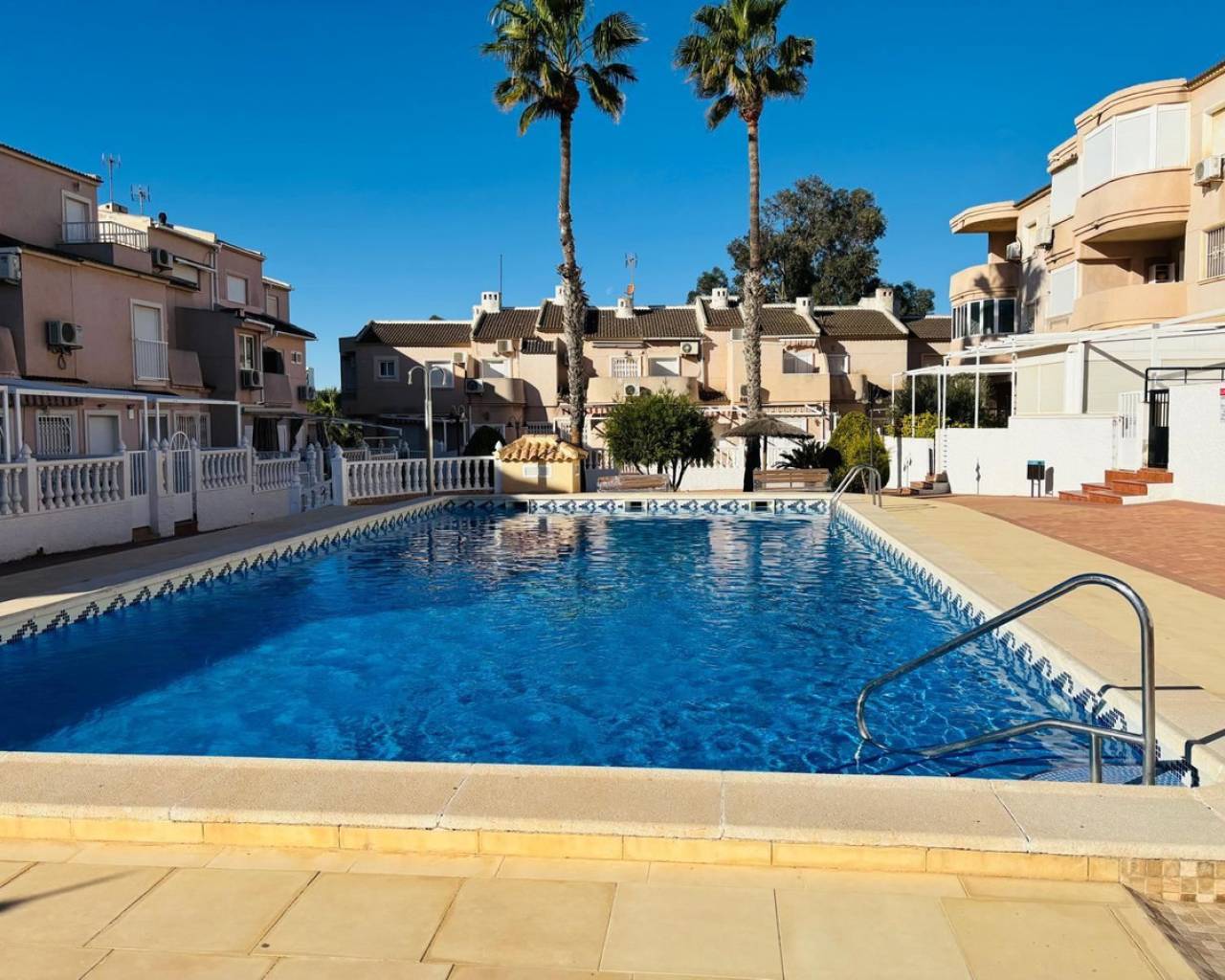 Casa adosada con patios, terrazas, vistas al mar y piscina comunitaria. Una cálida bienvenida a esta bonita y acogedora casa adosada con una ubicación atractiva cerca del mar y la playa en Mil Palmeras. La casa adosada tiene tres dormitorios, dos baños, salón y cocina. Además, hay dos patios en la planta baja, donde el patio tiene una barbacoa de obra. Un piso más arriba hay dos terrazas, una de ellas con vistas al mar. Este es un alojamiento ideal para quienes valoran la proximidad al mar Mediterráneo y a hermosas playas pero también comercios y restaurantes. En la Costa Blanca hay una amplia oferta de populares campos de golf y pistas de pádel. La ciudad de Torrevieja está a unos 15 minutos en coche y el aeropuerto se encuentra a unos 50 minutos. Todas las habitaciones tienen superficies agradables, luminosas y amuebladas con detalles claros. La sala de estar tiene espacio para una zona de estar y un comedor. La cocina está bien distribuida con buenas superficies de trabajo y opciones de almacenamiento. Los dormitorios cuentan con agradables ubicaciones y buena luz, espacio para camas y mesitas de noche. Baños frescos. En la zona común hay piscina y jardín. Póngase en contacto con nosotros para obtener más información o reservar una visita. Por supuesto, realizaremos visitas digitales si no puede asistir en persona.