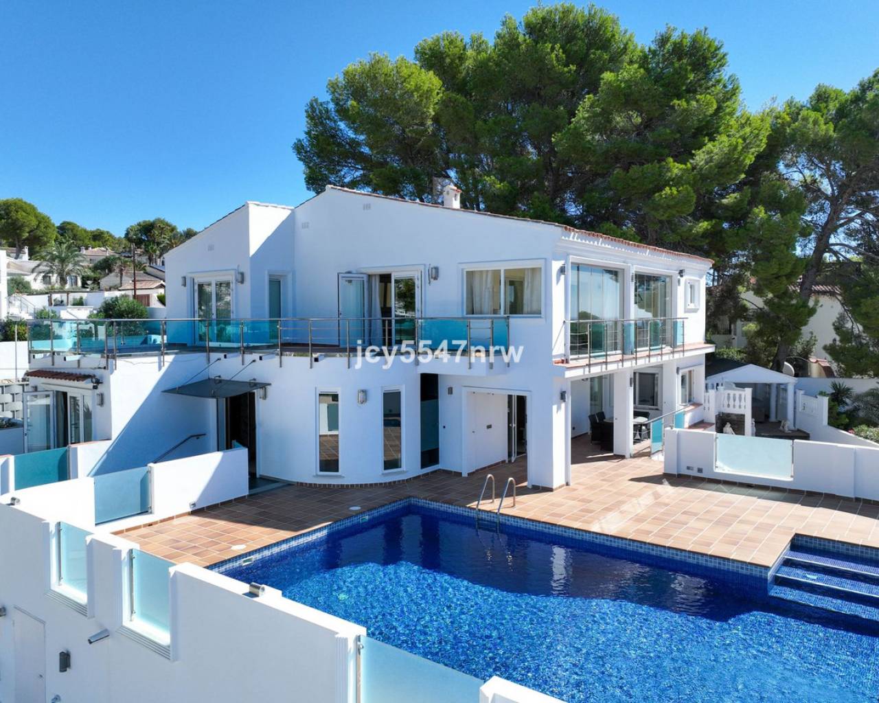 Villa de Ensueño en San Jaime: Lujo, Privacidad y Cercanía al Mar Ubicada en la popular urbanización de San Jaime, en la frontera entre Moraira y Benissa, se encuentra esta impresionante villa. En primer lugar, la parcela esquinera sobre la que se encuentra la villa está equipada con dos portones eléctricos de acceso para coches y una puerta peatonal, lo que facilita un acceso cómodo. La villa se distribuye en dos plantas. Debajo de la piscina, hay una amplia zona que se puede convertir en una cocina exterior o un gimnasio, según tus deseos. Además, hay una zona de aparcamiento privado accesible desde el lado de la calle y un garaje ubicado debajo de la terraza de la piscina, accesible desde el otro lado. Debajo de la piscina y la terraza, encontrarás una gran sala técnica para las instalaciones de la piscina, y en la parte trasera de la villa, también hay una sala técnica más pequeña. La villa cuenta con varias terrazas que ofrecen hermosas vistas de los terrenos y la naturaleza circundante. Además, no solo dispone de una atractiva piscina con ducha exterior, sino también de una encantadora zona para el jacuzzi. La parcela adyacente está incluida en la venta y tiene su propio portón eléctrico de acceso. Actualmente se utiliza como jardín, pero también se puede emplear para construir, por ejemplo, una casita o una pista de tenis (se deberá solicitar un permiso de construcción). El tamaño de la parcela es único dentro de la urbanización, ya que normalmente se construyen dos villas en una parcela de este tamaño. La villa está a solo unos minutos a pie de tiendas, restaurantes, un campo de golf y las playas. Esto ofrece la combinación perfecta de proximidad al mar, sin renunciar a la privacidad y tranquilidad. Además, la seguridad de la urbanización proporciona un ambiente seguro. Al entrar en la villa, inmediatamente experimentarás su ambiente lujoso y luminoso. En la planta baja, encontrarás el salón con puertas dobles que dan acceso a la terraza y la piscina. Esta zona de estar fluye hacia el comedor y una amplia y bien equipada cocina. En la parte trasera de la villa, tendrás acceso a la terraza, perfecta para comer al aire libre. Además, en la planta baja, hay un aseo de cortesía con ducha y dos dormitorios con baños en suite (uno con ducha y el otro con ducha y bañera). Uno de estos dormitorios tiene acceso a su propia terraza, y ambos están equipados con hermosos armarios empotrados con iluminación. Una elegante escalera te lleva a la planta superior, donde encontrarás espacio adicional de almacenamiento y acceso a un balcón estrecho que rodea la parte trasera y lateral de la villa. Este balcón es accesible desde dos dormitorios. Aquí también encontrarás un dormitorio con armarios empotrados y baño en suite con bañera, así como un dormitorio con armarios empotrados y baño en suite con ducha. Este dormitorio también da acceso a una amplia terraza. Finalmente, está el espacioso dormitorio principal, nuevamente equipado con armarios empotrados y acceso a una gran terraza. Este dormitorio principal tiene baño en suite con bañera y ducha. Un verdadero bonus es la terraza con vistas al mar, completamente equipada con cortinas de cristal, lo que la convierte en un lugar encantador para disfrutar incluso en períodos más fríos. Para mayor comodidad, la villa puede ser calentada por la chimenea del salón, las unidades de aire acondicionado (que también pueden enfriar) y radiadores en todas las habitaciones, incluidos los radiadores para toallas en los baños. ¡Te invitamos cordialmente a experimentar esta hermosa villa por ti mismo y descubrir el lujo que esta propiedad tiene para ofrecer!