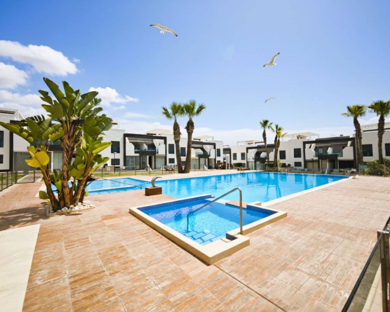 Urb. Oasis La Zenia Apartamento moderno en planta baja de 2 dormitorios y 2 baños en venta con piscina comunitaria y cerca de servicios como el centro comercial La Zenia Boulevard. A tan sólo 80 m del emblemático Centro Comercial Zenia Boulevard, encontramos este espectacular Bungalow de planta baja, construcción de estilo moderno, seminuevo con 2 dormitorios, 2 baños (1 de ellos en suite), amplia cocina especialmente diseñada estilo americana totalmente equipada con electrodomésticos de alta gama, amplio salón con acceso a su gran terraza. Es una propiedad muy luminosa y cálida especial para vivir todo el año o como casa de vacaciones. Amueblado con un estilo moderno, además de estar equipado con muchos extras como: Aire acondicionado, puertas blindadas, fibra óptica ect. Este hermoso apartamento está ubicado en un complejo residencial privado muy solicitado con jardines y zonas comunes bien cuidados y piscina comunitaria para uso exclusivo de sus residentes. Por su cercanía al centro comercial Zenia boulevard podrás disfrutar de tu tiempo libre en zonas de ocio, diferentes restaurantes, cafetería, tiendas, supermercado, farmacia, casino, así como de todos los servicios que ofrece la zona. Y se vende con 1 plaza de garaje subterránea incluida en el precio.