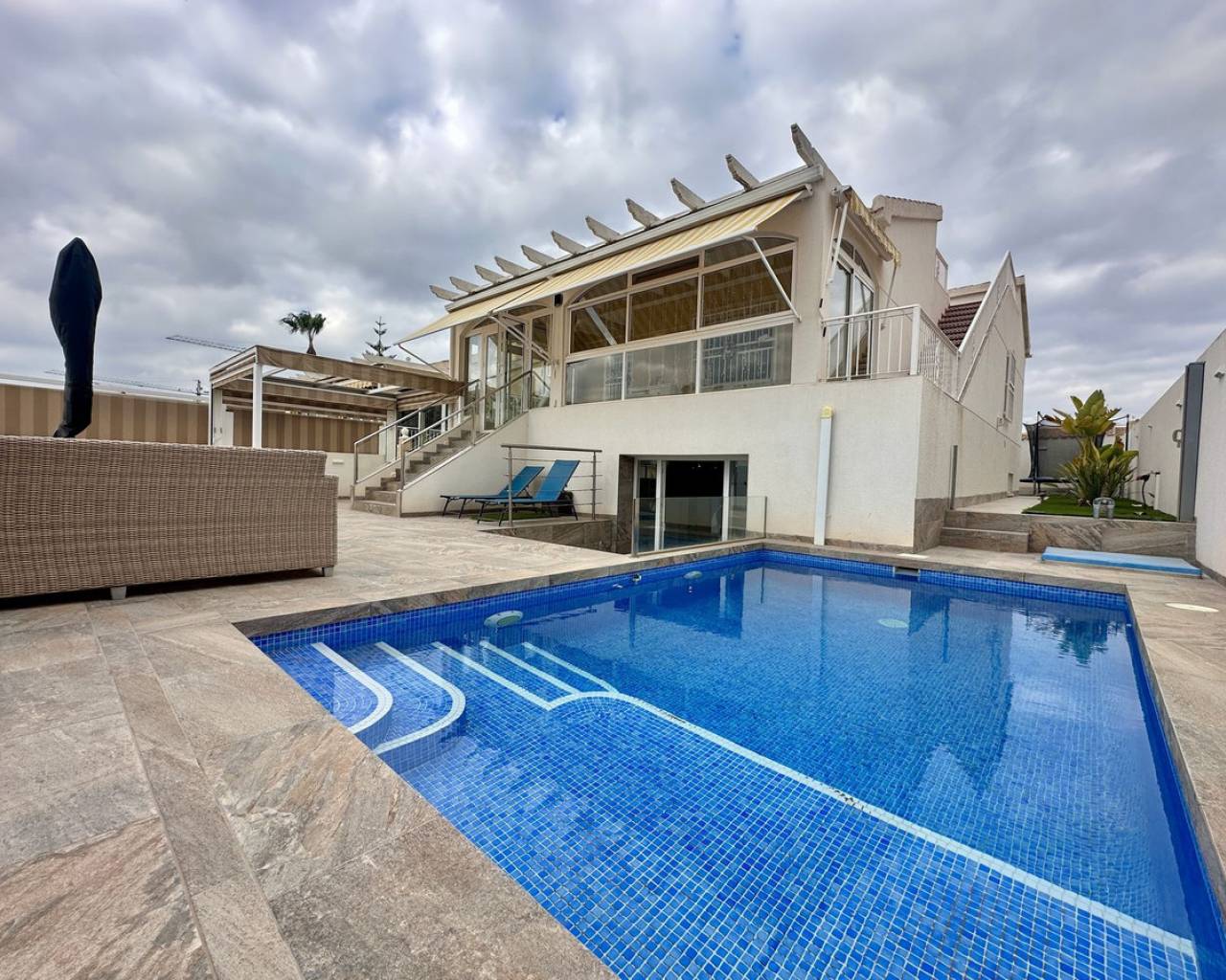 Villa - Chalet, Torrevieja, Costa Blanca. 3 Dormitorios, 3 Baños, Construidos 220 m², Jardin/Terreno 300 m². Posición : Cerca de Tiendas, Cerca de Ciudad, Urbanización. Orientación : Sur. Estado : Reformado Recientemente. Piscina : Privada. Climatización : Aire Acondicionado, Chimenea. Caracteristicas : Terraza Cubierta, Armarios Empotrados, Cerca de Transporte, Terraza Privada, Solario, Sauna, Aprtmnt. Huéspedes, Suelos de Mármol, Barbacoa, Doble acristalamiento, Sótano. Muebles : Amueblada. Cocina : Equipada. Jardin : Privado, Mantenimiento fácil. Seguridad : Persianas Eléctricas, Alarma. Aparcamiento : Privado. Servicios Públicos : Gas.