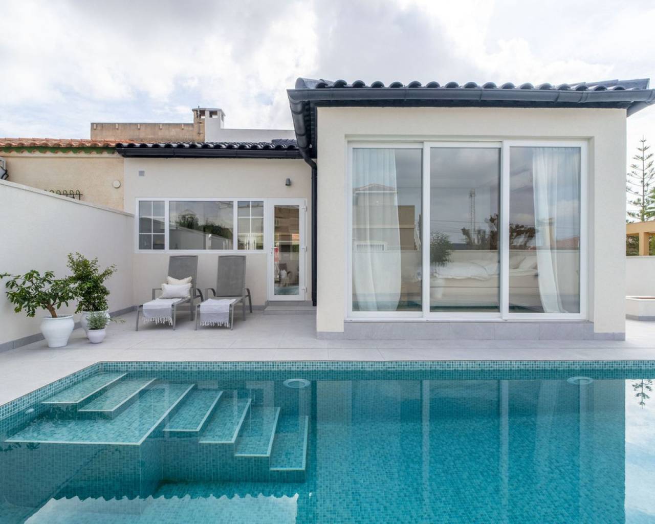 ¡Bienvenido a esta fantástica villa de una planta completamente renovada, el hogar de ensueño para aquellos que buscan una residencia moderna y elegante! Aquí se combinan el diseño sofisticado y los detalles cuidadosamente pensados, creando una atmósfera acogedora y encantadora. La villa cuenta con colores claros en toda su extensión y grandes ventanales que permiten una magnífica entrada de luz, aportando una sensación de amplitud y armonía en toda la vivienda. La espaciosa villa ofrece tres amplios dormitorios y dos baños recientemente renovados, que combinan funcionalidad moderna con un toque de estilo refinado. Aquí hay espacio tanto para relajantes duchas como para las rutinas matutinas, siempre con un estándar de alta calidad y materiales cuidadosamente seleccionados. El entorno exterior es un verdadero oasis, con una gran piscina que se convierte en un punto de encuentro natural durante los días soleados. Imagina disfrutar de tranquilos momentos de nado o tal vez un divertido día de piscina con familia y amigos; ¡este es el lugar perfecto para el relax y la convivencia! Desde la terraza en la azotea también podrás disfrutar de una vista fantástica del área y del sol durante todo el día. La terraza ofrece muchas posibilidades: decórala con muebles tipo lounge para agradables noches de barbacoa, crea un oasis verde con plantas y flores, o quizá un rincón cómodo para el café de la mañana. ¡Aquí realmente puedes disfrutar de la vida al aire libre! Esta villa ofrece todo lo que necesitas para crear un hogar que se sienta como un verdadero refugio. Aquí encontrarás estilo moderno, colores claros y generosos espacios sociales, tanto en el interior como en el exterior. ¡Bienvenido a tu nuevo hogar de ensueño, un lugar donde cada día se siente como unas vacaciones!