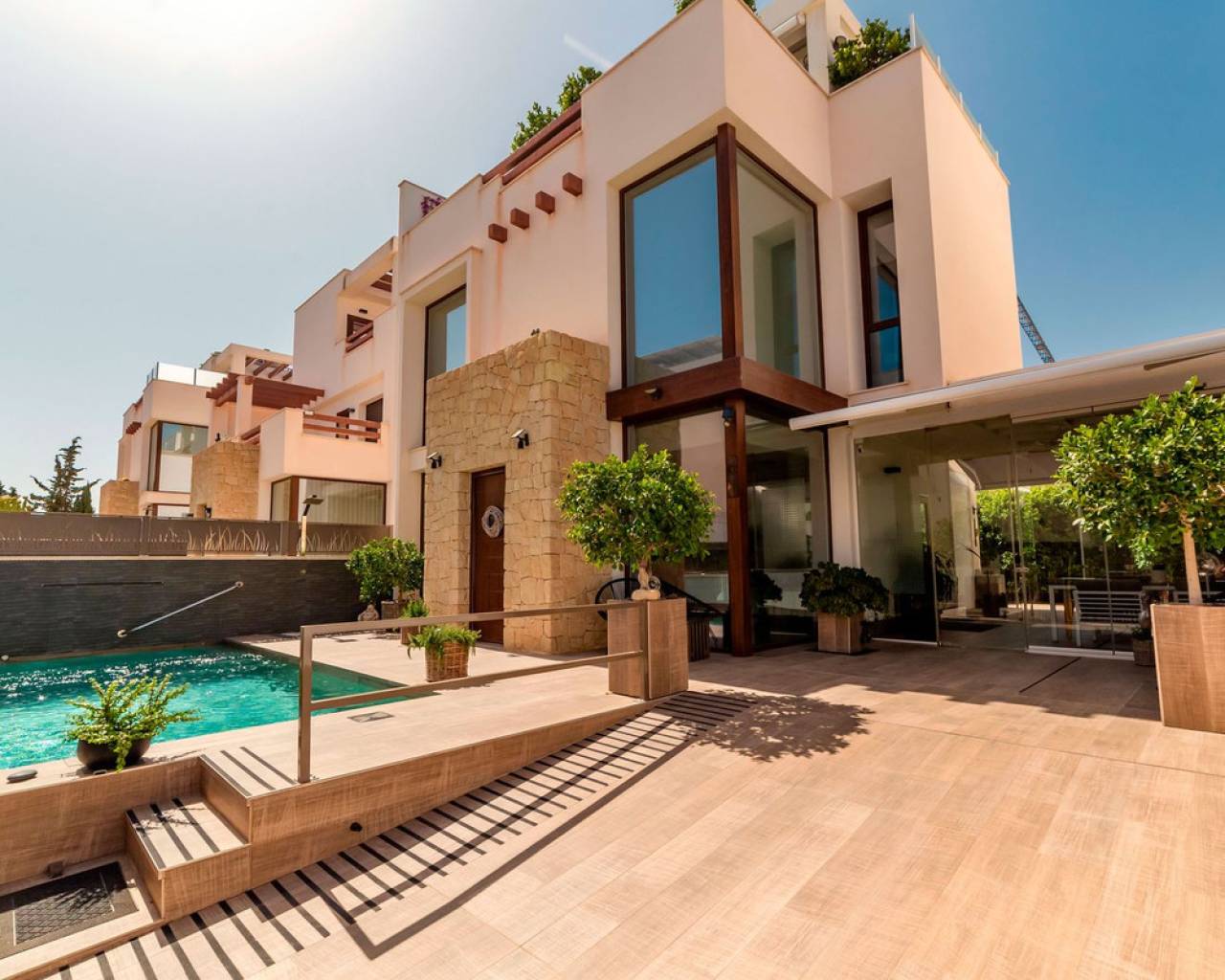 Villa Moderna en Estado Impecable – con Piscina Privada, Terraza en la Azotea y Vistas Espectaculares Bienvenido a esta villa única y cuidadosamente diseñada, en un estado absolutamente impecable. Una vivienda que ofrece la combinación perfecta de estilo, confort y funcionalidad. Aquí disfrutarás de un entorno residencial exclusivo y acogedor, situada en una parcela ajardinada con exuberante vegetación, coloridos arbustos y elegantes árboles. Privacidad Total – con Piscina de Agua Salada, Invernadero y Comodidades Modernas Desde el primer momento, te recibe un verdadero paraíso privado. La parcela protegida ofrece un ambiente tranquilo con total intimidad, ideal para quienes buscan paz y desconexión. La villa cuenta con su propia piscina de agua salada, perfecta para refrescarse en los días calurosos, y un invernadero acristalado que extiende la temporada exterior, funcionando como una segunda sala de estar durante la mayor parte del año. Además, está equipada con un sistema de filtrado de agua para toda la vivienda, garantizando agua de alta calidad en cada rincón. Espaciosa y Luminosa – con Altura de Techo Imponente y Distribución Inteligente El diseño de planta abierta conecta la moderna cocina con el amplio salón, creando una atmósfera social y luminosa. El salón presume de una altura de techo de 6 metro y ventanales de suelo a techo que inundan el espacio de luz natural, generando una sensación de amplitud extraordinaria. La propiedad dispone de calefacción por suelo radiante de agua en ambas plantas, lo que proporciona un confort térmico constante durante todo el año. Cada detalle ha sido cuidadosamente pensado, ideal tanto para el día a día como para el entretenimiento. Tres Amplios Dormitorios y Dos Baños Completos La vivienda ofrece tres dormitorios generosos, todos con espacio para camas dobles y armarios. Los dos baños completos están totalmente alicatados, ofreciendo confort y acabados de alta calidad. También cuenta con un aseo de invitados adicional, combinado con una práctica zona de lavandería. Azotea con Vistas Panorámicas, Cocina Auxiliar y Protección Solar Uno de los mayores atractivos de la propiedad es su amplia terraza en la azotea, que ofrece impresionantes vistas panorámicas del paisaje circundante. Hay espacio de sobra para zonas de descanso, tumbonas y comedor al aire libre. Para mayor comodidad, la terraza está equipada con una cocina auxiliar con fregadero y frigorífico/congelador, ideal para cenas de verano y cócteles al atardecer. Varios toldos retráctiles permiten crear sombra en los momentos más calurosos del día. Bajos Costes de Mantenimiento, Placas Solares y Vida Fácil El jardín, perfectamente cuidado, no solo es bonito sino también funcional, con múltiples zonas de descanso, áreas verdes y una plaza de aparcamiento privada en la parcela. Las placas solares ayudan a reducir los costes energéticos, representando una opción inteligente y sostenible. Toldos adicionales en la planta baja aseguran un ambiente agradable tanto dentro como fuera. La mayoría de los muebles, tanto interiores como exteriores, están incluidos, lo que te permite mudarte y empezar a disfrutar de inmediato. --- Resumen: * Estado impecable – listo para entrar a vivir y muy bien cuidado * Ubicación privada y sin visibilidad de vecinos * Piscina privada de agua salada e invernadero * 3 dormitorios amplios * 2 baños completos + aseo con lavadero * Distribución abierta y techo de 6 metros de altura en el salón * Calefacción por suelo radiante de agua en ambas plantas * Sistema de filtrado de agua para toda la vivienda * Grandes ventanales con luz natural excepcional * Amplia azotea con cocina auxiliar, toldos y vistas panorámicas * Jardín frondoso con hermosas plantas y árboles * Aparcamiento privado en la parcela * Placas solares = bajo coste energético * Incluye la mayoría del mobiliario, tanto interior como exterior Una propiedad que hay que visitar para apreciarla – ¡contáctanos hoy mismo para concertar una visita privada!