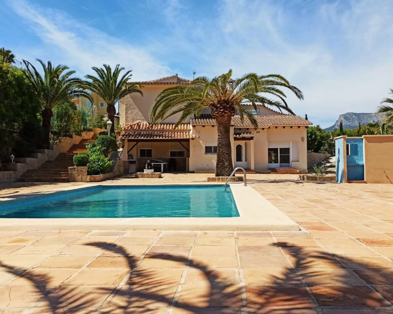 Cometa III Calpe - Villa con gran parcela y con pista de tenis en venta. En Cometa III en Calpe, presentamos esta hermosa villa en una parcela de 5934 m², con pista de tenis, piscina, y un hermoso jardín. La villa está dividida en una casa principal y una casa de invitados. Tanto la casa principal como la de invitados tienen un salón con cocina. La casa principal tiene 3 dormitorios y 3 baños. La casa de invitados tiene 2 dormitorios y 2 baños. Además, la casa principal tiene una hermosa sala de jardín y una terraza cubierta, con vistas a la Olta, Colina del Sol y Empedrola. La villa, la pista de tenis y los enormes jardines están en excelente estado. La villa también tiene un garaje para 1 coche, y un carport para 2 coches. Si es necesario, hay espacio suficiente para aparcar una docena de vehículos en esta propiedad.