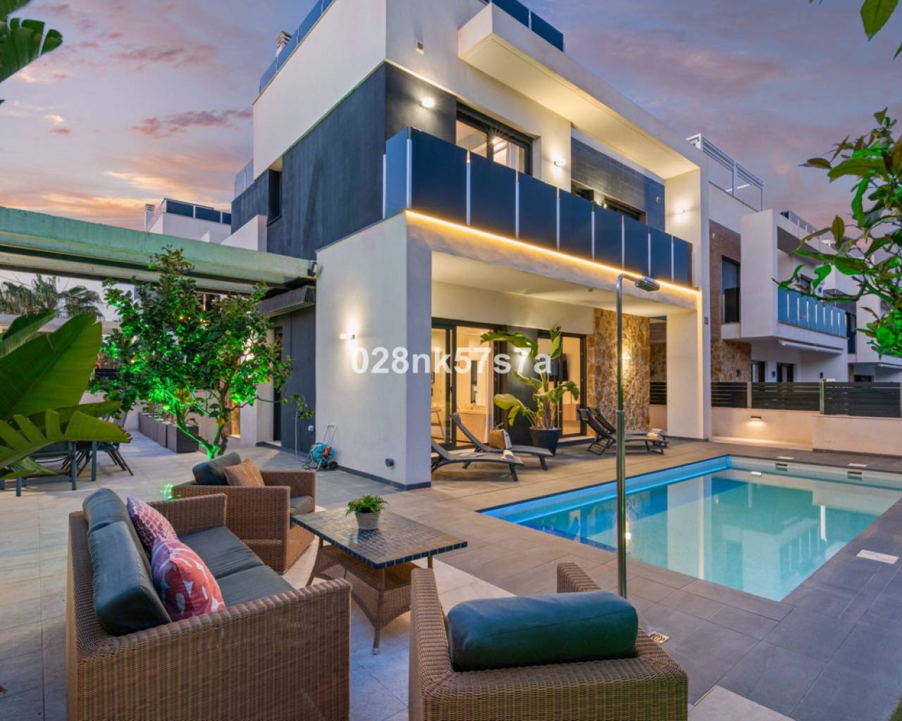 Esta moderna villa, terminada en 2019, se encuentra en la cotizada zona de Lomas de Cabo Roig. Gracias a su orientación sur, la propiedad disfruta del sol en la piscina y el jardín desde primera hora de la mañana hasta última hora de la tarde. La villa se encuentra en una parcela esquinera que ofrece amplias zonas exteriores. Al entrar en la propiedad, encontramos una piscina privada rodeada de amplio espacio para tumbonas, una zona de estar y un comedor exterior. Su ubicación esquinera garantiza sol durante todo el día, lo que la convierte en el lugar perfecto para disfrutar del estilo de vida mediterráneo. En el interior, la casa se distribuye en varias plantas, diseñadas para combinar comodidad y modernidad. La planta principal cuenta con un luminoso salón-comedor con cocina americana. Los amplios ventanales correderos y el techo de doble altura crean una sensación de amplitud y luminosidad. En esta planta también se encuentran un dormitorio y un baño con ducha. En la primera planta, se encuentran dos amplios dormitorios, cada uno con su propio baño, además de acceso directo a una soleada terraza. Desde aquí, una escalera conduce al impresionante solárium de 60 m²: un espacio privado y protegido para disfrutar del sol y relajarse con la familia o los amigos durante todo el año. El semisótano ofrece un cuarto dormitorio, además de una amplia sala de estar y un baño completo. Esta planta ofrece mucha flexibilidad y es especialmente adecuada para familias. Con su diseño contemporáneo, excelente orientación solar, piscina privada y amplios espacios interiores y exteriores, esta villa representa una magnífica oportunidad para adquirir una vivienda moderna en una de las zonas más atractivas de la Costa Blanca.