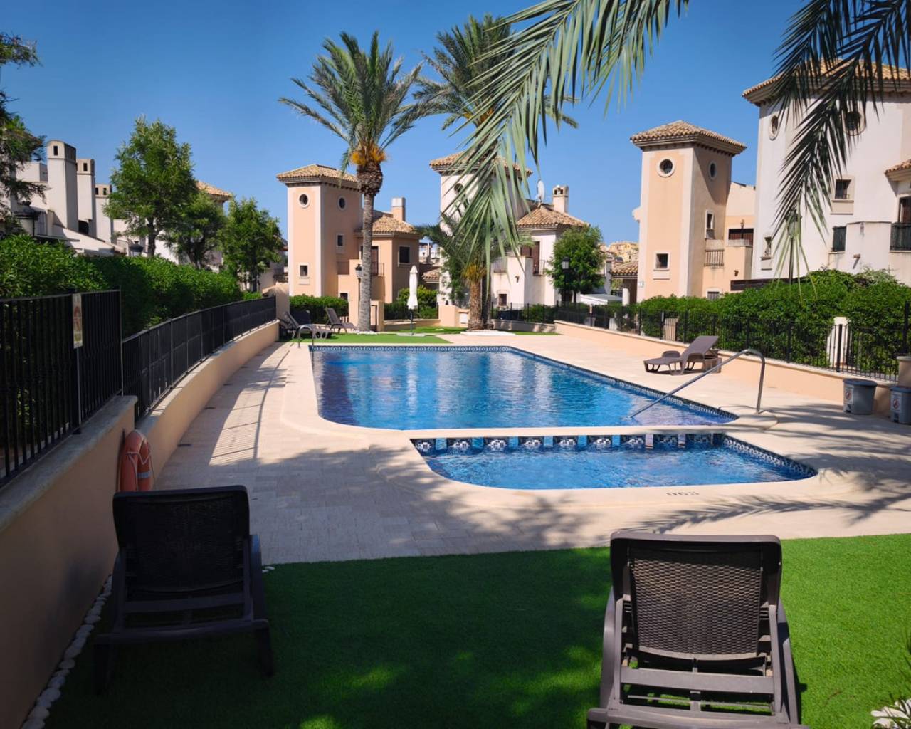Bungalow pareado en Conjunto Residencial. Tiene un jardína suentrada con posibilidad de parking y en la parte de atrás dispone de porche con barbacoa que daacceso al salón de la casa. La vivienda tiene en planta bajasalón con chimenea, habitación conarmario empotrado, aseocon duchay cocina con galería. En planta primera tieneun baño completo ydos habitacionescon armarios empotrados,una de ellas con balcóny la otra con una hermosaterraza. En la última planta hayuna terraza-solariumcon vistas despejadas. La urbanización tienepiscina comunitaria y el bungalow está recién pintado y listo para entrar a vivir.