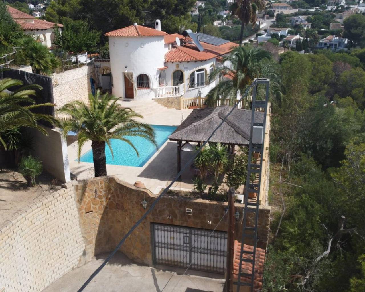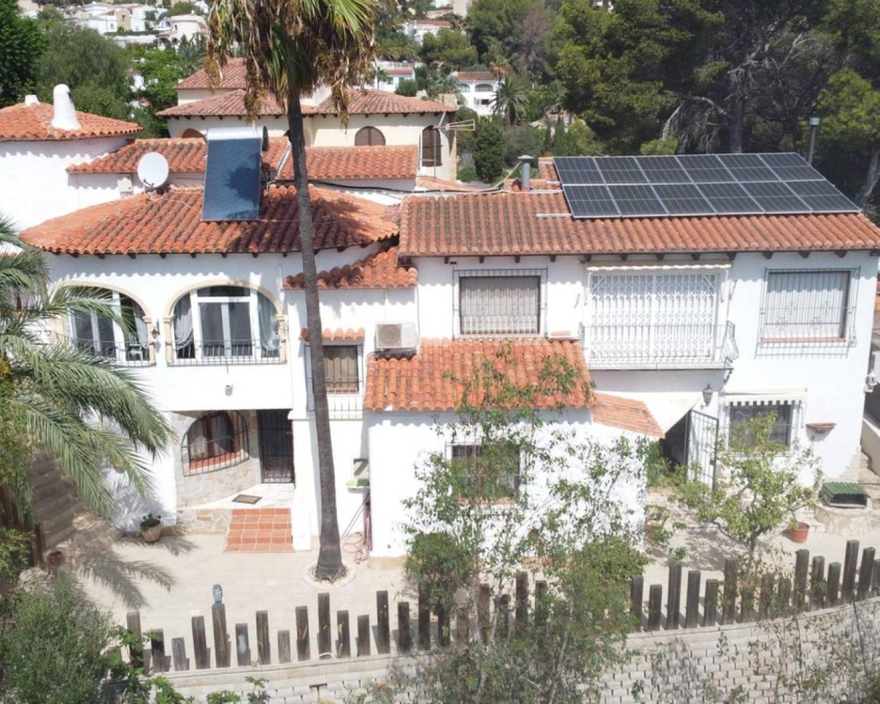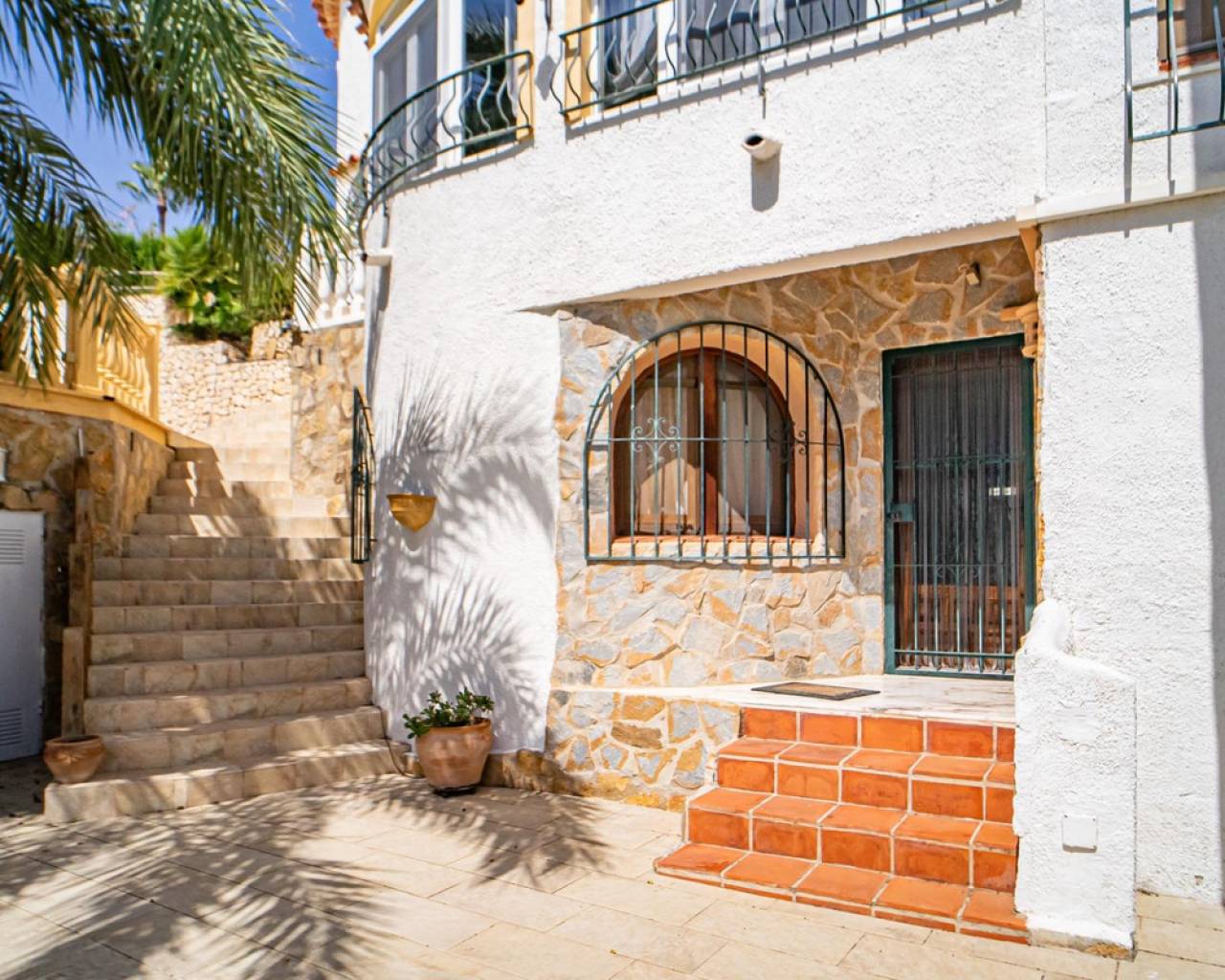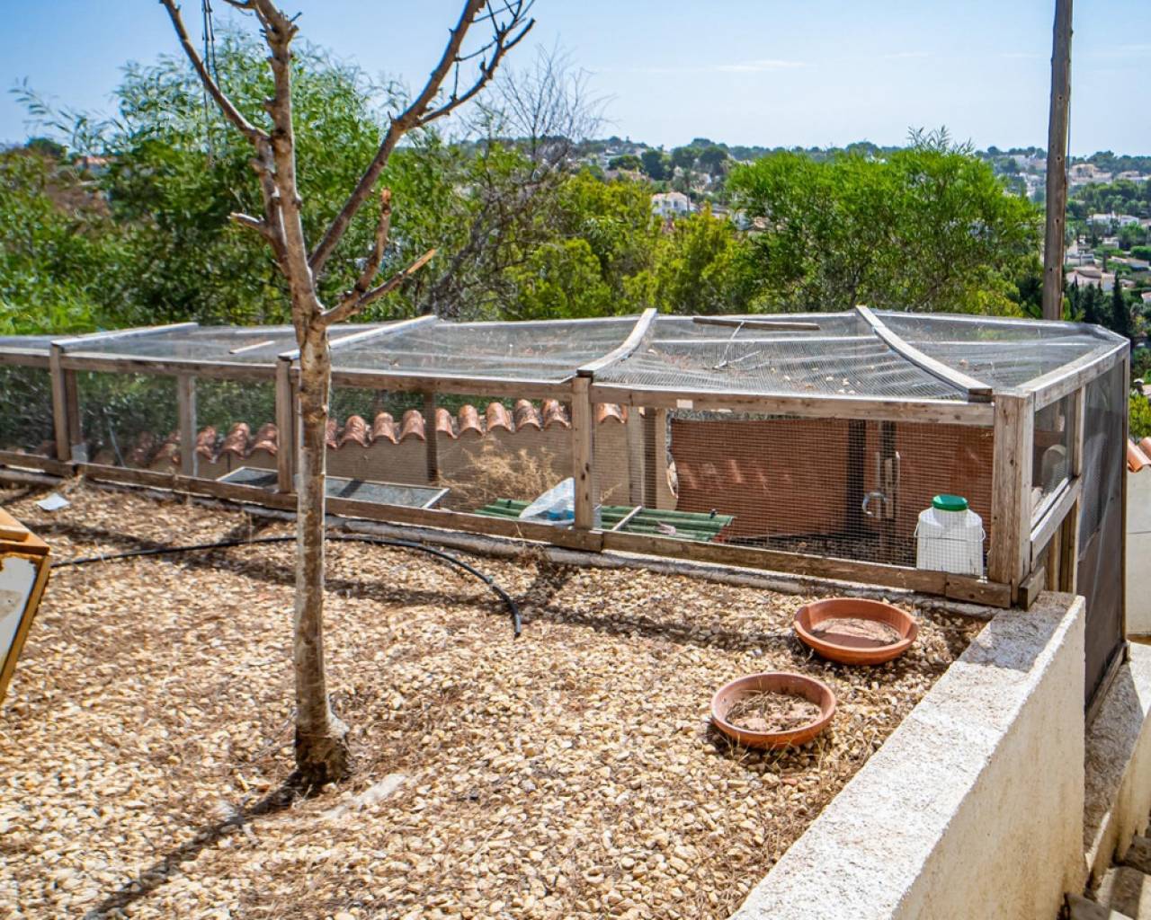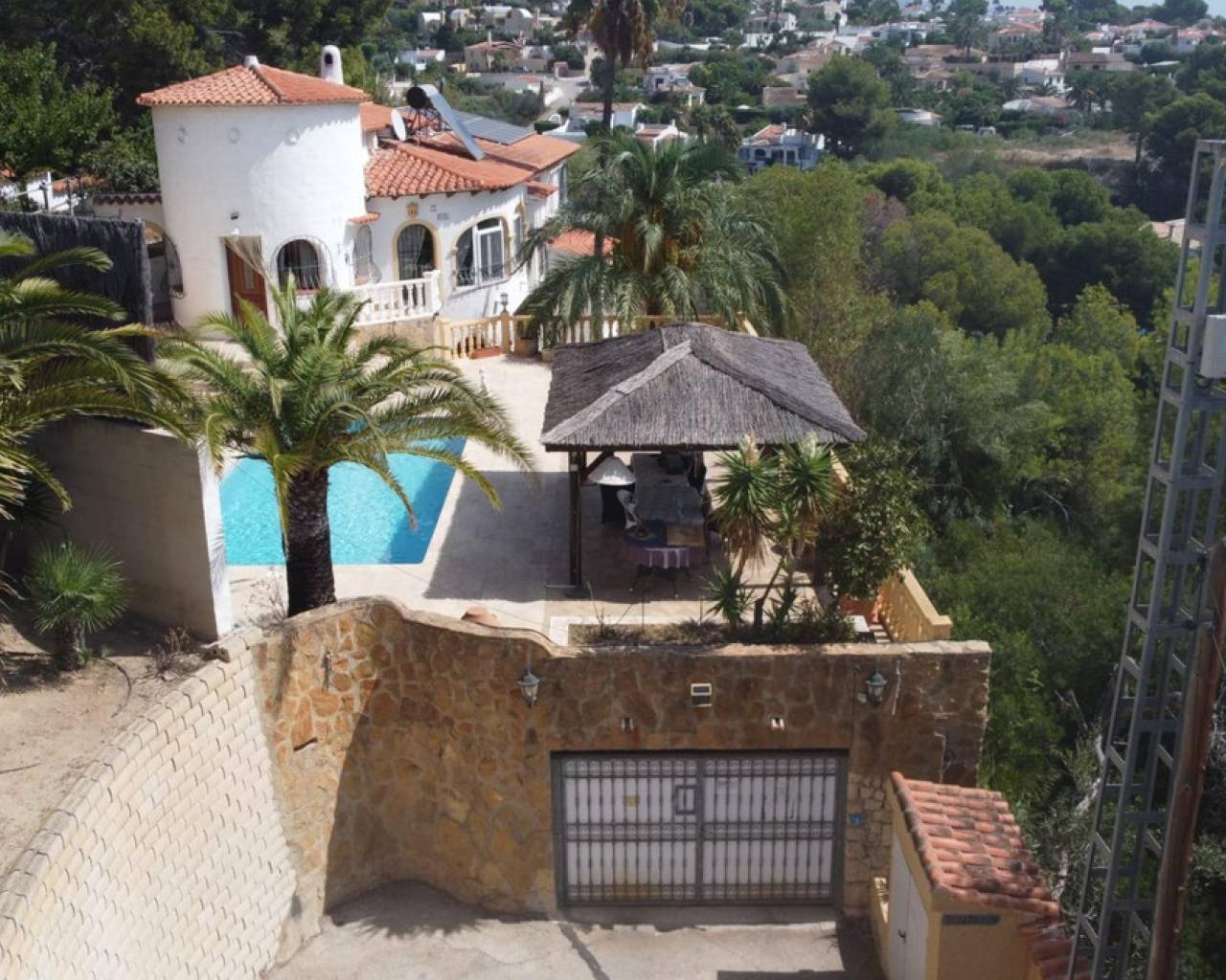 Este chalet situado al final de una calle tiene su entrada a través de un garaje grande de 93 m2, con dos trasteros amplios y cargador para un coche eléctrico. El chalet tiene dos entradas, lo que es práctico si se tienen invitados, ya que en cada planta hay dormitorios y baños. En la planta principal hay dos salones, uno grande con chimenea, y otro con muchas ventanas y vistas al mar. En esta planta está la cocina, un aseo y un dormitorio principal muy grande y con mucha personalidad, armarios empotrados, un jacuzzi, chimenea y un balcón con vistas al mar y montaña. En la planta bajo la principal, conectadas por una escalera, hay un baño completo y dos dormitorios amplios. La propiedad dispone también de un apartamento de invitados con su propia entrada y un baño completo. En el jardín que rodea la casa hay una zona de piscina con vistas al mar, una pérgola grande y una barbacoa. En la parte trasera de la vivienda hay una sauna. La casa tiene varios aparatos de aire acondicionado, placas solares, mucha privacidad y ofrece muchas posibilidades. Moraira está tan solo a 10 minutos en coche y Calpe a unos 20.
