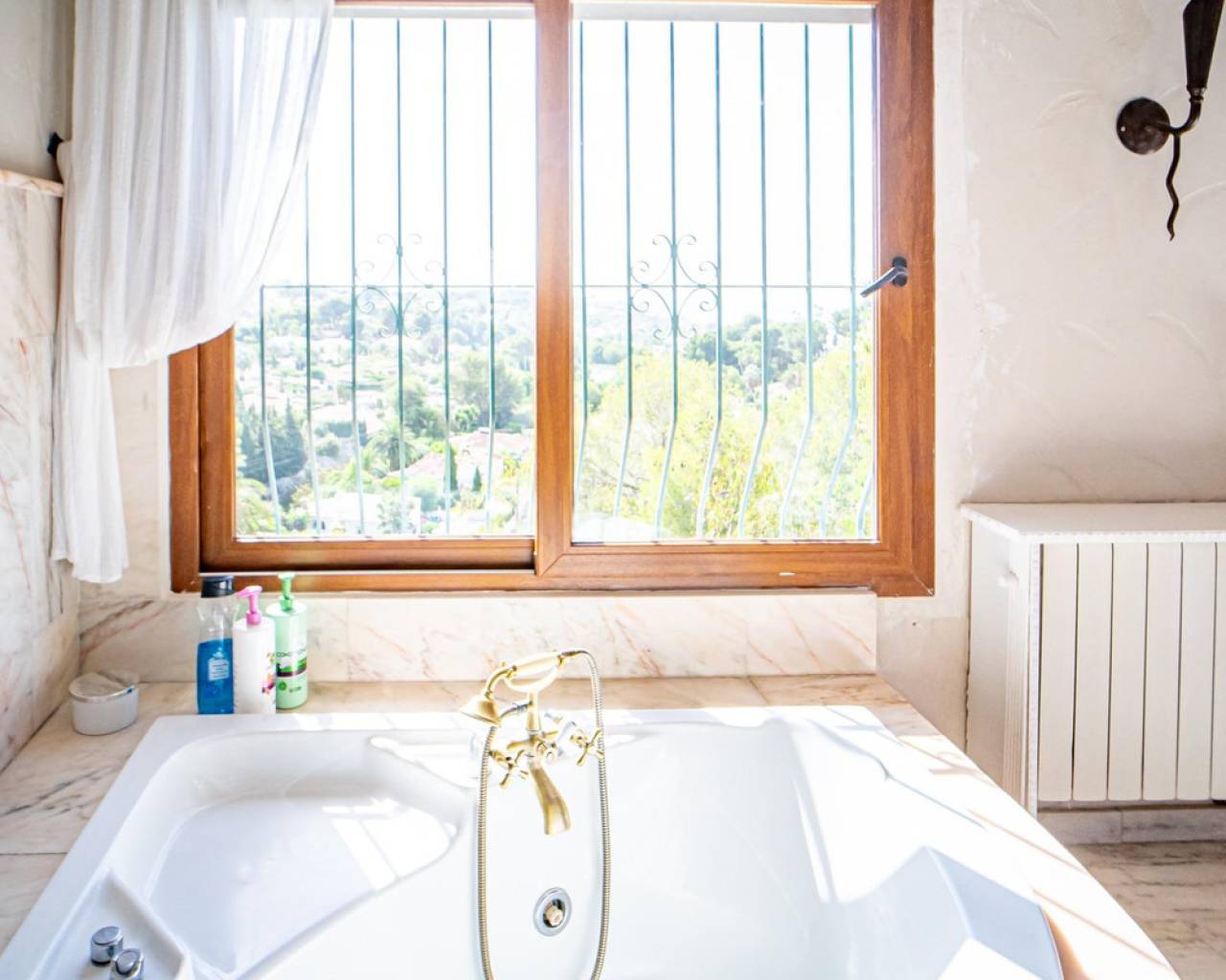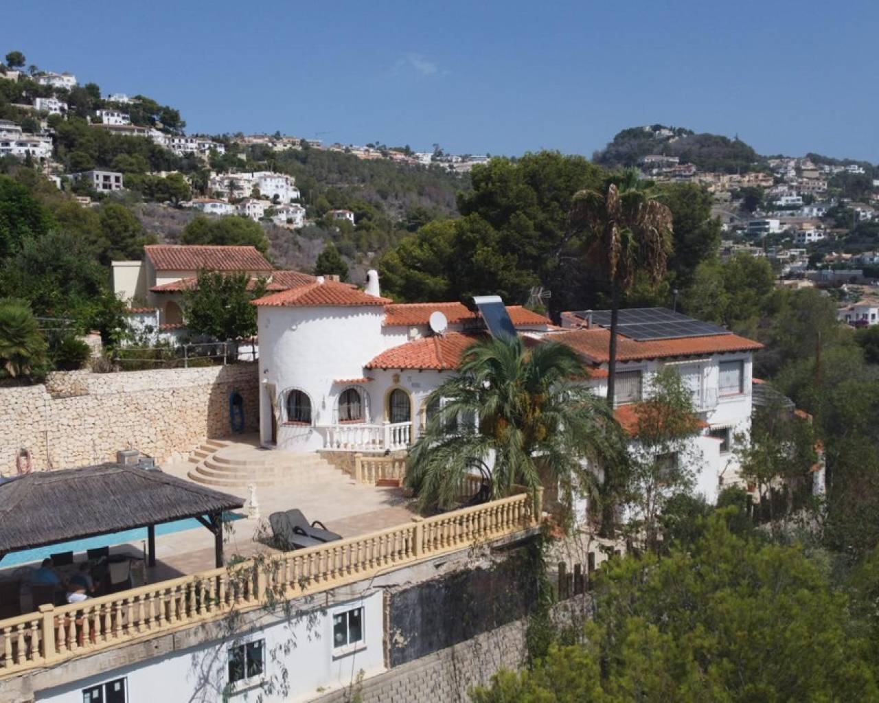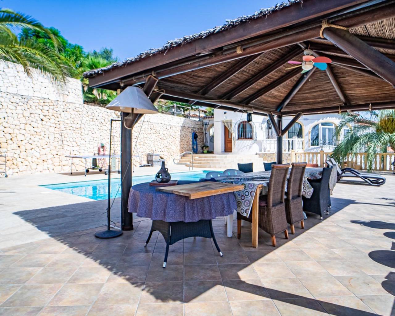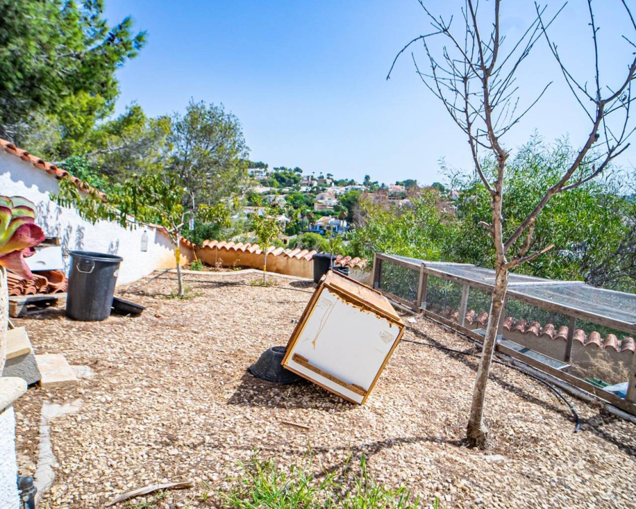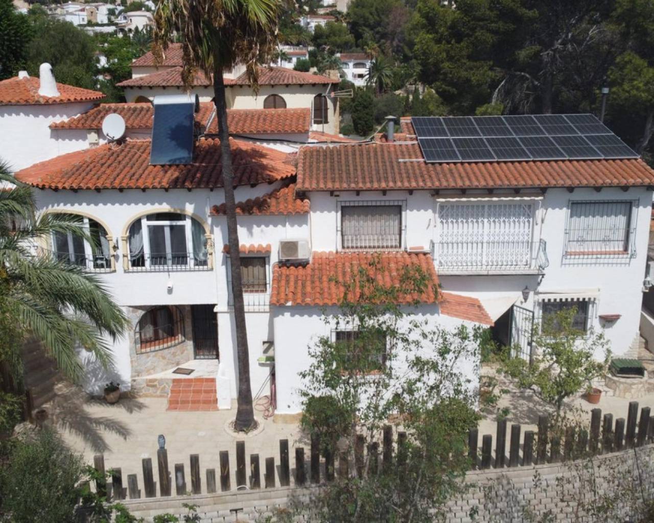 Este chalet situado al final de una calle tiene su entrada a través de un garaje grande de 93 m2, con dos trasteros amplios y cargador para un coche eléctrico. El chalet tiene dos entradas, lo que es práctico si se tienen invitados, ya que en cada planta hay dormitorios y baños. En la planta principal hay dos salones, uno grande con chimenea, y otro con muchas ventanas y vistas al mar. En esta planta está la cocina, un aseo y un dormitorio principal muy grande y con mucha personalidad, armarios empotrados, un jacuzzi, chimenea y un balcón con vistas al mar y montaña. En la planta bajo la principal, conectadas por una escalera, hay un baño completo y dos dormitorios amplios. La propiedad dispone también de un apartamento de invitados con su propia entrada y un baño completo. En el jardín que rodea la casa hay una zona de piscina con vistas al mar, una pérgola grande y una barbacoa. En la parte trasera de la vivienda hay una sauna. La casa tiene varios aparatos de aire acondicionado, placas solares, mucha privacidad y ofrece muchas posibilidades. Moraira está tan solo a 10 minutos en coche y Calpe a unos 20.
