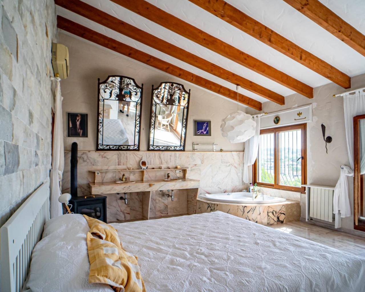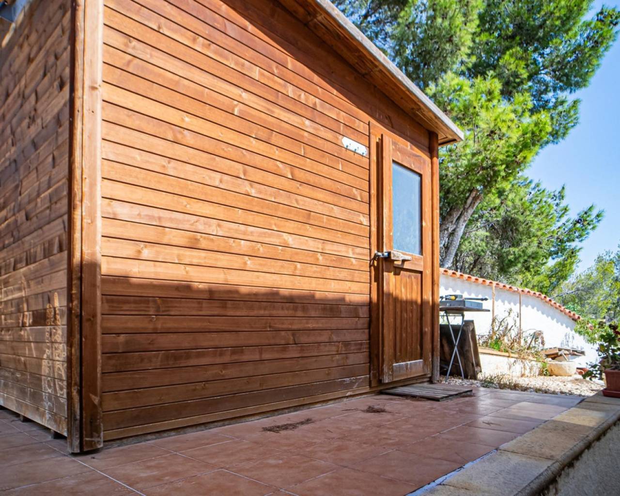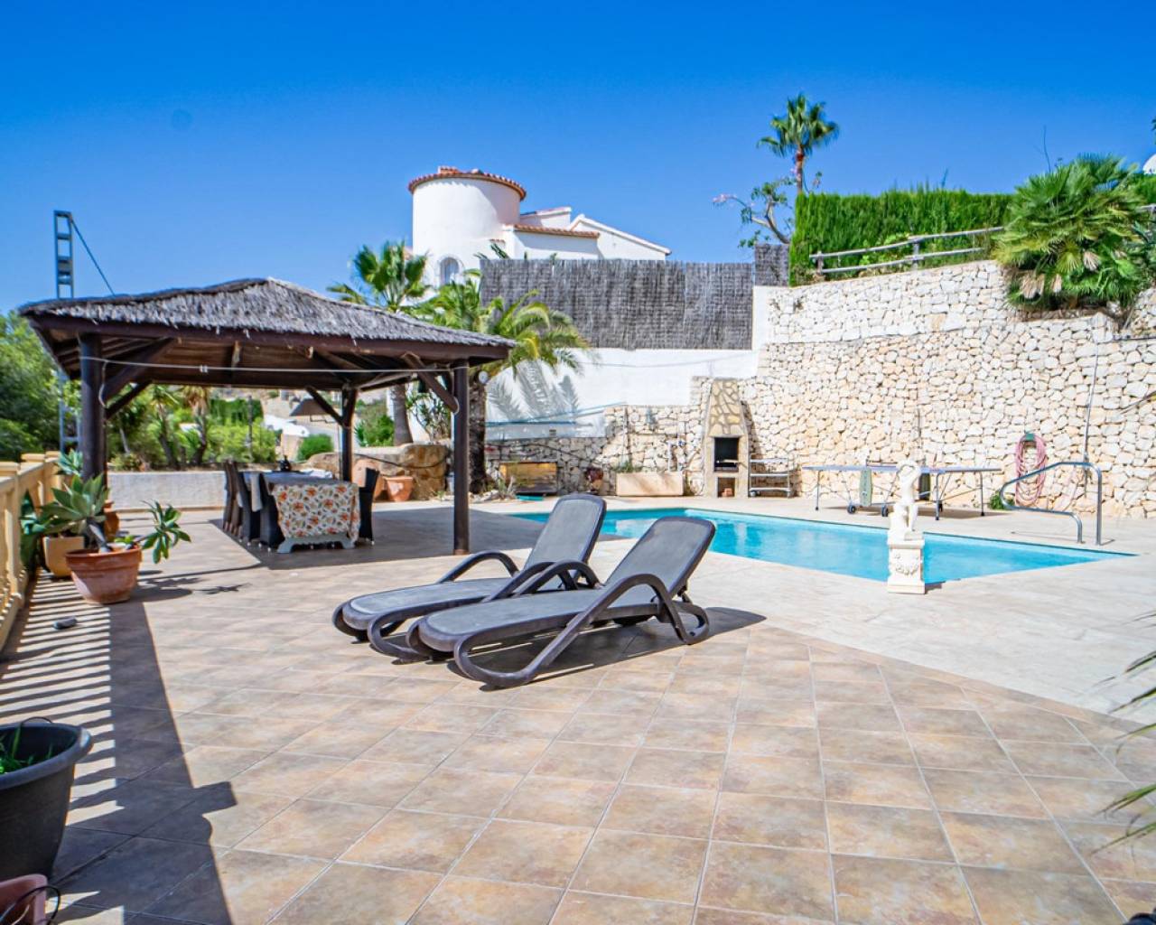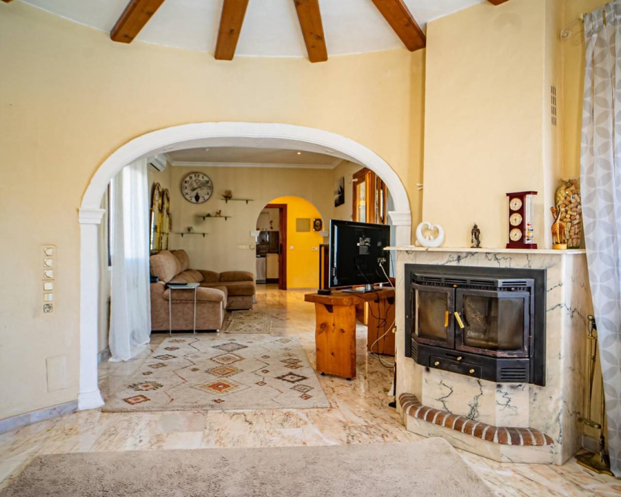 Este chalet situado al final de una calle tiene su entrada a través de un garaje grande de 93 m2, con dos trasteros amplios y cargador para un coche eléctrico. El chalet tiene dos entradas, lo que es práctico si se tienen invitados, ya que en cada planta hay dormitorios y baños. En la planta principal hay dos salones, uno grande con chimenea, y otro con muchas ventanas y vistas al mar. En esta planta está la cocina, un aseo y un dormitorio principal muy grande y con mucha personalidad, armarios empotrados, un jacuzzi, chimenea y un balcón con vistas al mar y montaña. En la planta bajo la principal, conectadas por una escalera, hay un baño completo y dos dormitorios amplios. La propiedad dispone también de un apartamento de invitados con su propia entrada y un baño completo. En el jardín que rodea la casa hay una zona de piscina con vistas al mar, una pérgola grande y una barbacoa. En la parte trasera de la vivienda hay una sauna. La casa tiene varios aparatos de aire acondicionado, placas solares, mucha privacidad y ofrece muchas posibilidades. Moraira está tan solo a 10 minutos en coche y Calpe a unos 20.