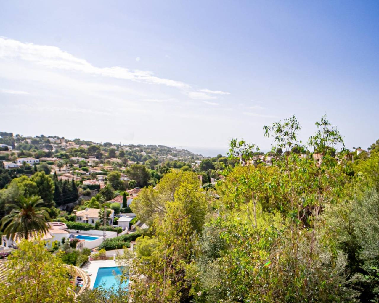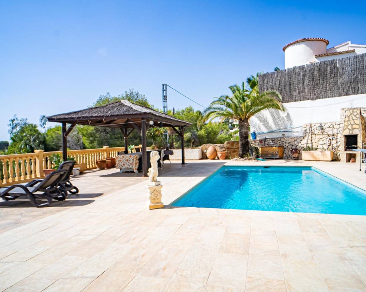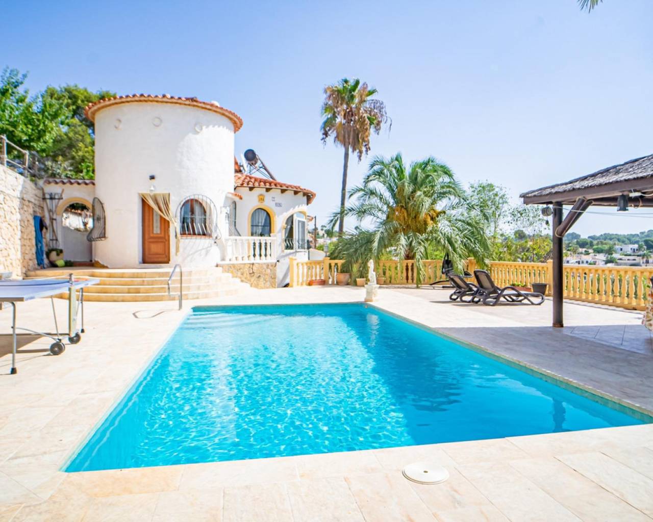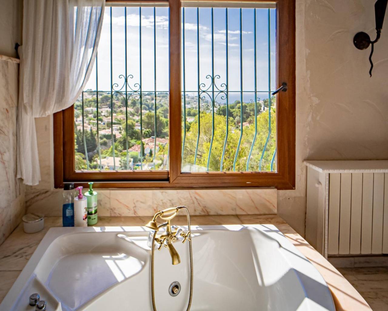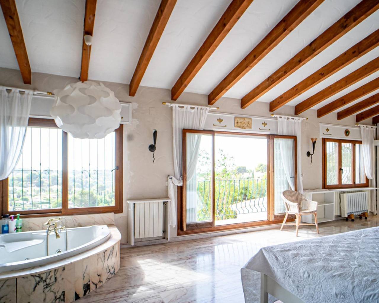 Este chalet situado al final de una calle tiene su entrada a través de un garaje grande de 93 m2, con dos trasteros amplios y cargador para un coche eléctrico. El chalet tiene dos entradas, lo que es práctico si se tienen invitados, ya que en cada planta hay dormitorios y baños. En la planta principal hay dos salones, uno grande con chimenea, y otro con muchas ventanas y vistas al mar. En esta planta está la cocina, un aseo y un dormitorio principal muy grande y con mucha personalidad, armarios empotrados, un jacuzzi, chimenea y un balcón con vistas al mar y montaña. En la planta bajo la principal, conectadas por una escalera, hay un baño completo y dos dormitorios amplios. La propiedad dispone también de un apartamento de invitados con su propia entrada y un baño completo. En el jardín que rodea la casa hay una zona de piscina con vistas al mar, una pérgola grande y una barbacoa. En la parte trasera de la vivienda hay una sauna. La casa tiene varios aparatos de aire acondicionado, placas solares, mucha privacidad y ofrece muchas posibilidades. Moraira está tan solo a 10 minutos en coche y Calpe a unos 20.