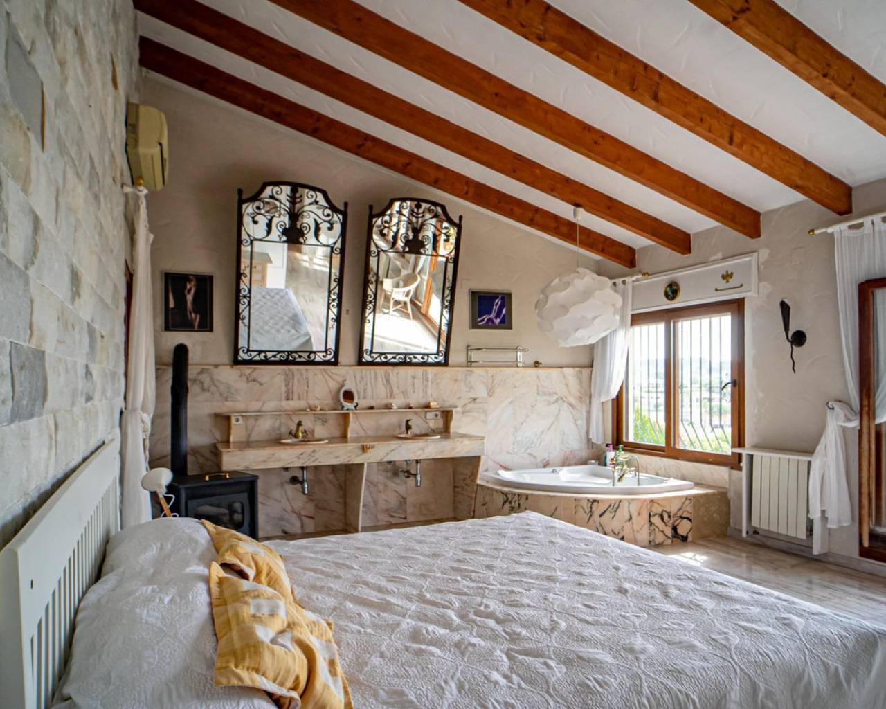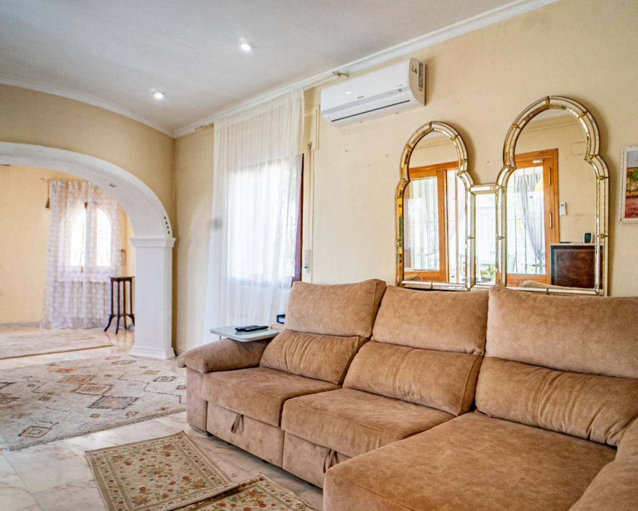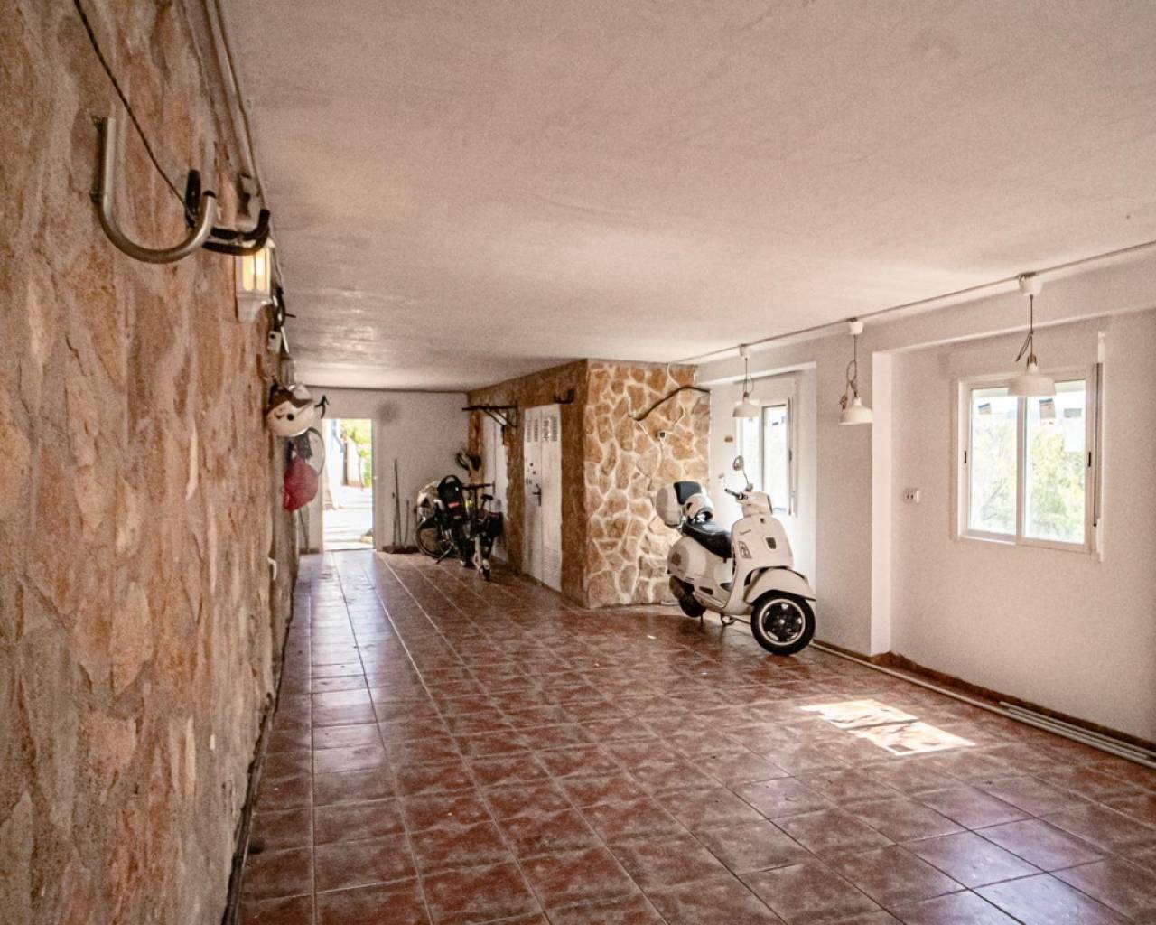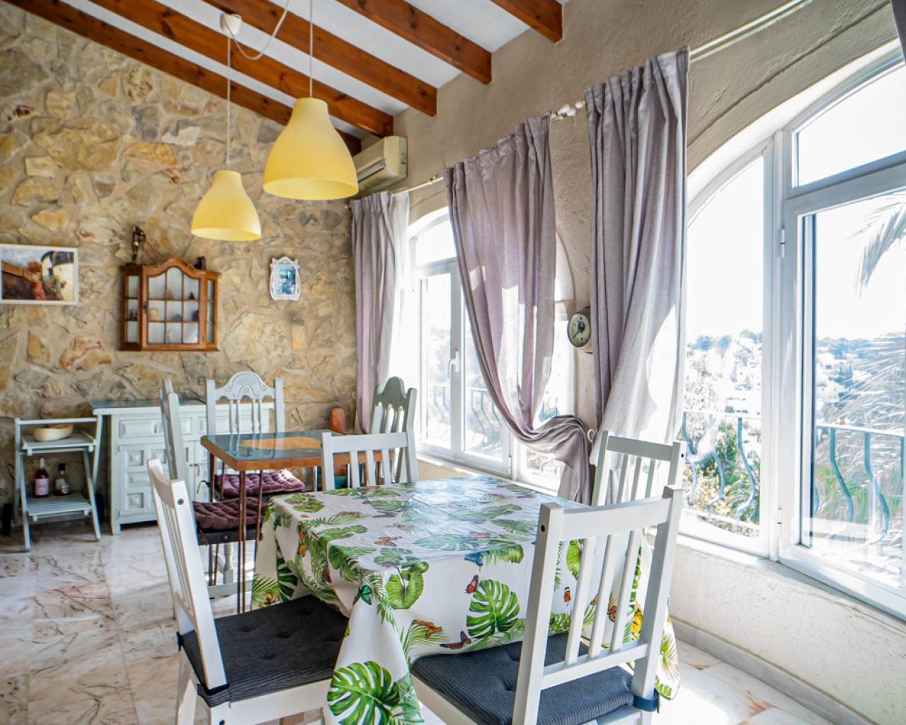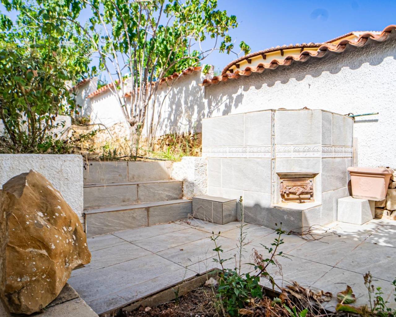 Este chalet situado al final de una calle tiene su entrada a través de un garaje grande de 93 m2, con dos trasteros amplios y cargador para un coche eléctrico. El chalet tiene dos entradas, lo que es práctico si se tienen invitados, ya que en cada planta hay dormitorios y baños. En la planta principal hay dos salones, uno grande con chimenea, y otro con muchas ventanas y vistas al mar. En esta planta está la cocina, un aseo y un dormitorio principal muy grande y con mucha personalidad, armarios empotrados, un jacuzzi, chimenea y un balcón con vistas al mar y montaña. En la planta bajo la principal, conectadas por una escalera, hay un baño completo y dos dormitorios amplios. La propiedad dispone también de un apartamento de invitados con su propia entrada y un baño completo. En el jardín que rodea la casa hay una zona de piscina con vistas al mar, una pérgola grande y una barbacoa. En la parte trasera de la vivienda hay una sauna. La casa tiene varios aparatos de aire acondicionado, placas solares, mucha privacidad y ofrece muchas posibilidades. Moraira está tan solo a 10 minutos en coche y Calpe a unos 20.