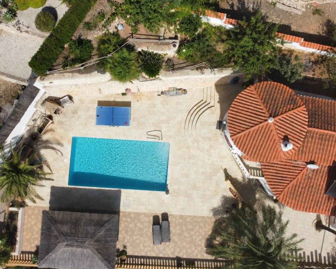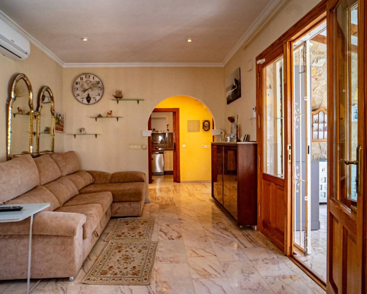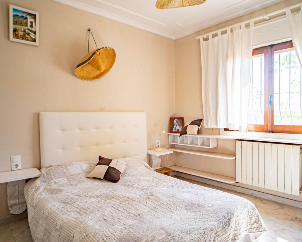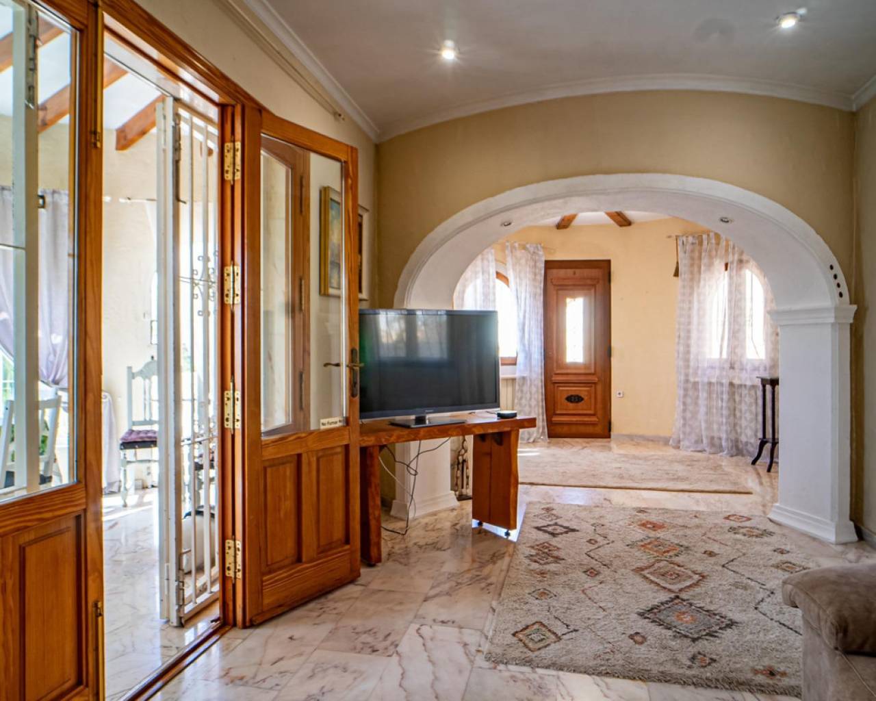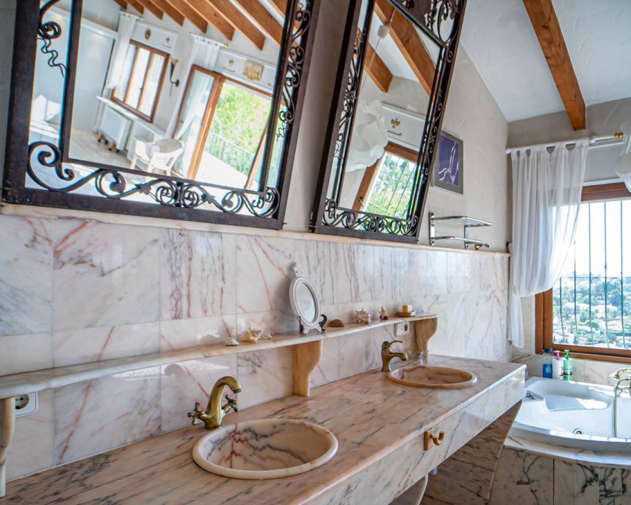 Este chalet situado al final de una calle tiene su entrada a través de un garaje grande de 93 m2, con dos trasteros amplios y cargador para un coche eléctrico. El chalet tiene dos entradas, lo que es práctico si se tienen invitados, ya que en cada planta hay dormitorios y baños. En la planta principal hay dos salones, uno grande con chimenea, y otro con muchas ventanas y vistas al mar. En esta planta está la cocina, un aseo y un dormitorio principal muy grande y con mucha personalidad, armarios empotrados, un jacuzzi, chimenea y un balcón con vistas al mar y montaña. En la planta bajo la principal, conectadas por una escalera, hay un baño completo y dos dormitorios amplios. La propiedad dispone también de un apartamento de invitados con su propia entrada y un baño completo. En el jardín que rodea la casa hay una zona de piscina con vistas al mar, una pérgola grande y una barbacoa. En la parte trasera de la vivienda hay una sauna. La casa tiene varios aparatos de aire acondicionado, placas solares, mucha privacidad y ofrece muchas posibilidades. Moraira está tan solo a 10 minutos en coche y Calpe a unos 20.