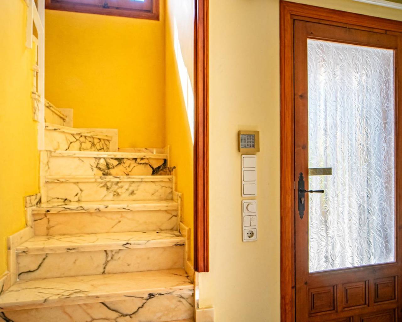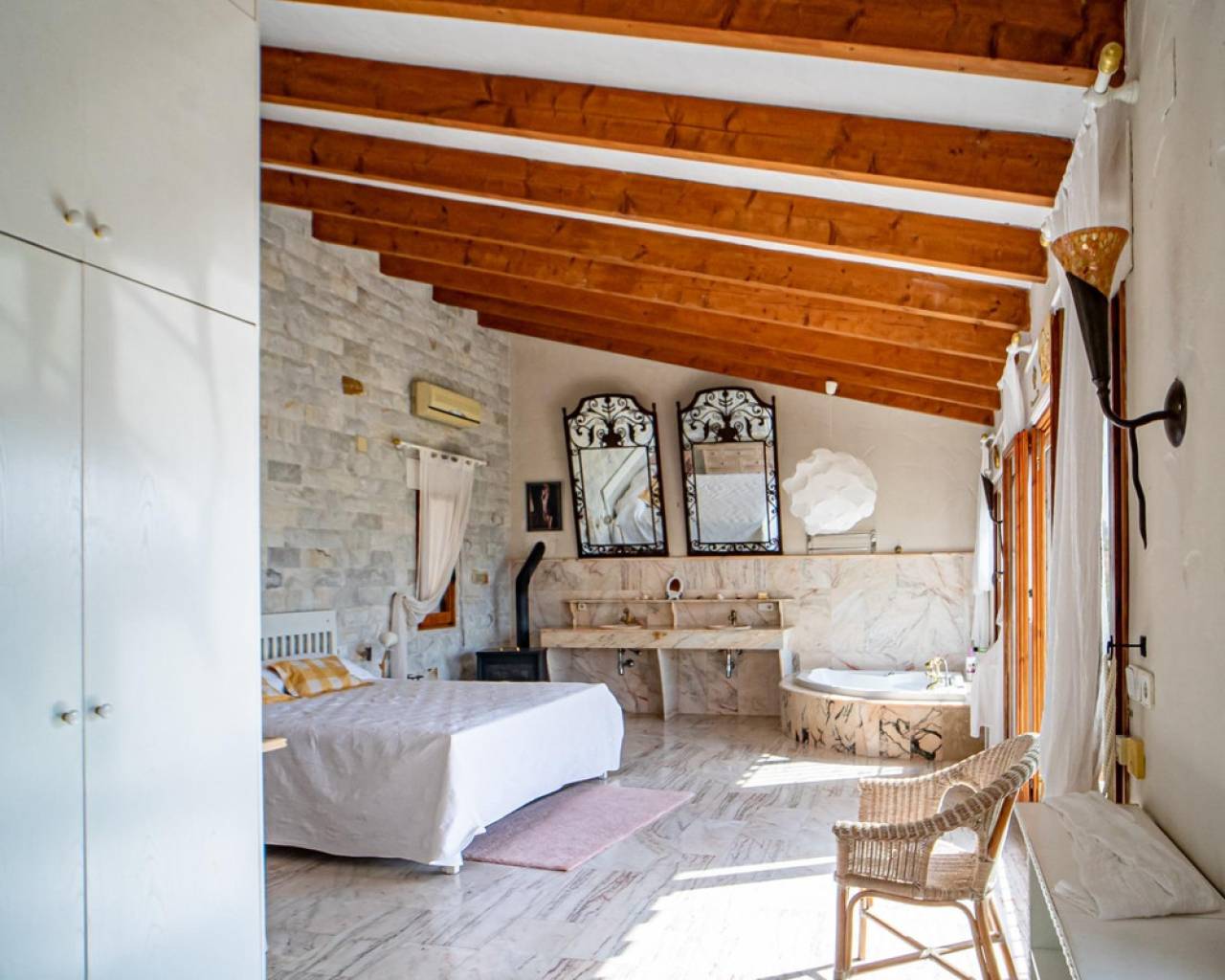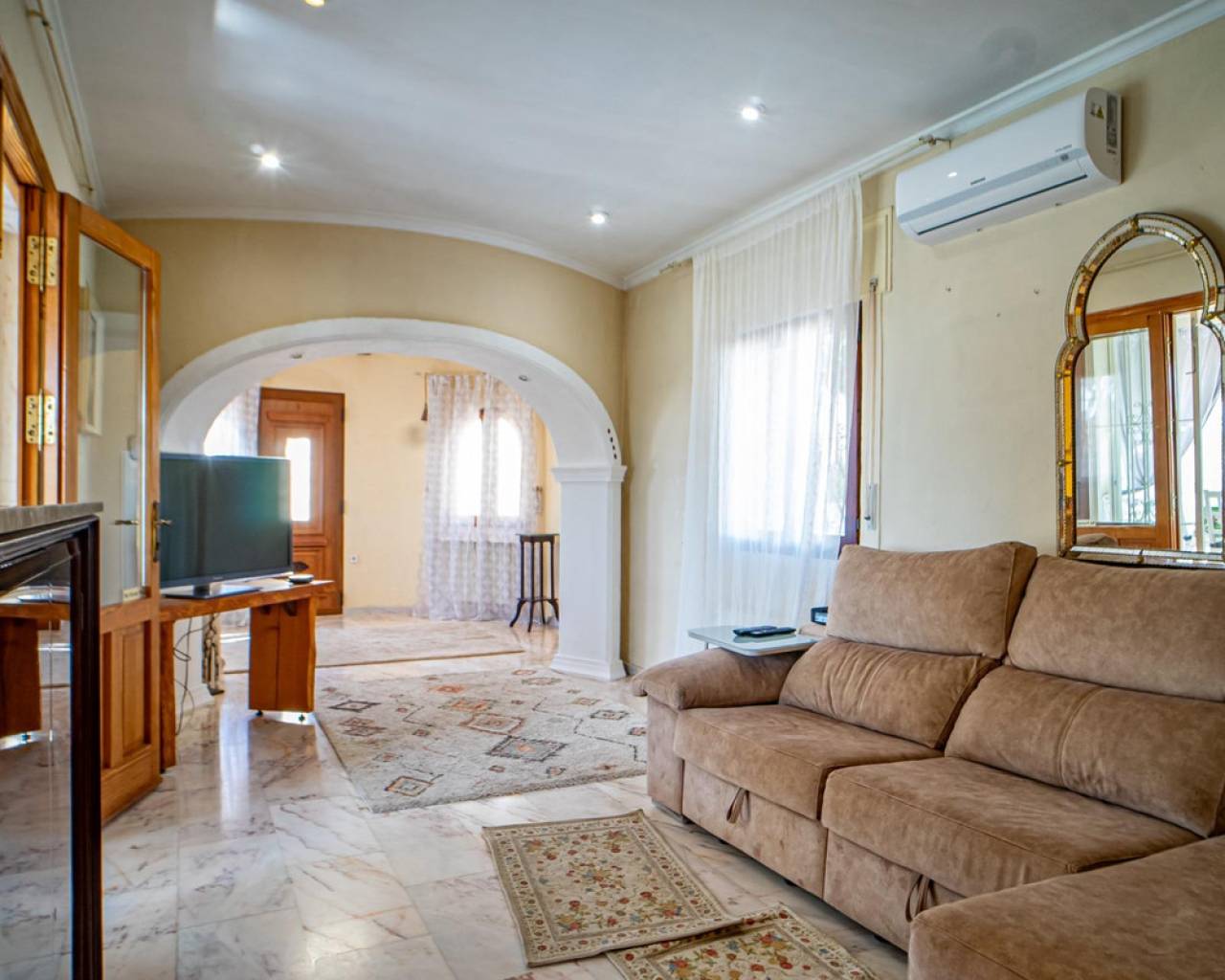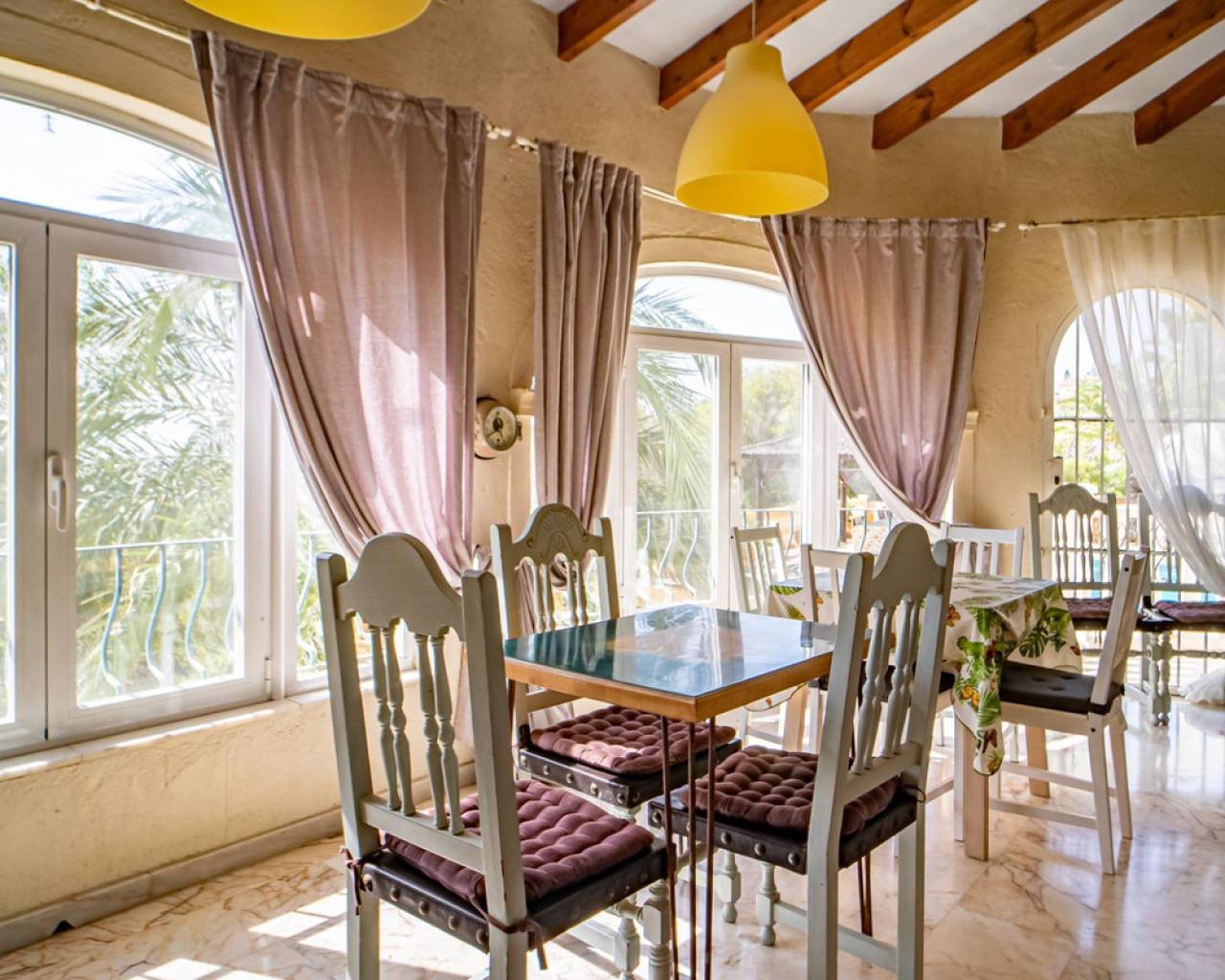 Este chalet situado al final de una calle tiene su entrada a través de un garaje grande de 93 m2, con dos trasteros amplios y cargador para un coche eléctrico. El chalet tiene dos entradas, lo que es práctico si se tienen invitados, ya que en cada planta hay dormitorios y baños. En la planta principal hay dos salones, uno grande con chimenea, y otro con muchas ventanas y vistas al mar. En esta planta está la cocina, un aseo y un dormitorio principal muy grande y con mucha personalidad, armarios empotrados, un jacuzzi, chimenea y un balcón con vistas al mar y montaña. En la planta bajo la principal, conectadas por una escalera, hay un baño completo y dos dormitorios amplios. La propiedad dispone también de un apartamento de invitados con su propia entrada y un baño completo. En el jardín que rodea la casa hay una zona de piscina con vistas al mar, una pérgola grande y una barbacoa. En la parte trasera de la vivienda hay una sauna. La casa tiene varios aparatos de aire acondicionado, placas solares, mucha privacidad y ofrece muchas posibilidades. Moraira está tan solo a 10 minutos en coche y Calpe a unos 20.