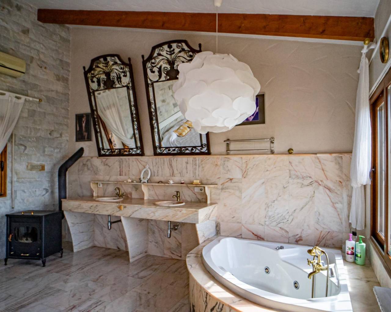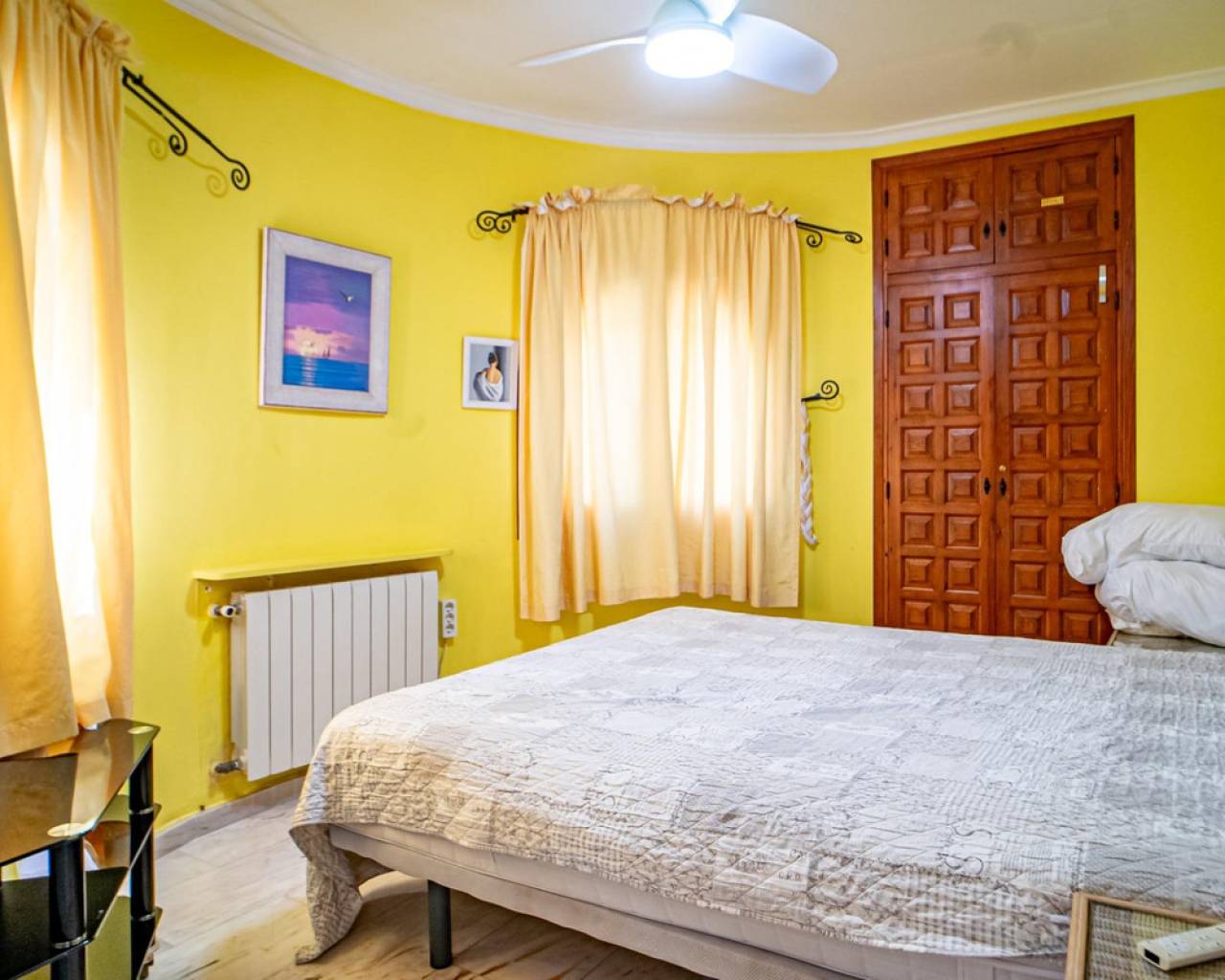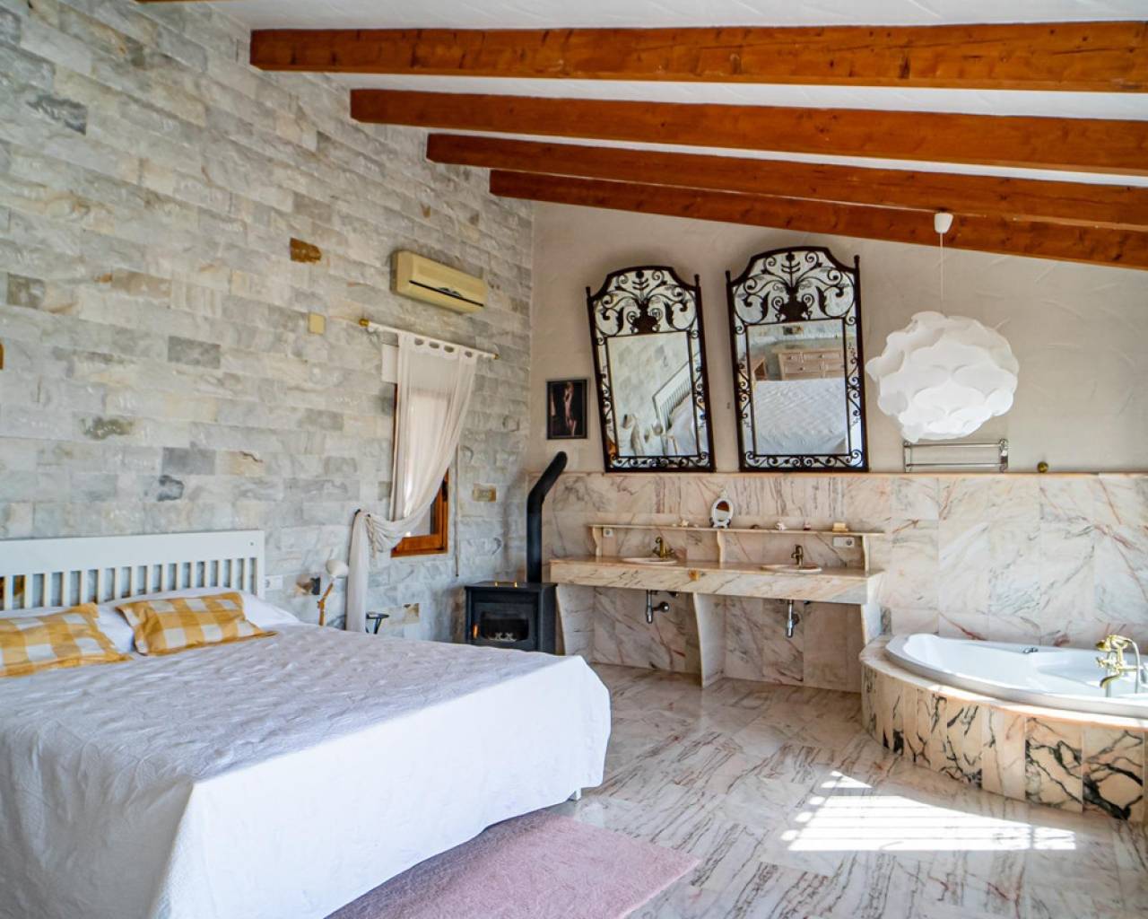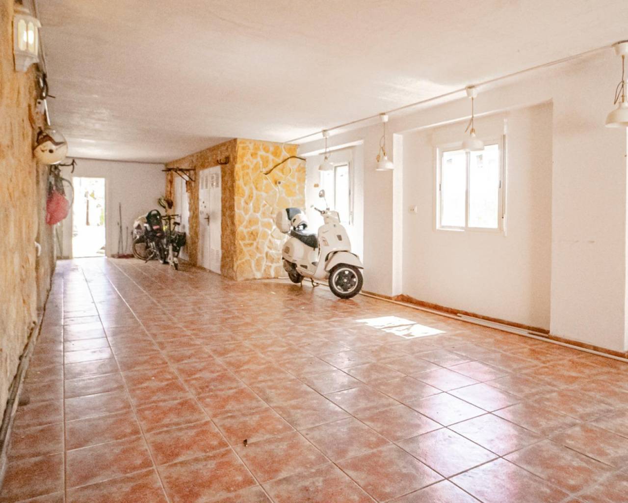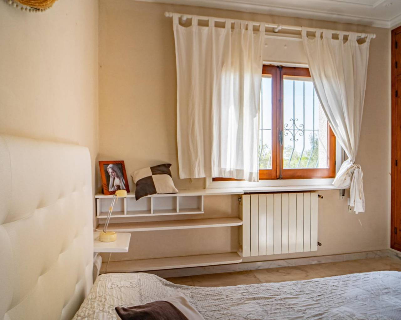 Este chalet situado al final de una calle tiene su entrada a través de un garaje grande de 93 m2, con dos trasteros amplios y cargador para un coche eléctrico. El chalet tiene dos entradas, lo que es práctico si se tienen invitados, ya que en cada planta hay dormitorios y baños. En la planta principal hay dos salones, uno grande con chimenea, y otro con muchas ventanas y vistas al mar. En esta planta está la cocina, un aseo y un dormitorio principal muy grande y con mucha personalidad, armarios empotrados, un jacuzzi, chimenea y un balcón con vistas al mar y montaña. En la planta bajo la principal, conectadas por una escalera, hay un baño completo y dos dormitorios amplios. La propiedad dispone también de un apartamento de invitados con su propia entrada y un baño completo. En el jardín que rodea la casa hay una zona de piscina con vistas al mar, una pérgola grande y una barbacoa. En la parte trasera de la vivienda hay una sauna. La casa tiene varios aparatos de aire acondicionado, placas solares, mucha privacidad y ofrece muchas posibilidades. Moraira está tan solo a 10 minutos en coche y Calpe a unos 20.