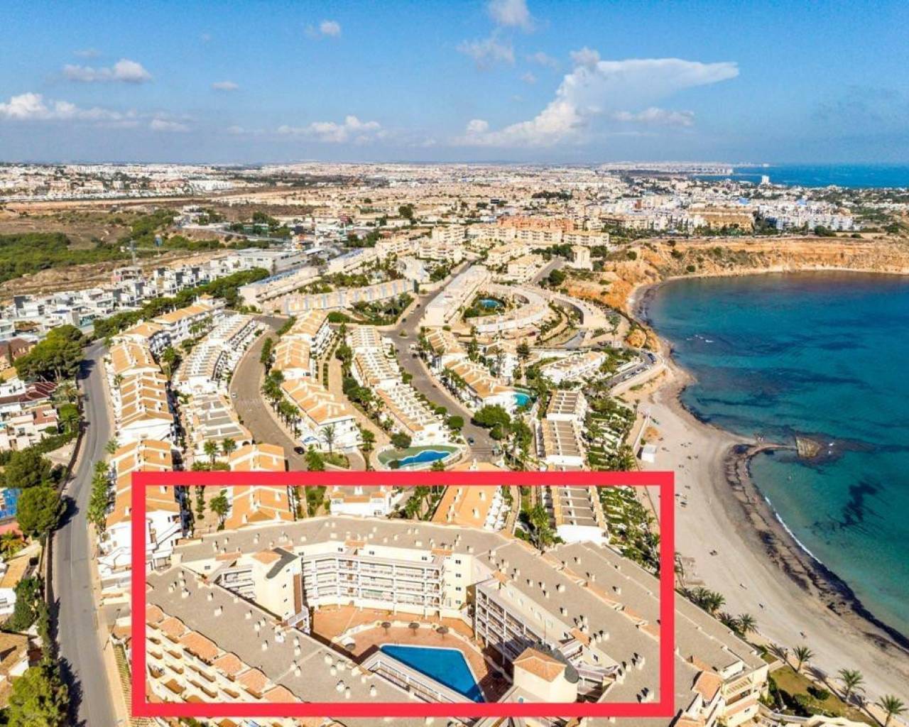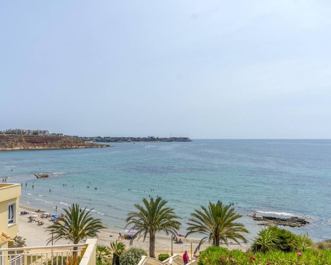 Fantástico Apartamento con vistas panorámicas al mar en primera línea. Planta segunda , orientación sur. El apartamento de 91m2, cuenta con tres dormitorios, dos baños completos (uno en suite), cocina independiente, equipada, salón-comedor y la terraza de unos 15m2. A/A en el salón. Se vende parcialmente amueblado. El residencial con piscina se encuentra justo encima de la playa de Aguamarina y de Campoamor, con accesos privados directos a la playa. El apartamento dispone de plaza de parking y trastero.