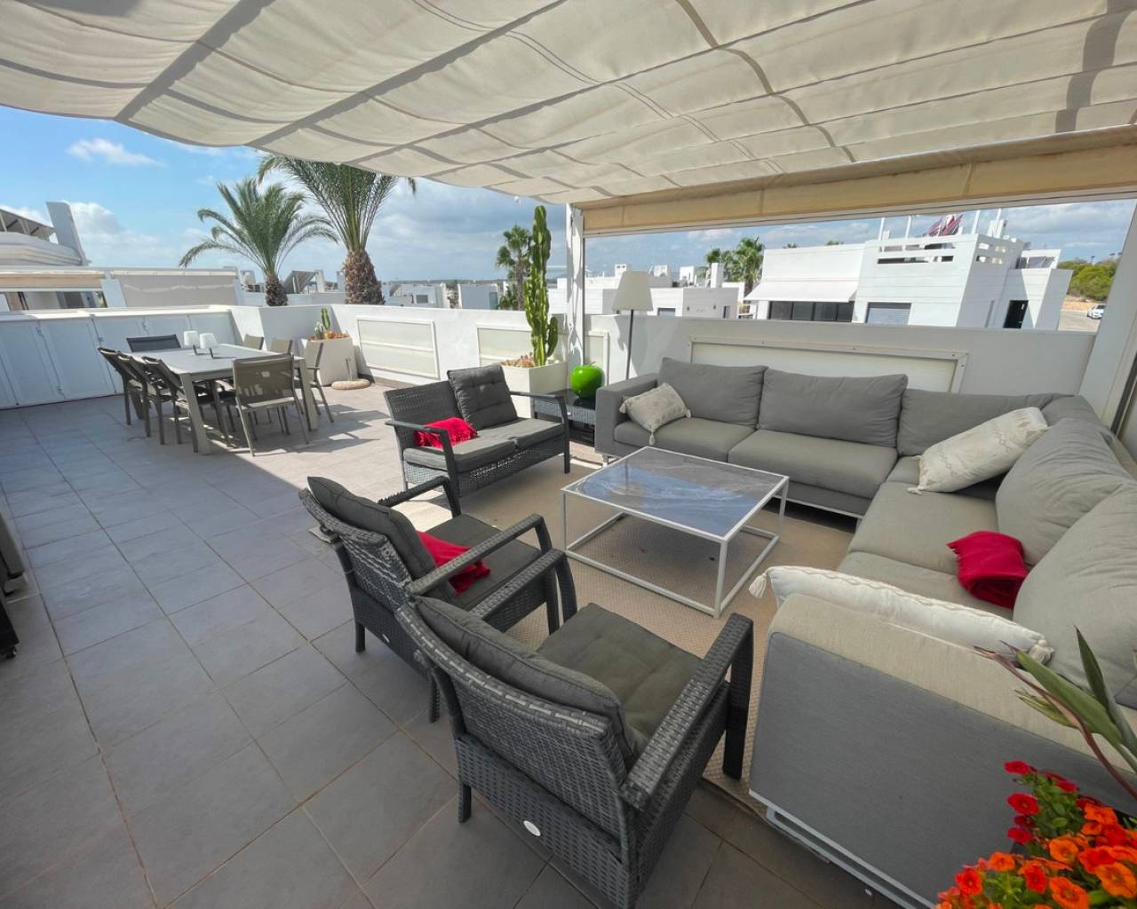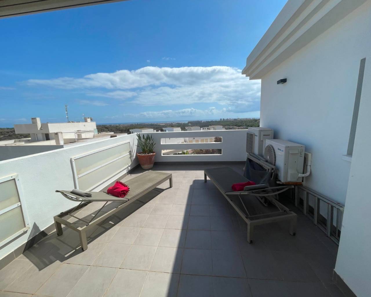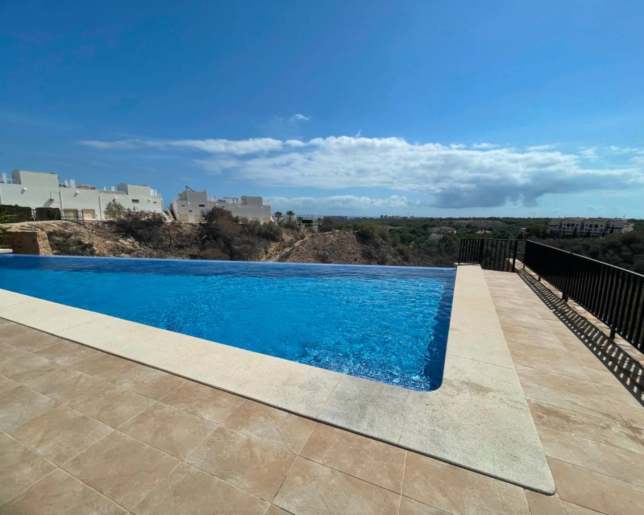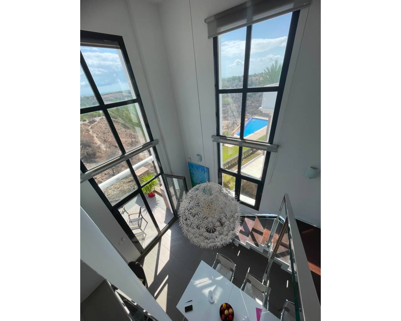 Este ático dúplex de tres dormitorios con orientación sureste en Las Ramblas Golf se encuentra junto a este prestigioso campo de golf, lindando también con Campoamor Golf. A un corto trayecto en coche se encuentran Villamartín, el popular centro comercial La Zenia Boulevard y las hermosas playas de Orihuela Costa, a unos 10 minutos. Esta impresionante casa de diseño arquitectónico moderno ofrece 97 m² distribuidos en dos plantas, con una ubicación elevada y vistas increíbles, pero con acceso cómodo a la sala de estar principal desde la planta baja. El luminoso salón-comedor cuenta con dos puertas correderas acristaladas que dan a la terraza, con una parte de la estancia con techo abovedado y una escalera abierta ultramoderna que permite apreciar plenamente las espectaculares vistas abiertas a través del ventanal de suelo a techo. Una cocina bien equipada con barra americana, dos dormitorios dobles y un baño familiar con ducha completan esta planta. La primera planta alberga el dormitorio principal con baño en suite y acceso directo a una impresionante terraza en forma de L, equipada con toldo retráctil y prácticos armarios de almacenamiento: el lugar perfecto para relajarse y disfrutar de las vistas. Ubicada en una comunidad impecablemente cuidada y bien presentada, los residentes disfrutan de una impresionante piscina comunitaria infinita y aparcamiento privado. Los extras incluyen aire acondicionado. Una propiedad verdaderamente excepcional donde "impresionante" no es suficiente para describir las cualidades y el lujo que ofrece esta casa en la Costa Blanca Sur.