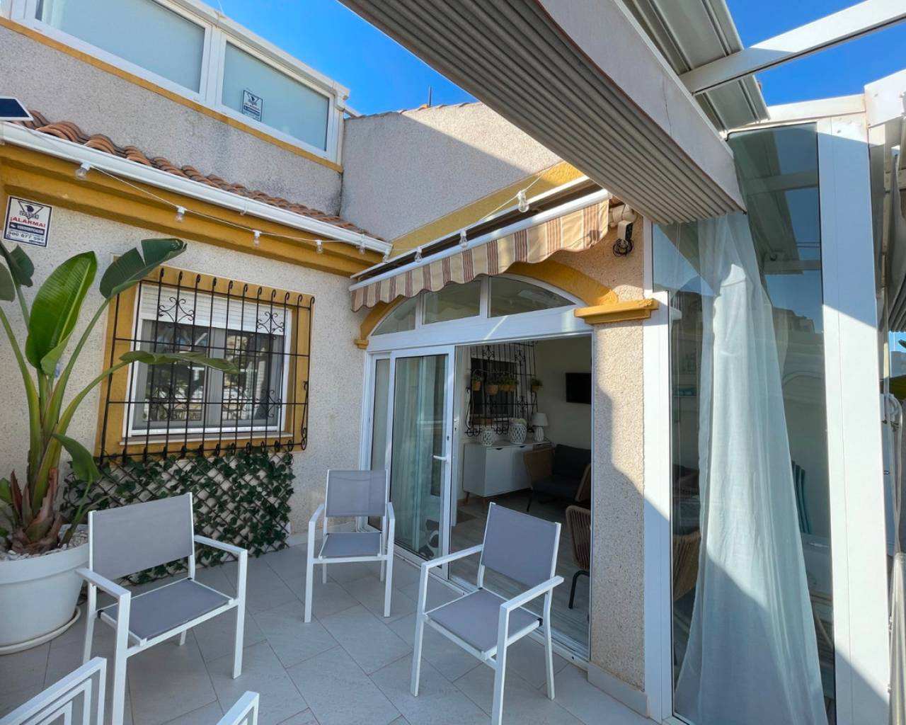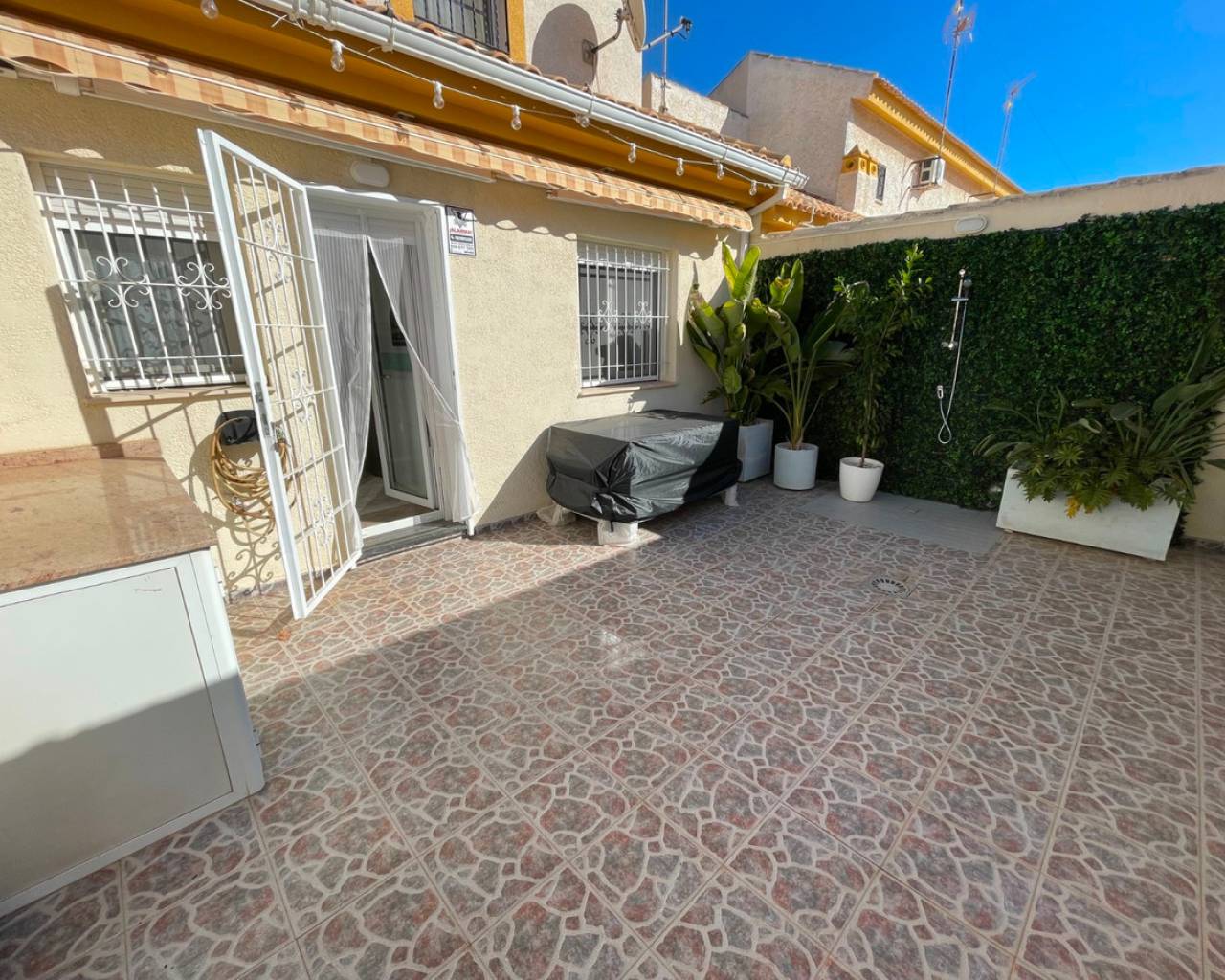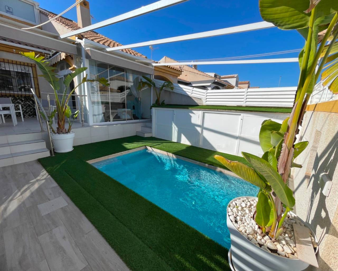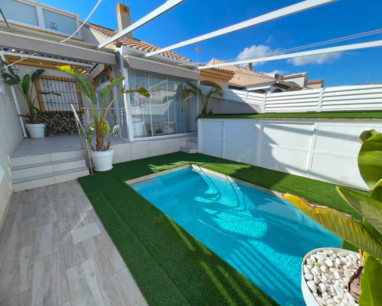 Esta casa adosada reformada de tres dormitorios en Torre de la Horadada se encuentra a solo 15 minutos a pie de su idílica playa, en un entorno tradicional español, cerca de la popular plaza, el puerto deportivo, bares, supermercado y restaurantes. Pilar de la Horadada está muy cerca, con Lo Romero Golf y Orihuela Costa, incluyendo el famoso centro comercial La Zenia Boulevard, a solo 10 minutos en coche. Renovada con un acabado impecable por un diseñador de interiores en 2023, esta casa de 85 m² con acabados de alta calidad se distribuye en dos plantas. La propiedad disfruta de una amplia terraza de entrada cerrada con cortinas de cristal con vistas a la piscina, un lugar ideal para relajarse o cenar durante todo el año. En el interior, el salón cuenta con una estufa de leña con un elegante marco decorativo, una pared decorativa, ventilador de techo y un comedor. Una encantadora cocina independiente equipada ofrece acceso al jardín trasero de baldosas. También en la planta baja hay un dormitorio doble con ventilador de techo y un moderno baño familiar con ducha. La primera planta consta de dos dormitorios dobles adicionales con acceso a una terraza cerrada, actualmente utilizada como sala de estar, y otro baño familiar contemporáneo con ducha. Un solárium privado ofrece espacio exterior adicional para disfrutar del sol. El jardín delantero cuenta con una piscina privada rodeada de césped artificial y amplio espacio de almacenamiento. Entre las comodidades adicionales se incluyen aire acondicionado, radiadores eléctricos y toallero calefactado. Una propiedad realmente impresionante, presentada con un gusto excepcional, ubicada en una de las zonas costeras más codiciadas de la Costa Blanca Sur.