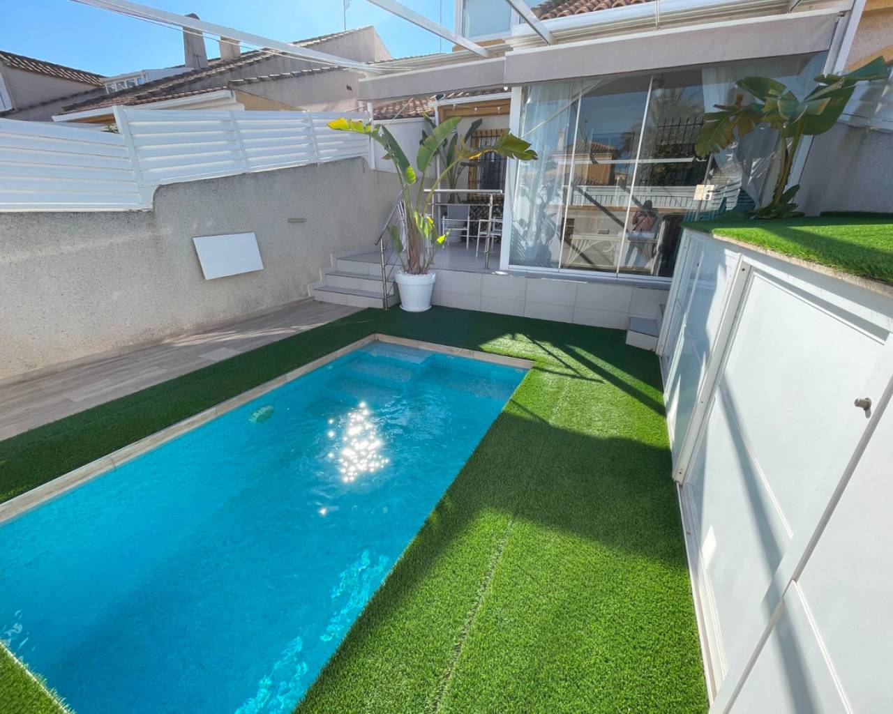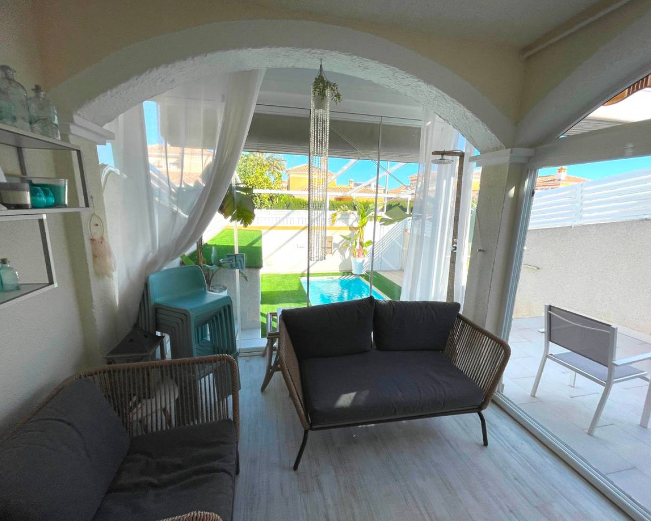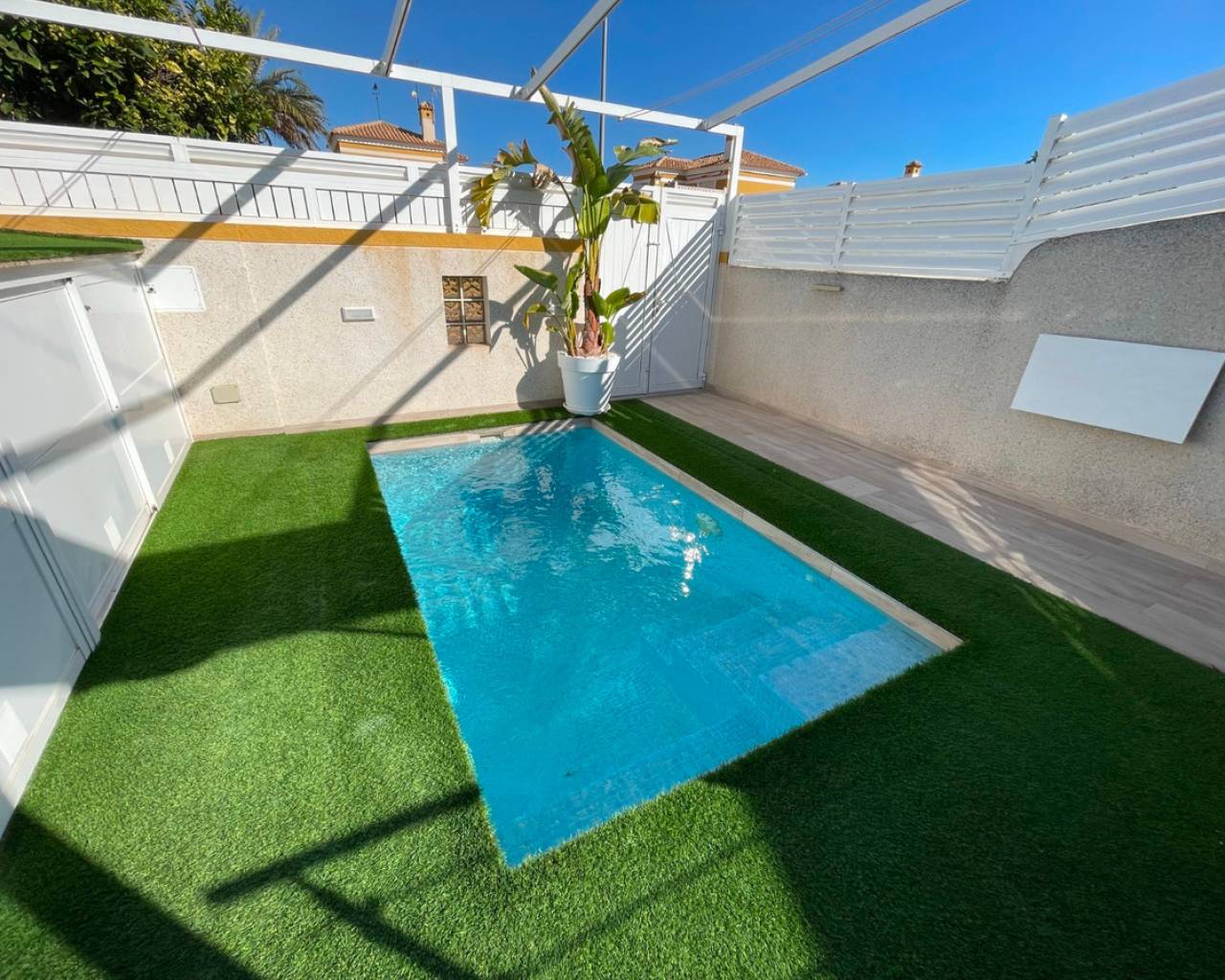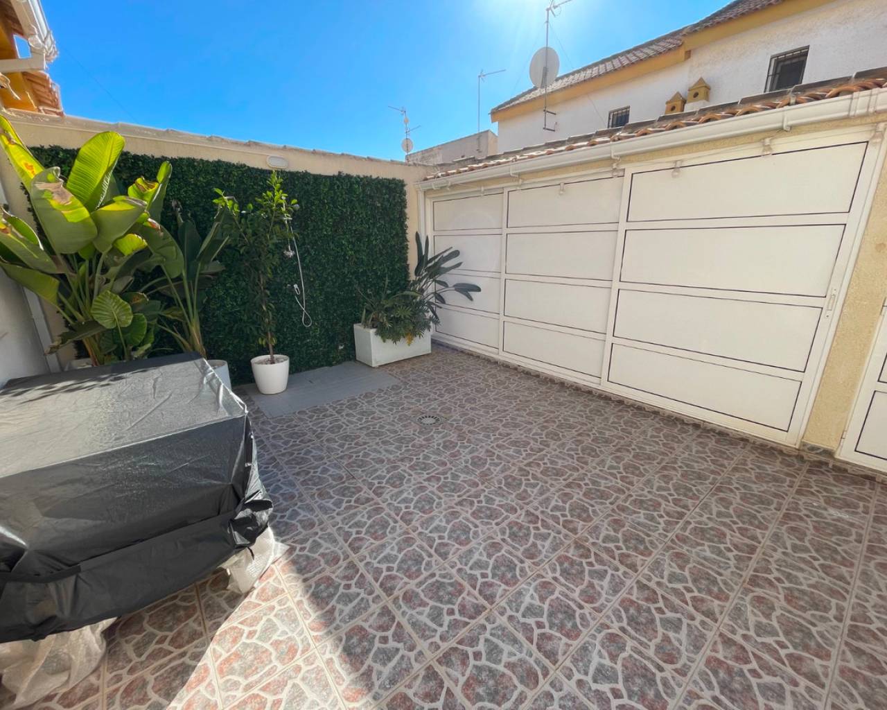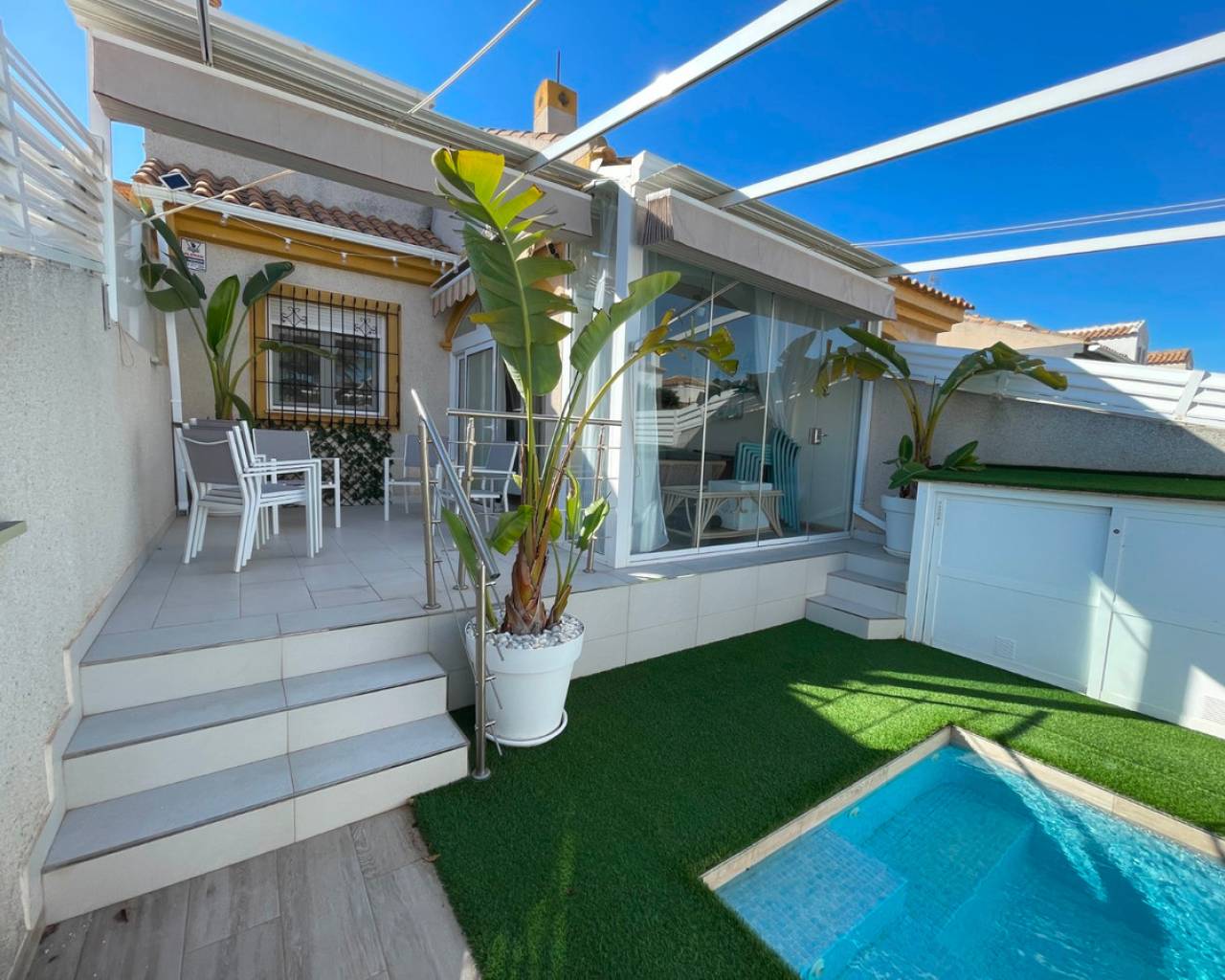 Esta casa adosada reformada de tres dormitorios en Torre de la Horadada se encuentra a solo 15 minutos a pie de su idílica playa, en un entorno tradicional español, cerca de la popular plaza, el puerto deportivo, bares, supermercado y restaurantes. Pilar de la Horadada está muy cerca, con Lo Romero Golf y Orihuela Costa, incluyendo el famoso centro comercial La Zenia Boulevard, a solo 10 minutos en coche. Renovada con un acabado impecable por un diseñador de interiores en 2023, esta casa de 85 m² con acabados de alta calidad se distribuye en dos plantas. La propiedad disfruta de una amplia terraza de entrada cerrada con cortinas de cristal con vistas a la piscina, un lugar ideal para relajarse o cenar durante todo el año. En el interior, el salón cuenta con una estufa de leña con un elegante marco decorativo, una pared decorativa, ventilador de techo y un comedor. Una encantadora cocina independiente equipada ofrece acceso al jardín trasero de baldosas. También en la planta baja hay un dormitorio doble con ventilador de techo y un moderno baño familiar con ducha. La primera planta consta de dos dormitorios dobles adicionales con acceso a una terraza cerrada, actualmente utilizada como sala de estar, y otro baño familiar contemporáneo con ducha. Un solárium privado ofrece espacio exterior adicional para disfrutar del sol. El jardín delantero cuenta con una piscina privada rodeada de césped artificial y amplio espacio de almacenamiento. Entre las comodidades adicionales se incluyen aire acondicionado, radiadores eléctricos y toallero calefactado. Una propiedad realmente impresionante, presentada con un gusto excepcional, ubicada en una de las zonas costeras más codiciadas de la Costa Blanca Sur.