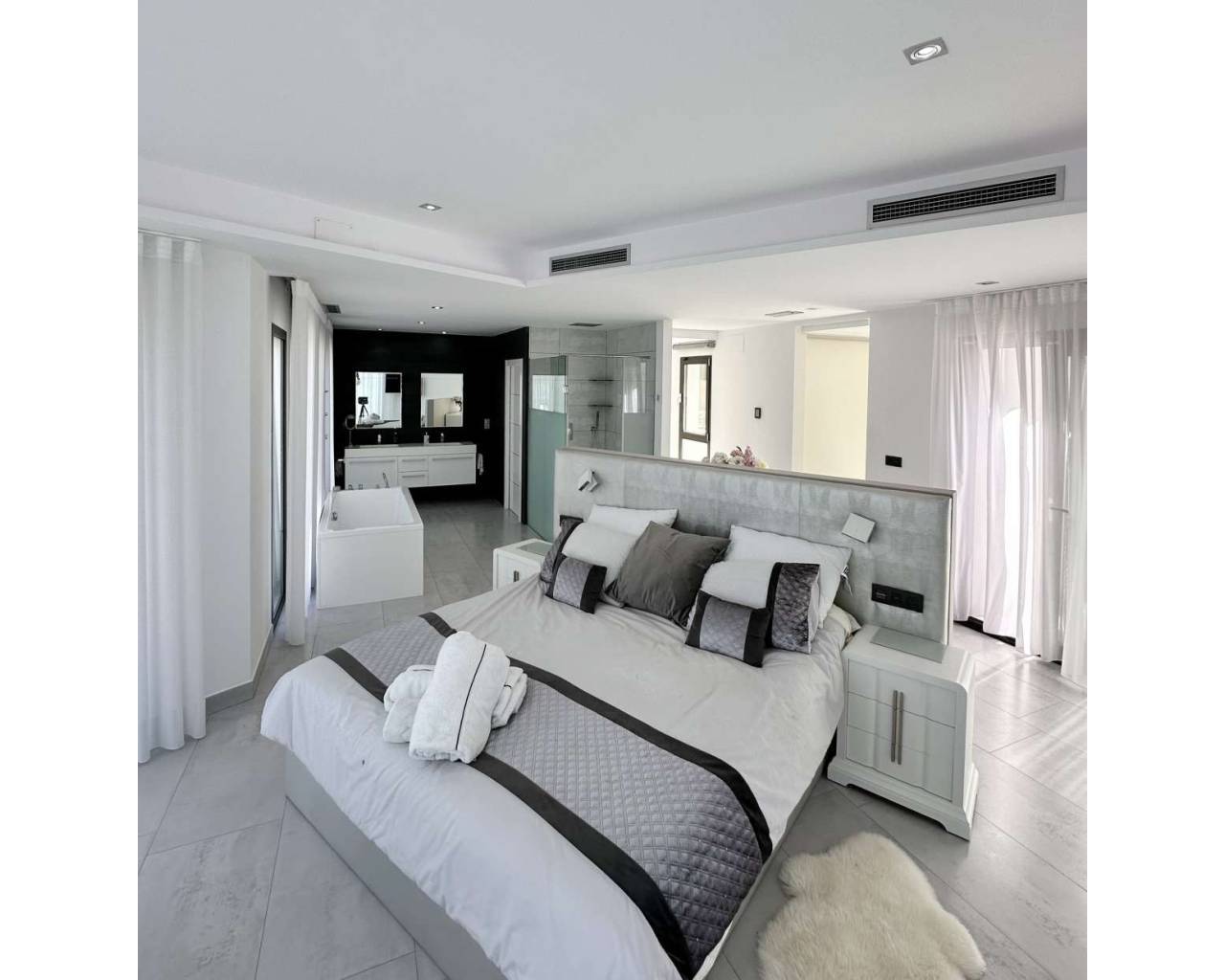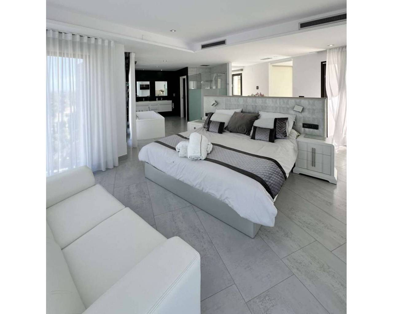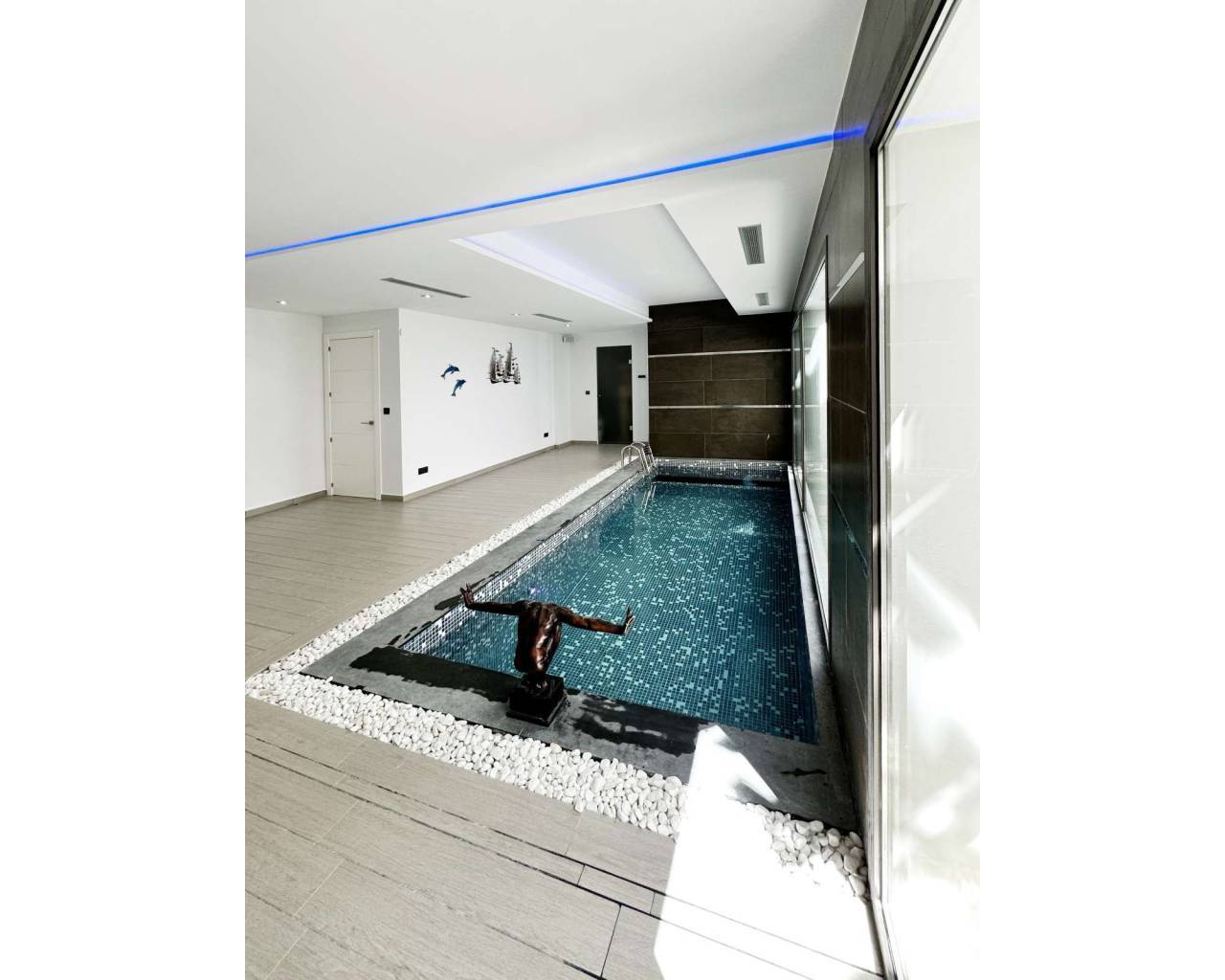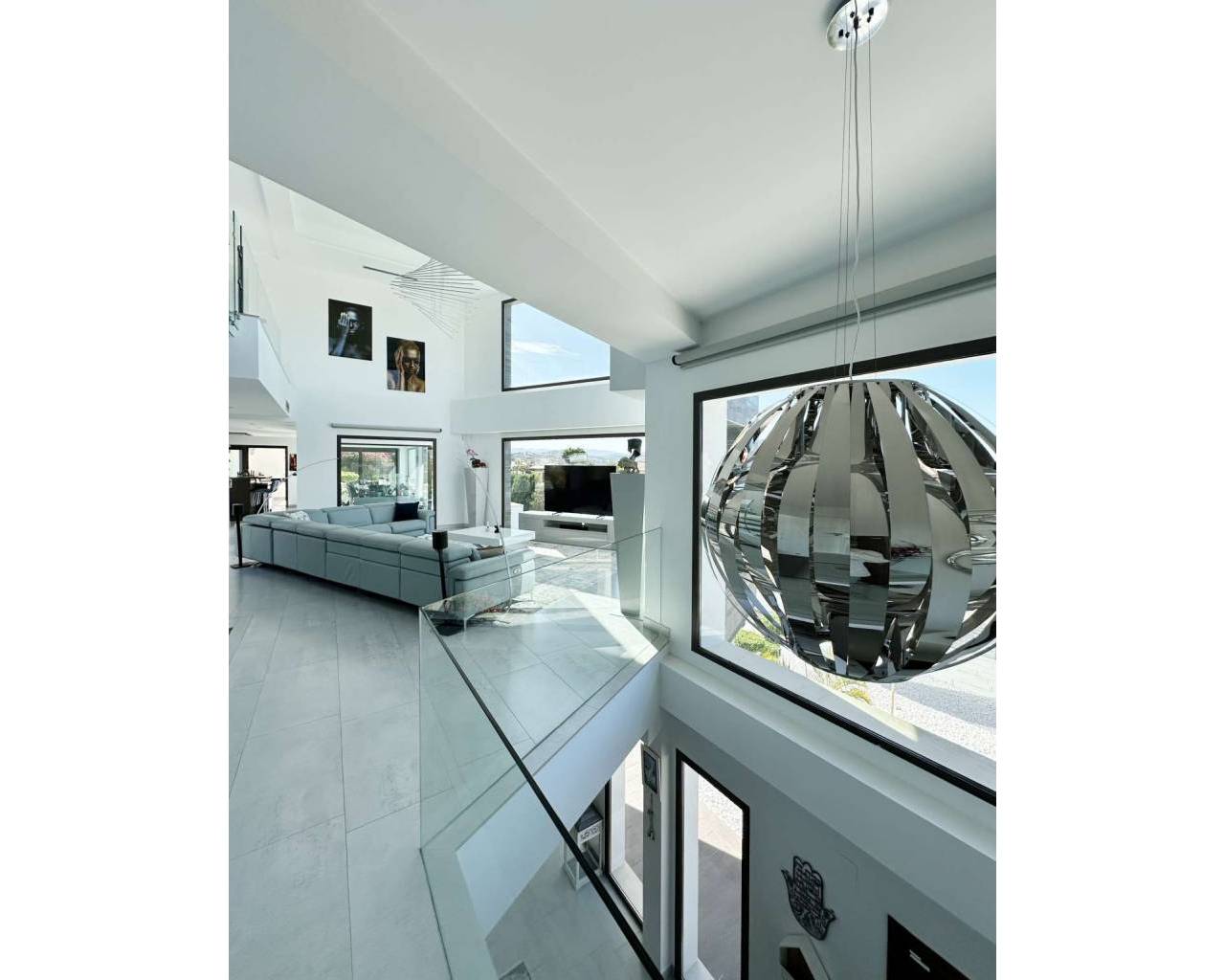Eleve su estilo de vida en esta impresionante obra maestra de 525 metros cuadrados, donde el lujo se fusiona con la modernidad. Distribuida en tres plantas cuidadosamente diseñadas, ofrece una experiencia de vida inigualable. La sala de estar de concepto abierto está llena de luz natural gracias a sus ventanales de piso a techo, y una impactante escalera flotante con barandillas de cristal sirve como hermosa pieza central, conectando todos los niveles.Hay cinco espaciosas habitaciones, incluyendo una lujosa suite principal de 27 metros cuadrados, y ocho elegantes baños para mayor comodidad y privacidad. La cocina gourmet se integra a la perfección con el comedor, ideal tanto para comidas familiares íntimas como para recibir invitados.Relájese en su piscina cubierta climatizada privada, disfrute de la sauna y el gimnasio, o vea películas en la moderna sala multimedia. Dos patios combinan la vida interior y exterior, mientras que en el exterior encontrará dos piscinas adicionales: una piscina en el jardín con fuente y una zona de chapoteo poco profunda para niños, además de una piscina infinita con vistas a la montaña y al mar.Las características adicionales incluyen un amplio loft, amplio espacio de almacenamiento con cuatro armarios, lavandería, garaje seguro y una gran entrada. La casa es ecológica y cuenta con un sistema de paneles solares de 18 kW, almacenamiento de baterías y una estación de carga para vehículos eléctricos. Los hermosos jardines paisajísticos aportan privacidad y tranquilidad.Esta residencia no es solo una casa; es un lienzo para tus sueños: una combinación perfecta de comodidad, sofisticación y lujo. Experimenta la máxima expresión de la vida moderna en este impresionante santuario.