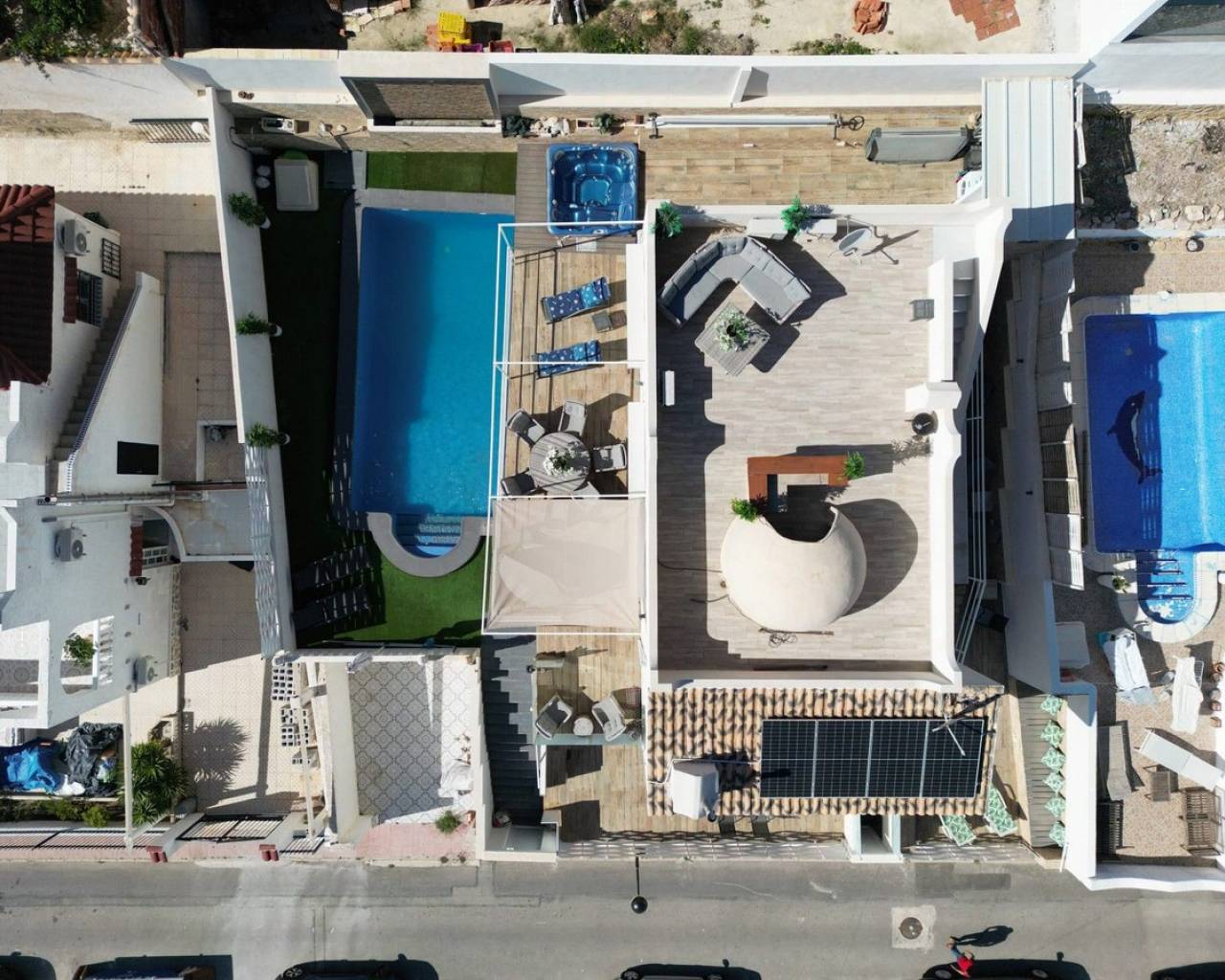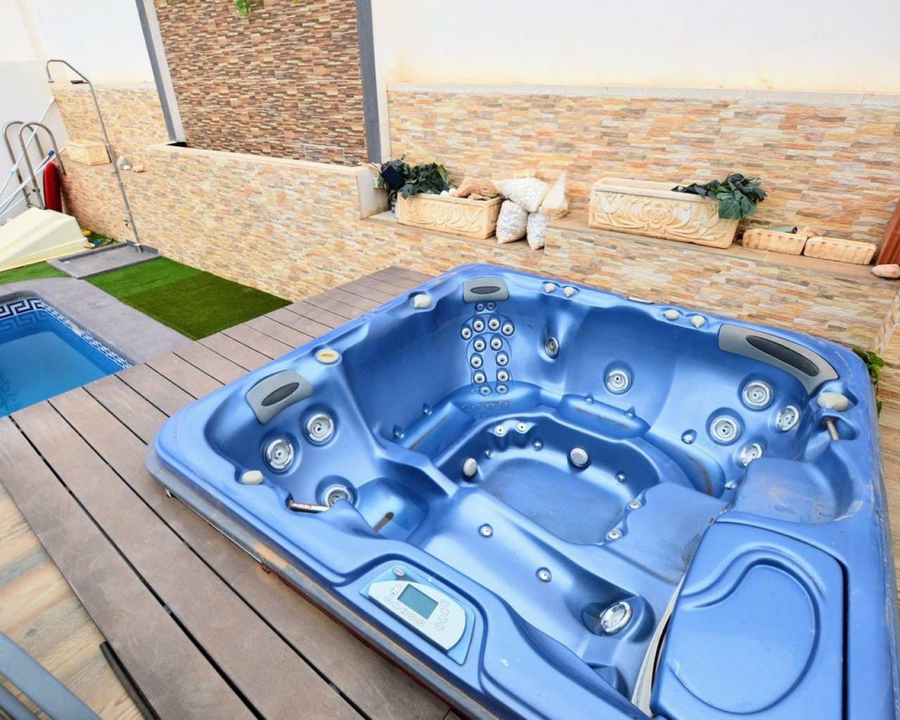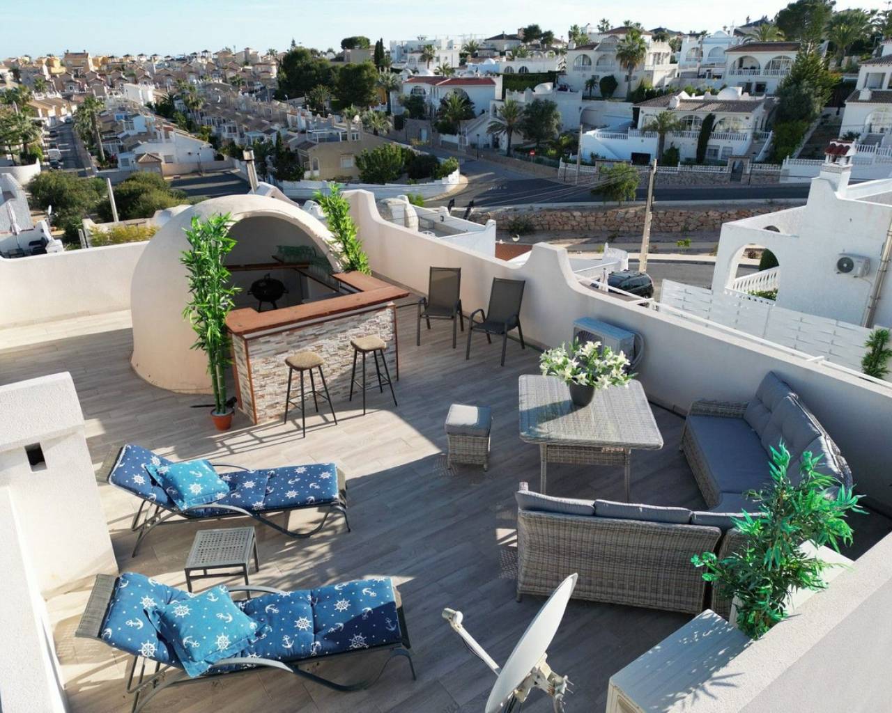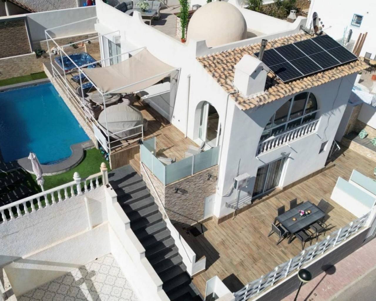 Esta impresionante villa independiente de 5 dormitorios está situada en una zona tranquila en Blue Lagoon, Villamartin. La propiedad se ha distribuido en 2 niveles y el nivel inferior ofrece 3 apartamentos, cada uno con un dormitorio, baño, sala de estar y cocina. la planta superior consta de 2 dormitorios, salón-comedor con estufa de pellets y cocina totalmente equipada. La propiedad se beneficia de terrazas privadas, barbacoa, aire acondicionado, solarium con bar, cocina y ducha exterior, jacuzzi y también una piscina privada. La Urbanización Blue Lagoon está ubicada en una ubicación privilegiada en una gran colina, en las afueras de San Miguel de Salinas, lo que significa que prácticamente todas las propiedades tienen una hermosa vista, ya sea de los lagos salados, el mar, el campo abierto o, en muchos casos, todo. tres. Blue Lagoon es una comunidad verdaderamente multinacional. Compuesto predominantemente por inglés, español, alemán, holandés, sueco, irlandés, suizo y noruego. A sólo 7 minutos de las playas más cercanas de La Zenia y Campoamor y a 5 minutos en coche de los campos de golf de Villamartín, Campoamor, Las Ramblas y las nuevas Las Colinas. Blue Lagoon ahora cuenta con un Centro Comunitario. Se utiliza para fines públicos y privados, como reuniones, clases de idiomas y celebraciones privadas. ¡También hay una bolera, canchas de petanca, un área cerrada de juegos para niños y una cancha de tenis en SPLASH! a sólo un corto paseo de distancia. Abierto todo el año. 10 am - 5 pm, todos los días.- Pases especiales para residentes de Blue Lagoon disponibles previa solicitud. Blue Lagoon tiene la suerte de estar junto a un hermoso bosque abierto. Esto es perfecto tanto para paseadores de perros como para amantes de la naturaleza. ¡Los senderos bien transitados te llevarán en círculo para que no te pierdas! También hay un gran parque ajardinado con bancos de picnic, no sorprende que esta zona se haya vuelto muy popular. Otros servicios a poca distancia son varios bares, tiendas y restaurantes, incluido Villamartin Plaza.