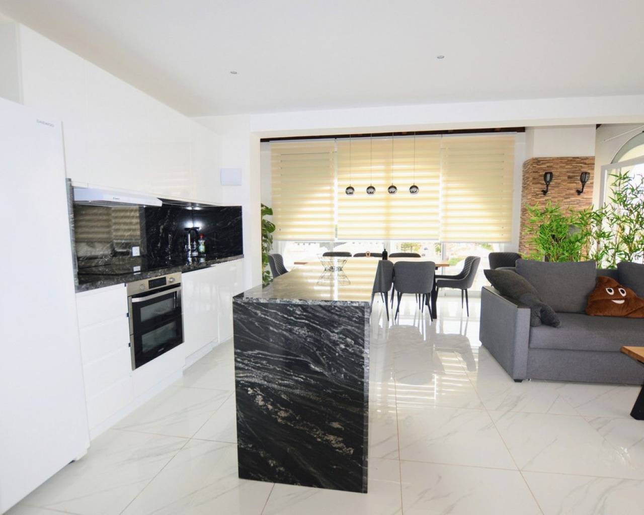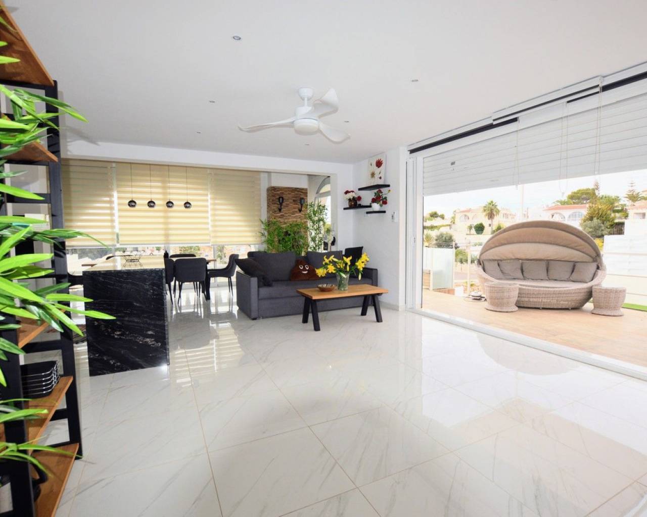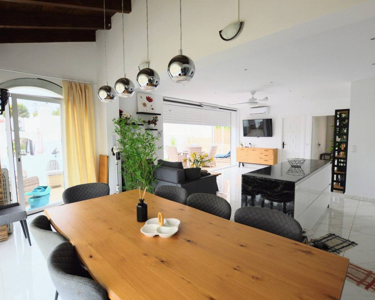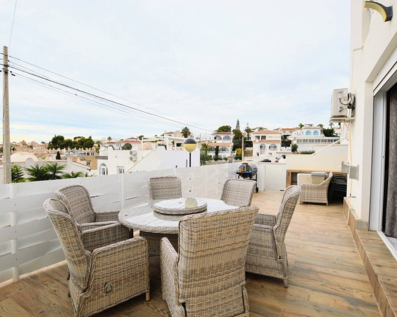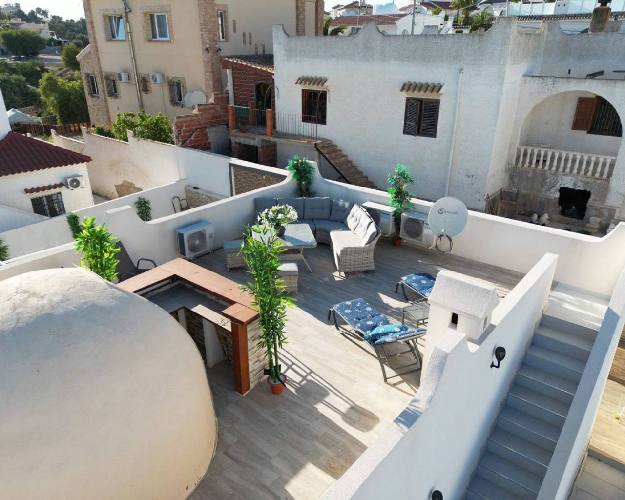 Esta impresionante villa independiente de 5 dormitorios está situada en una zona tranquila en Blue Lagoon, Villamartin. La propiedad se ha distribuido en 2 niveles y el nivel inferior ofrece 3 apartamentos, cada uno con un dormitorio, baño, sala de estar y cocina. la planta superior consta de 2 dormitorios, salón-comedor con estufa de pellets y cocina totalmente equipada. La propiedad se beneficia de terrazas privadas, barbacoa, aire acondicionado, solarium con bar, cocina y ducha exterior, jacuzzi y también una piscina privada. La Urbanización Blue Lagoon está ubicada en una ubicación privilegiada en una gran colina, en las afueras de San Miguel de Salinas, lo que significa que prácticamente todas las propiedades tienen una hermosa vista, ya sea de los lagos salados, el mar, el campo abierto o, en muchos casos, todo. tres. Blue Lagoon es una comunidad verdaderamente multinacional. Compuesto predominantemente por inglés, español, alemán, holandés, sueco, irlandés, suizo y noruego. A sólo 7 minutos de las playas más cercanas de La Zenia y Campoamor y a 5 minutos en coche de los campos de golf de Villamartín, Campoamor, Las Ramblas y las nuevas Las Colinas. Blue Lagoon ahora cuenta con un Centro Comunitario. Se utiliza para fines públicos y privados, como reuniones, clases de idiomas y celebraciones privadas. ¡También hay una bolera, canchas de petanca, un área cerrada de juegos para niños y una cancha de tenis en SPLASH! a sólo un corto paseo de distancia. Abierto todo el año. 10 am - 5 pm, todos los días.- Pases especiales para residentes de Blue Lagoon disponibles previa solicitud. Blue Lagoon tiene la suerte de estar junto a un hermoso bosque abierto. Esto es perfecto tanto para paseadores de perros como para amantes de la naturaleza. ¡Los senderos bien transitados te llevarán en círculo para que no te pierdas! También hay un gran parque ajardinado con bancos de picnic, no sorprende que esta zona se haya vuelto muy popular. Otros servicios a poca distancia son varios bares, tiendas y restaurantes, incluido Villamartin Plaza.