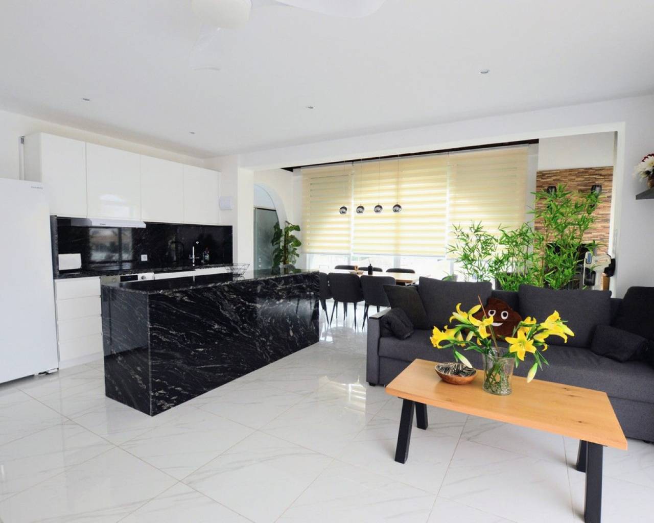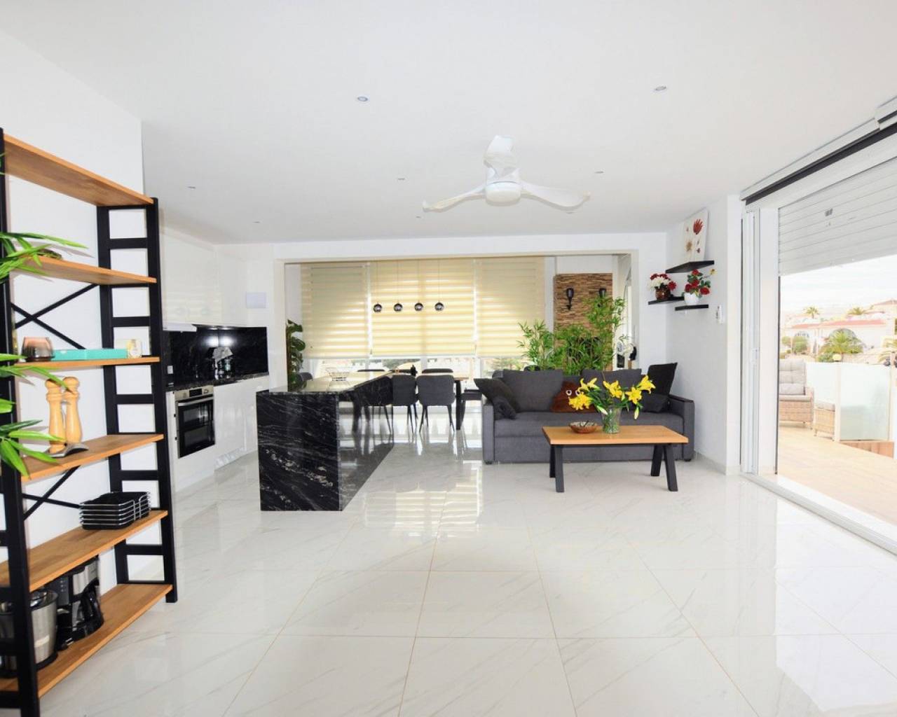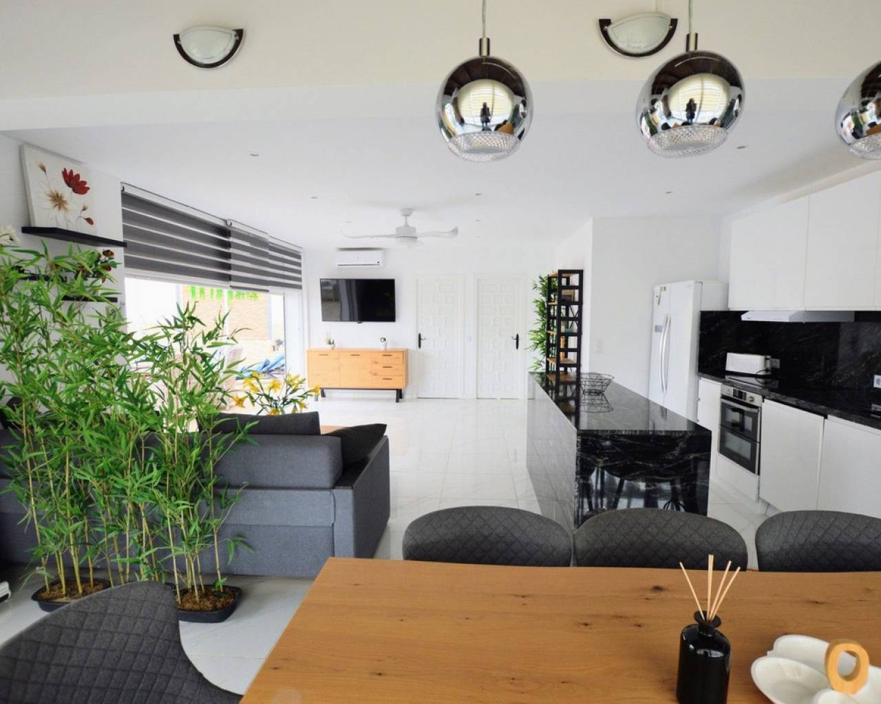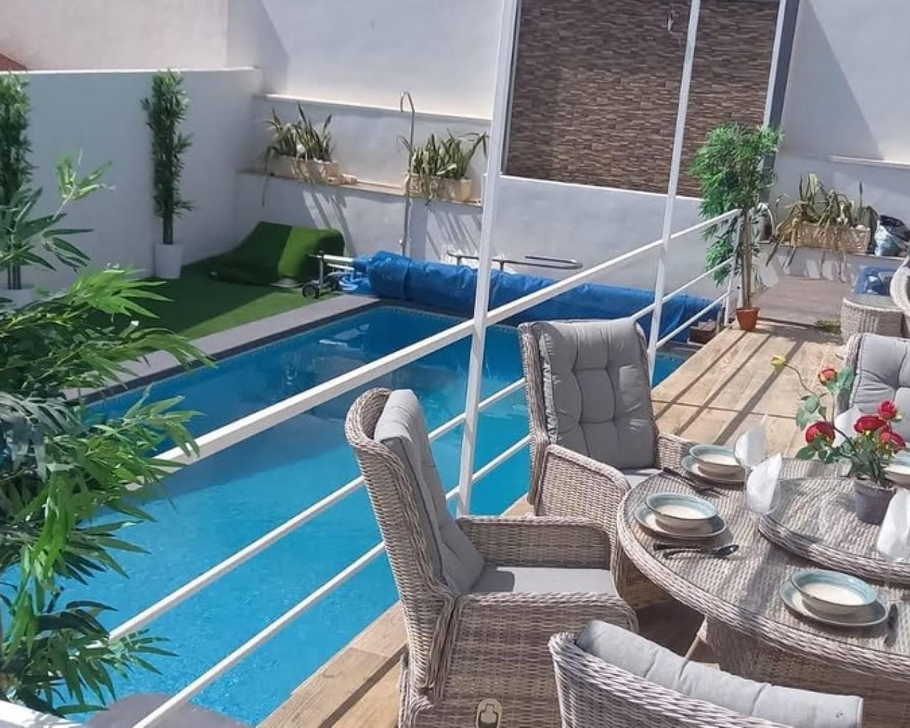 Esta impresionante villa independiente de 5 dormitorios está situada en una zona tranquila en Blue Lagoon, Villamartin. La propiedad se ha distribuido en 2 niveles y el nivel inferior ofrece 3 apartamentos, cada uno con un dormitorio, baño, sala de estar y cocina. la planta superior consta de 2 dormitorios, salón-comedor con estufa de pellets y cocina totalmente equipada. La propiedad se beneficia de terrazas privadas, barbacoa, aire acondicionado, solarium con bar, cocina y ducha exterior, jacuzzi y también una piscina privada. La Urbanización Blue Lagoon está ubicada en una ubicación privilegiada en una gran colina, en las afueras de San Miguel de Salinas, lo que significa que prácticamente todas las propiedades tienen una hermosa vista, ya sea de los lagos salados, el mar, el campo abierto o, en muchos casos, todo. tres. Blue Lagoon es una comunidad verdaderamente multinacional. Compuesto predominantemente por inglés, español, alemán, holandés, sueco, irlandés, suizo y noruego. A sólo 7 minutos de las playas más cercanas de La Zenia y Campoamor y a 5 minutos en coche de los campos de golf de Villamartín, Campoamor, Las Ramblas y las nuevas Las Colinas. Blue Lagoon ahora cuenta con un Centro Comunitario. Se utiliza para fines públicos y privados, como reuniones, clases de idiomas y celebraciones privadas. ¡También hay una bolera, canchas de petanca, un área cerrada de juegos para niños y una cancha de tenis en SPLASH! a sólo un corto paseo de distancia. Abierto todo el año. 10 am - 5 pm, todos los días.- Pases especiales para residentes de Blue Lagoon disponibles previa solicitud. Blue Lagoon tiene la suerte de estar junto a un hermoso bosque abierto. Esto es perfecto tanto para paseadores de perros como para amantes de la naturaleza. ¡Los senderos bien transitados te llevarán en círculo para que no te pierdas! También hay un gran parque ajardinado con bancos de picnic, no sorprende que esta zona se haya vuelto muy popular. Otros servicios a poca distancia son varios bares, tiendas y restaurantes, incluido Villamartin Plaza.