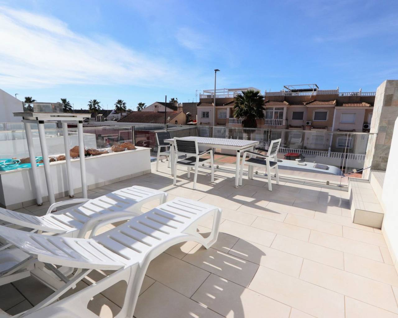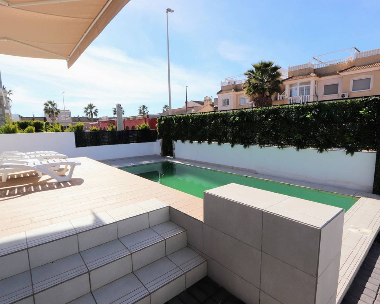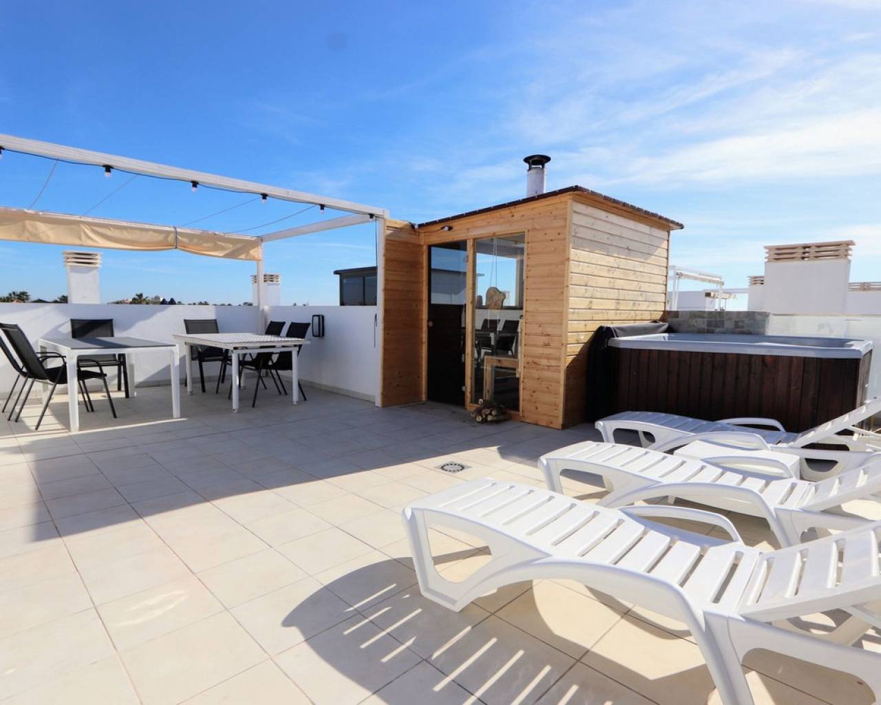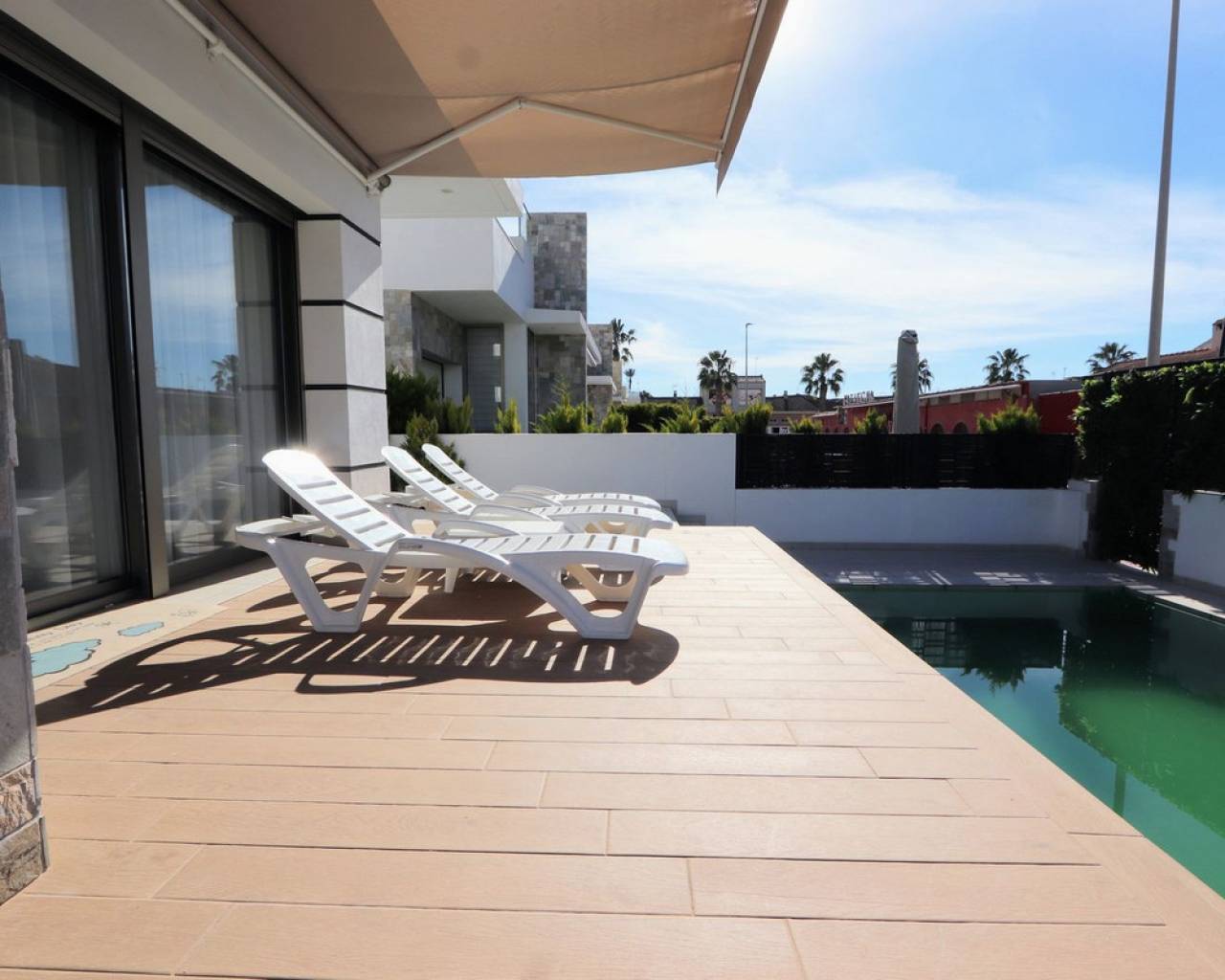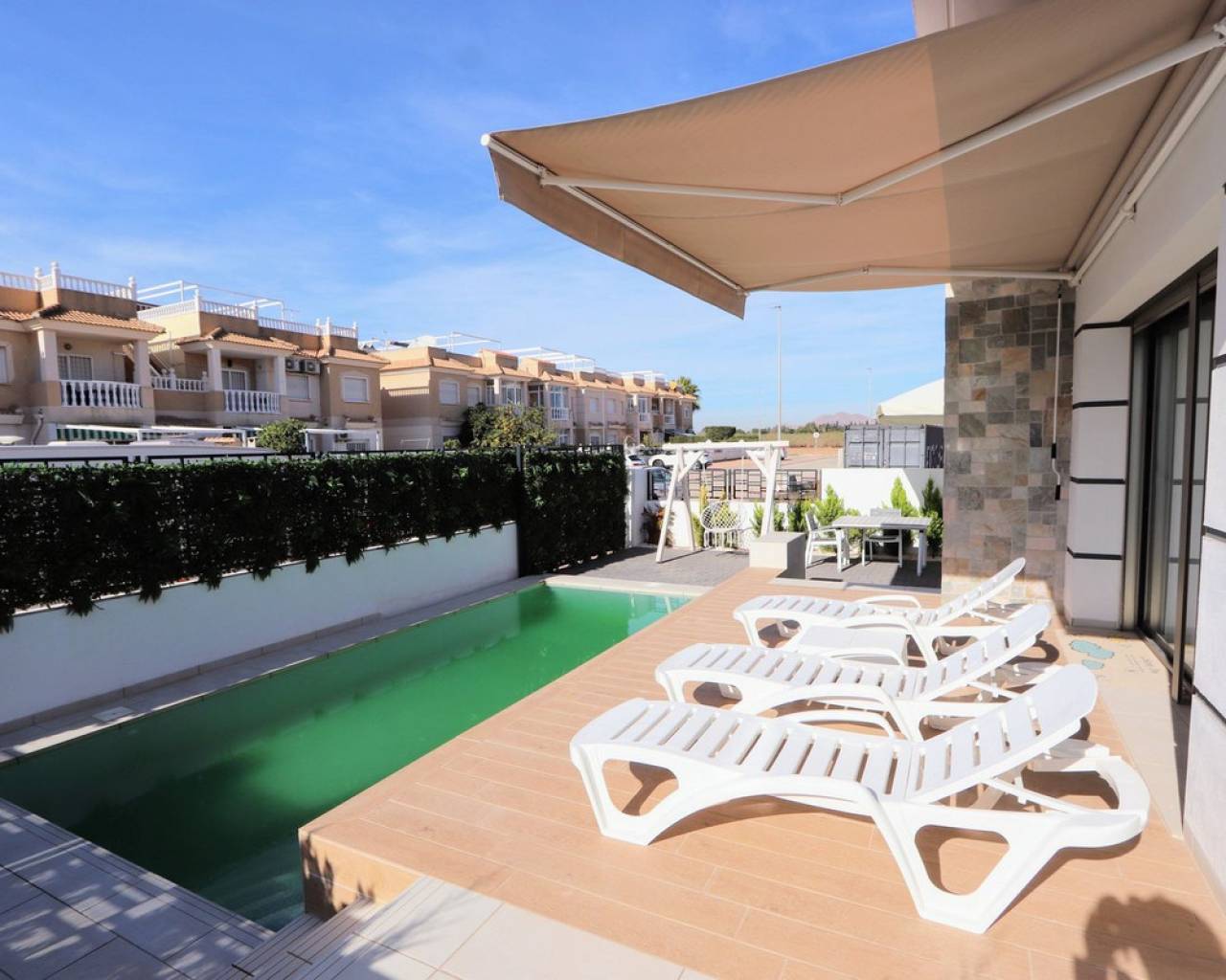 Estamos orgullosos de presentarles esta fantástica villa independiente que se encuentra a sólo 900 m de las playas de Los Alcázares y a poca distancia de todos los servicios. La propiedad consta de 4 dormitorios, uno de ellos convertido del garaje al 4º dormitorio, 3 baños, amplio salón/comedor con una moderna cocina abierta. Desde el salón encontrará ventanas correderas que le llevarán a las soleadas terrazas y a la piscina privada. Cada piso ofrece terrazas privadas con vistas abiertas y también un gran solarium en la azotea con jacuzzi, sauna y pérgola. La ubicación de la villa es excelente y a sólo 10 minutos andando de una de las playas más bonitas de la Costa Cálida. Además, encontrarás todas las comodidades a tu alcance. Los Alcázares es un precioso pueblo costero lleno de palmeras y hermosas playas. Encontrará todos los servicios necesarios, como muchos buenos restaurantes, bares de tapas, cafeterías y supermercados. En las tranquilas aguas del Mar Menor podrás practicar deportes acuáticos durante todo el año y disfrutar de las preciosas playas. El centro comercial Dos Mares está a 10 minutos en coche. El gran centro comercial Zenia Boulevard, con sus 130 tiendas de moda, se encuentra a 20 minutos en coche. Los parques naturales de Cabo de Palos y Callblanque se encuentran a 20 minutos en coche.