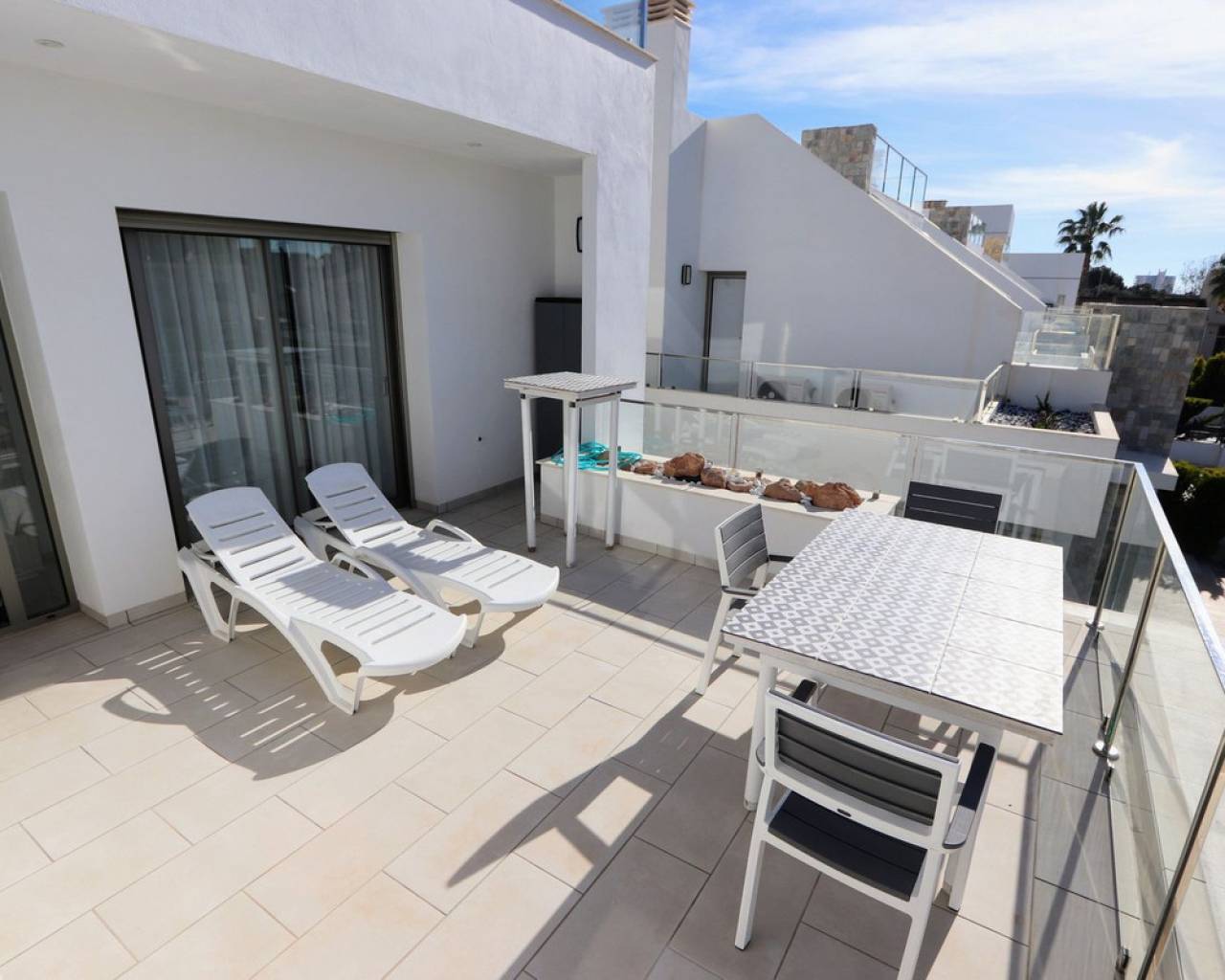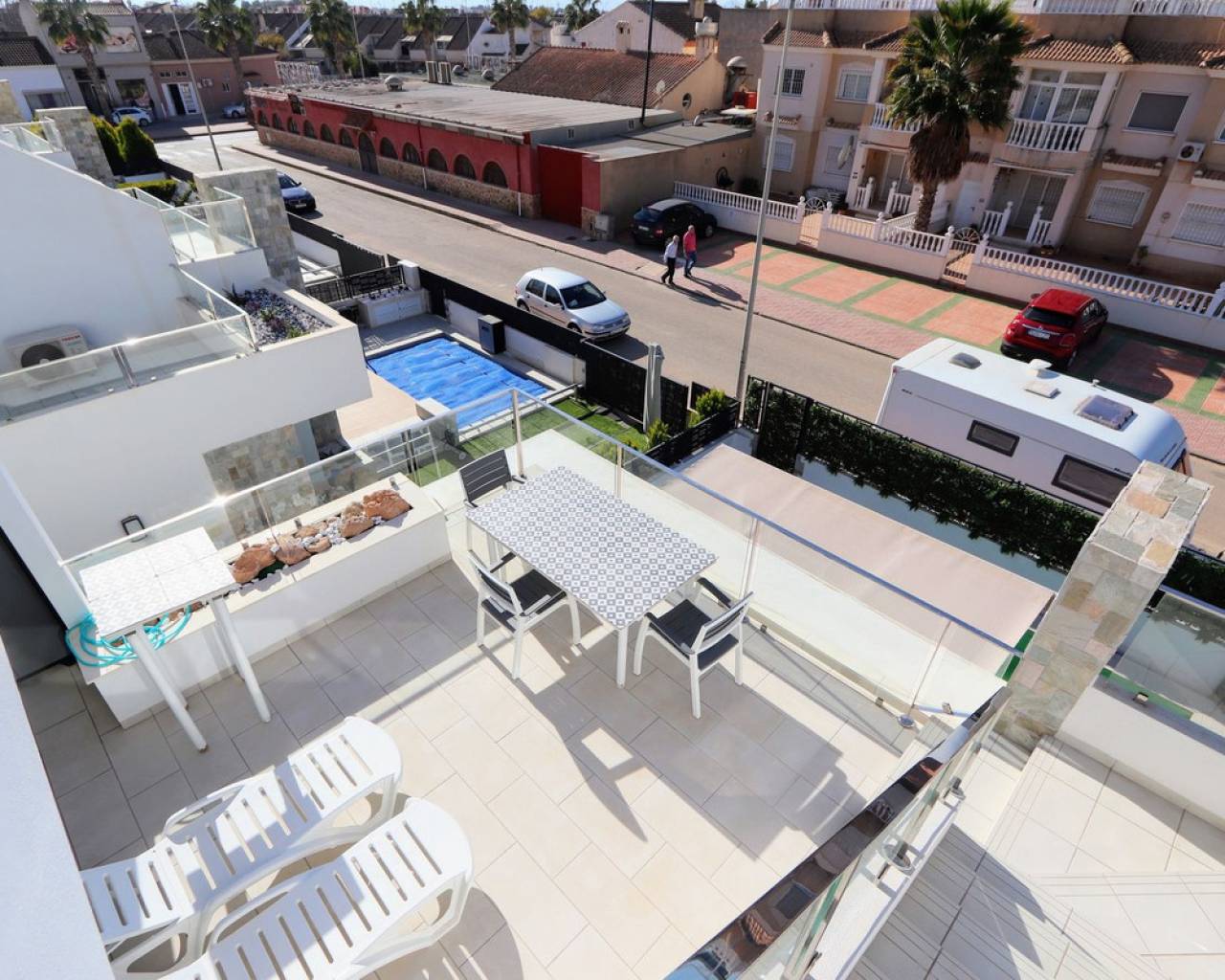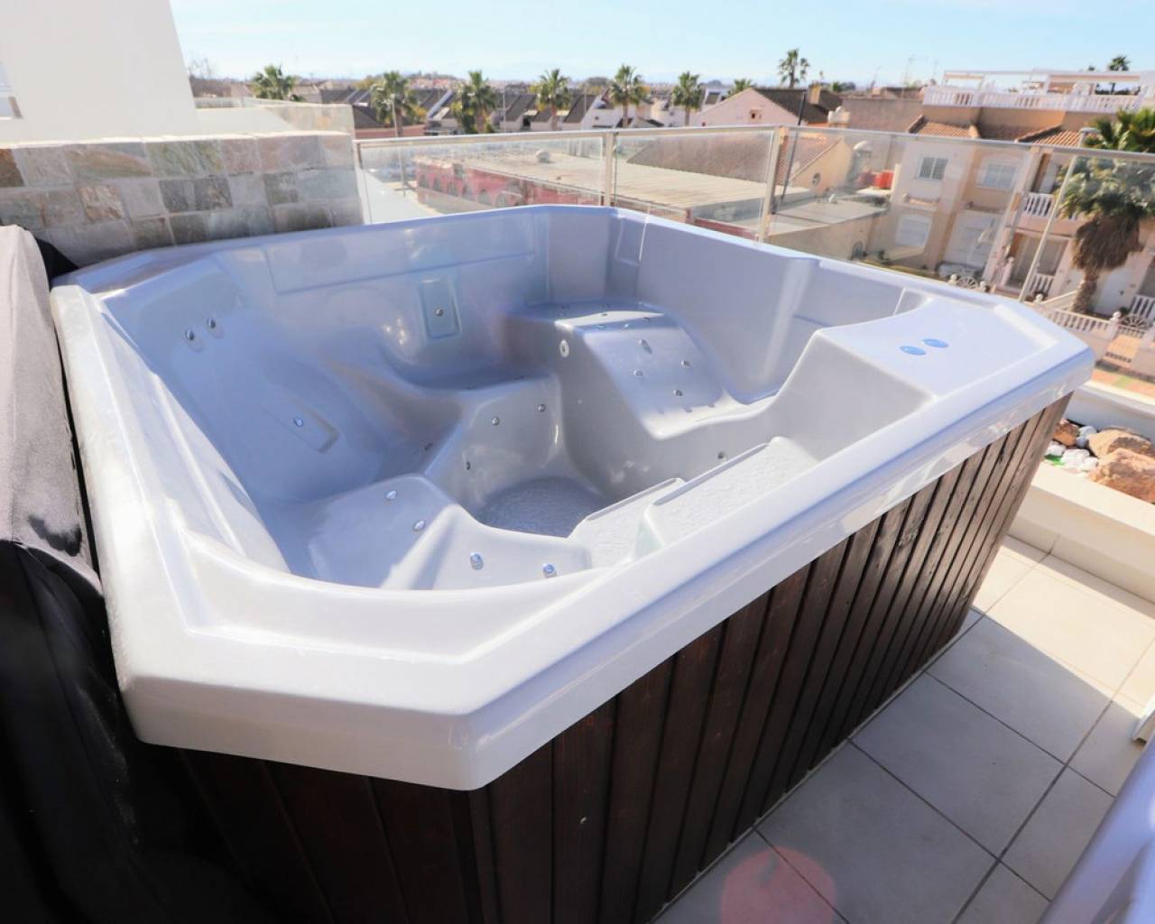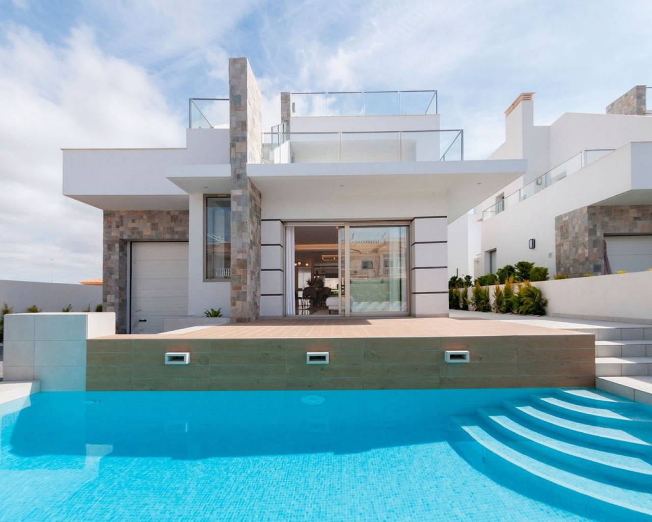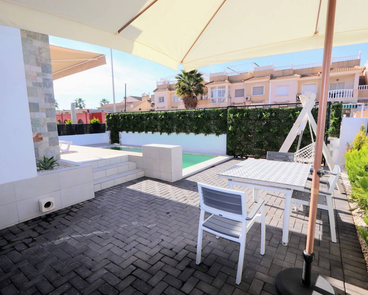 Estamos orgullosos de presentarles esta fantástica villa independiente que se encuentra a sólo 900 m de las playas de Los Alcázares y a poca distancia de todos los servicios. La propiedad consta de 4 dormitorios, uno de ellos convertido del garaje al 4º dormitorio, 3 baños, amplio salón/comedor con una moderna cocina abierta. Desde el salón encontrará ventanas correderas que le llevarán a las soleadas terrazas y a la piscina privada. Cada piso ofrece terrazas privadas con vistas abiertas y también un gran solarium en la azotea con jacuzzi, sauna y pérgola. La ubicación de la villa es excelente y a sólo 10 minutos andando de una de las playas más bonitas de la Costa Cálida. Además, encontrarás todas las comodidades a tu alcance. Los Alcázares es un precioso pueblo costero lleno de palmeras y hermosas playas. Encontrará todos los servicios necesarios, como muchos buenos restaurantes, bares de tapas, cafeterías y supermercados. En las tranquilas aguas del Mar Menor podrás practicar deportes acuáticos durante todo el año y disfrutar de las preciosas playas. El centro comercial Dos Mares está a 10 minutos en coche. El gran centro comercial Zenia Boulevard, con sus 130 tiendas de moda, se encuentra a 20 minutos en coche. Los parques naturales de Cabo de Palos y Callblanque se encuentran a 20 minutos en coche.