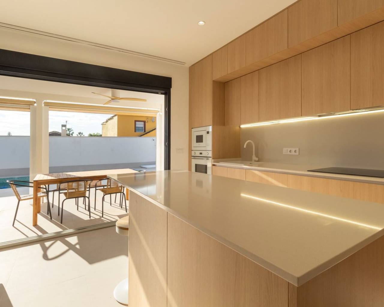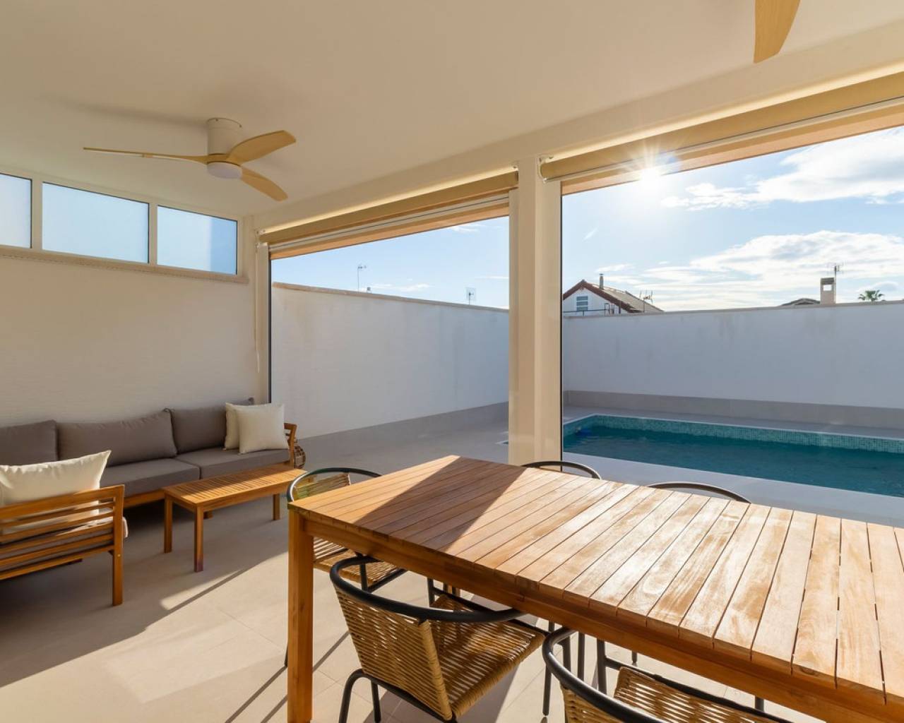 Fantástica villa de 3 dormitorios en Torrevieja, concretamente en la zona de El Chaparal. Esta propiedad ha sido totalmente reformada y ofrece 104 m² de espacio habitable, todo en una sola planta. La villa cuenta con tres habitaciones dobles, dos baños con calefacción por suelo radiante, una cocina abierta y un amplio y luminoso salón. En el exterior, encontrará un jardín de fácil mantenimiento y una piscina privada de generosas dimensiones.