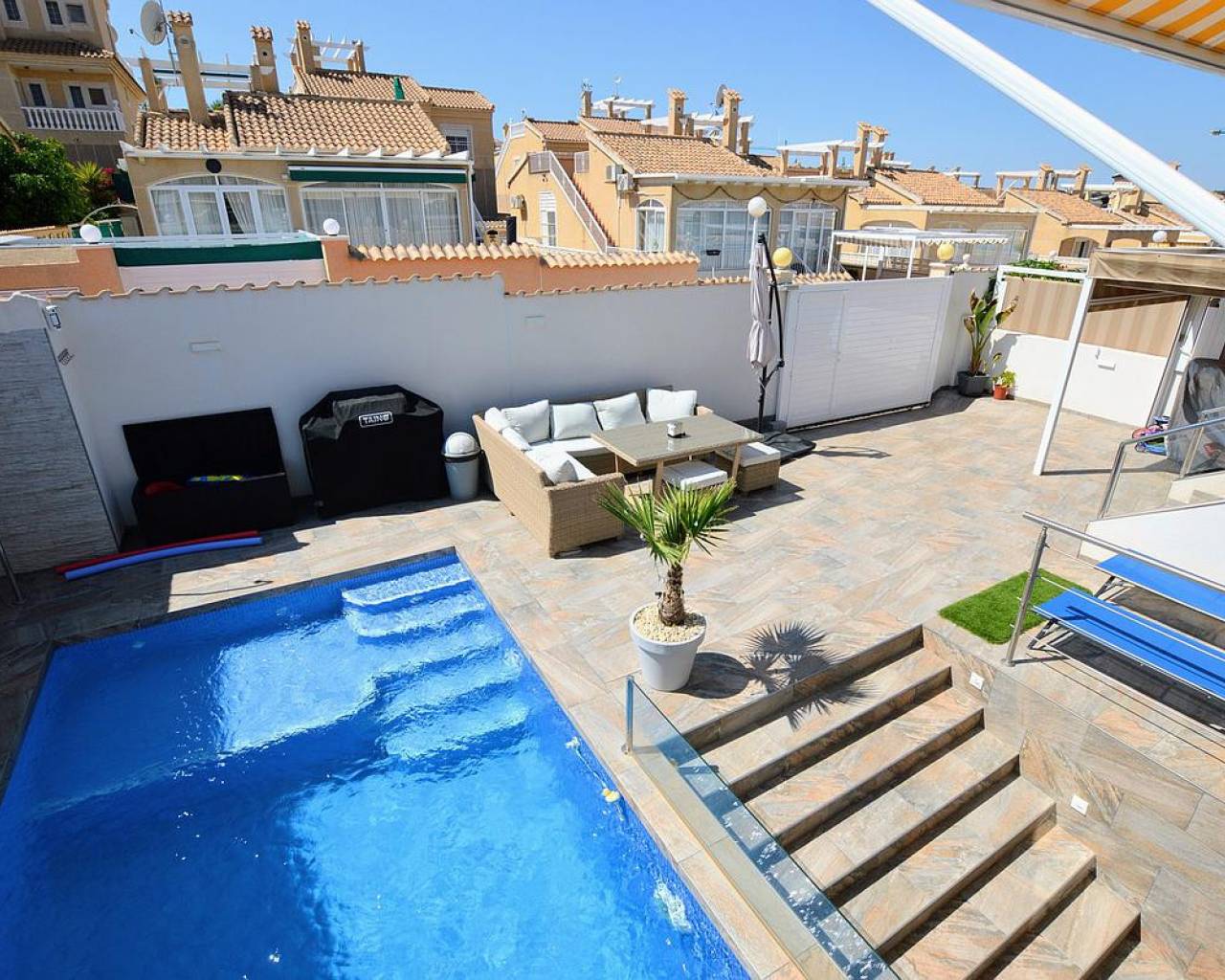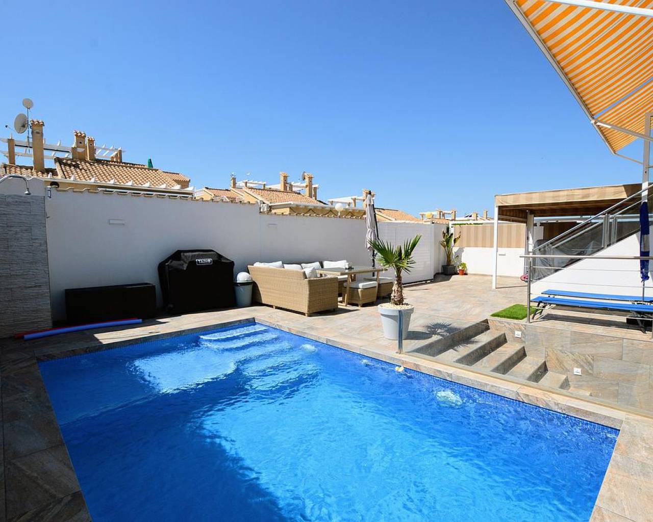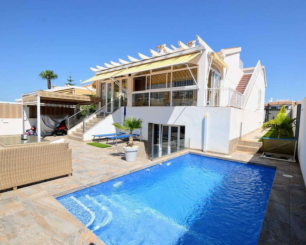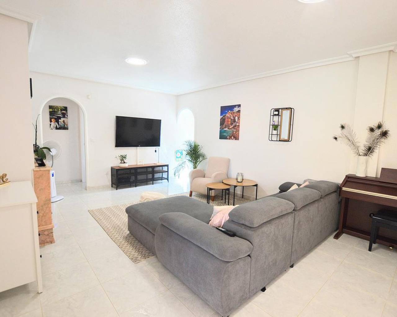 Nos complace presentar esta hermosa villa independiente renovada, perfectamente ubicada a un corto paseo de todas las comodidades en la urbanización Las Palmeras de Los Altos. Esta propiedad con orientación sur disfruta de luz natural durante todo el día y cuenta con: * 3 dormitorios con armarios empotrados * 3 baños * 2 salones-comedor, cada uno con chimenea * 2 cocinas totalmente equipadas con electrodomésticos nuevos * Terrazas privadas que rodean la villa * Aparcamiento privado * Ducha exterior * Una encantadora piscina privada de agua salada Para mayor atractivo, la villa incluye escaleras interiores y exteriores que conducen a un amplio sótano completamente renovado. Este espacio adicional ofrece otra cocina totalmente equipada, una sala de estar y un baño con sauna. Además, encontrará un solárium en la azotea perfecto para disfrutar del sol, una terraza acristalada, aire acondicionado en toda la propiedad, radiadores eléctricos y la villa se ofrece completamente amueblada. Para apreciar plenamente todo lo que esta excepcional propiedad ofrece, le recomendamos encarecidamente visitarla. Los Altos, un barrio residencial de Torrevieja situado a unos 5 kilómetros del animado centro de la ciudad, ofrece una gran variedad de servicios. Entre ellos, se incluyen un gran supermercado Consum, una variedad de restaurantes y bares, un colegio de primaria y una oficina de correos. Dispone de un cómodo transporte público mediante una línea principal de autobuses, que ofrece fácil acceso al Hospital de Torrevieja en Los Balcones y un rápido trayecto de 10 minutos a la hermosa playa de Punta Prima. Punta Prima ofrece una gran variedad de restaurantes, supermercados, tiendas de electrodomésticos y muebles, así como un McDonald's con servicio para llevar. En resumen, Los Altos es un destino vacacional ideal para toda la familia en cualquier época del año.