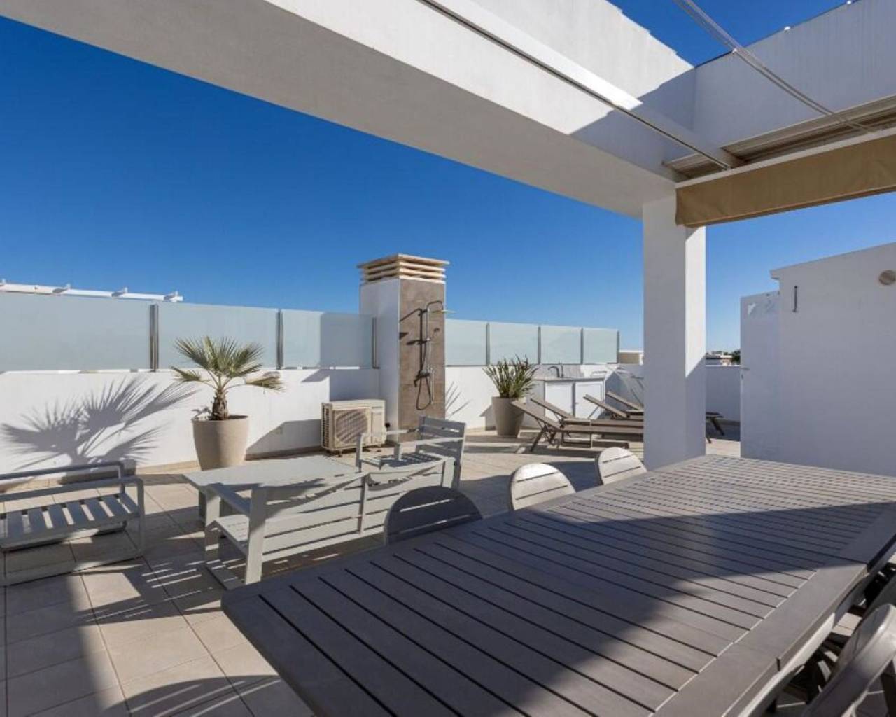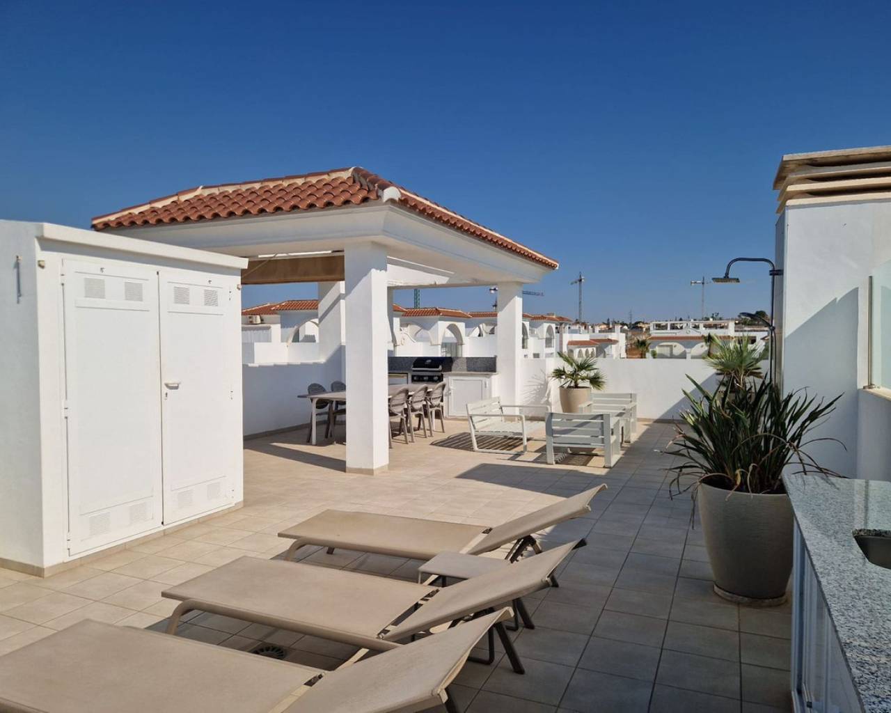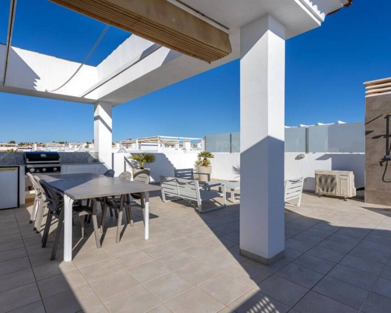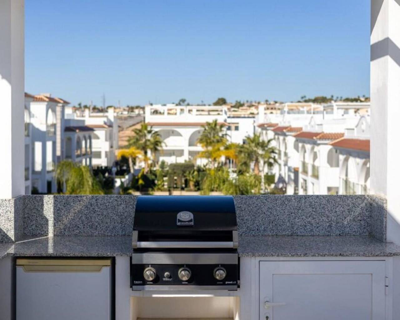 Enclavado en la impresionante Costa Blanca Sur, en la encantadora localidad de Rojales/Quesada, el ático 'Allegra' promete un refugio excepcional. A un paso del balneario de Torrevieja y cerca de la encantadora Guardamar del Segura, con sus hermosas playas de arena, este ático ofrece una accesibilidad inigualable. Con el Aeropuerto de Alicante-Elche convenientemente ubicado a solo 30 minutos, llegar a este hermoso destino es pan comido. El ático 'Allegra' presenta un meticuloso diseño con interiores modernos y está equipado con todas las comodidades modernas, ofreciendo un ambiente cálido y acogedor que le hará sentirse como en casa al instante. La propiedad cuenta con dos amplios dormitorios completamente amueblados, dos modernos baños y una cocina totalmente equipada. El amplio salón está decorado con muebles muy cómodos, y podrá disfrutar de su tiempo libre en dos terrazas, incluyendo un balcón con una mesa y cuatro sillas y una terraza excepcionalmente grande en la azotea. Desde aquí, podrá disfrutar de las impresionantes vistas a la laguna y al hermoso jardín con tres amplias piscinas comunitarias. Para quienes buscan comodidades adicionales, hay un parque infantil, gimnasio y pistas de tenis gratuitas en las inmediaciones. La terraza de la azotea es especialmente impresionante, con una amplia mesa de comedor con seis sillas bajo un toldo retráctil, un acogedor conjunto de salón, tumbonas, una cocina exterior completa con barbacoa, nevera y fregadero, así como una ducha exterior con agua fría y caliente. Además, el ático ofrece aparcamiento exterior seguro con tres puertas eléctricas y una plaza de aparcamiento privada, lo que garantiza tranquilidad durante toda su estancia. El ático 'Allegra' personifica la vida de lujo con su combinación de confort moderno, impresionantes vistas y cómodo acceso a lo mejor de la Costa Blanca Sur.