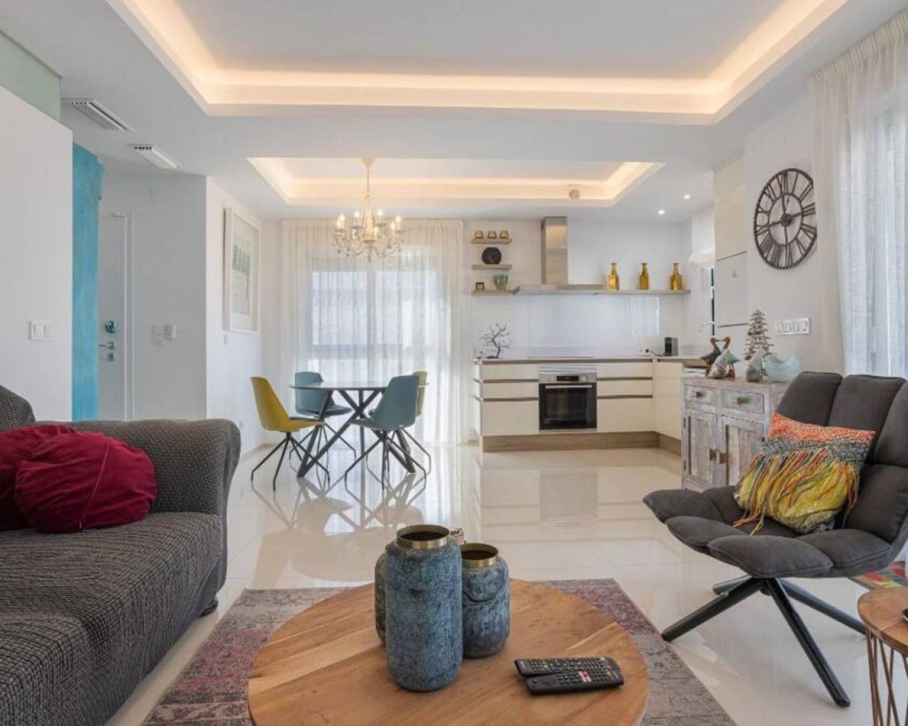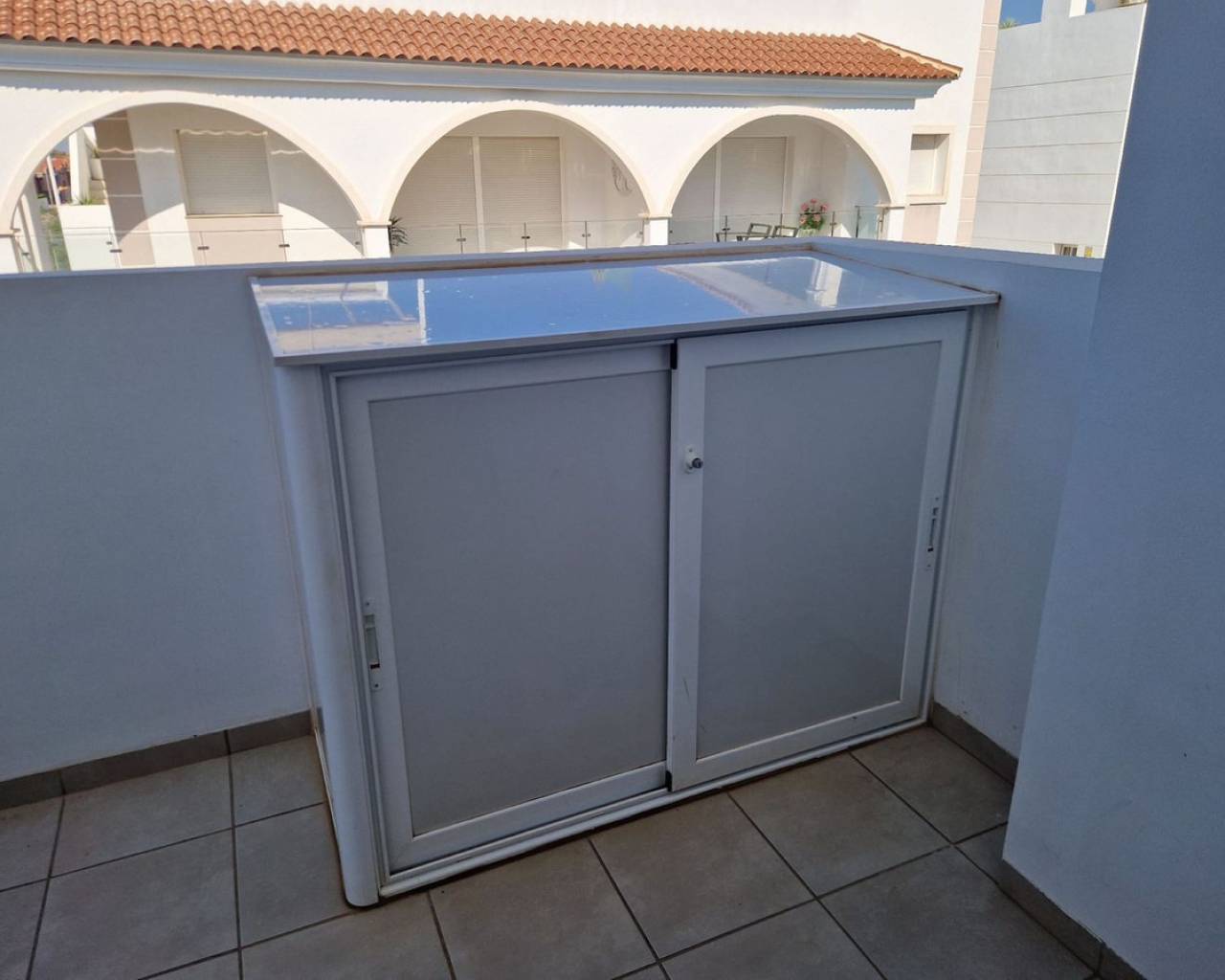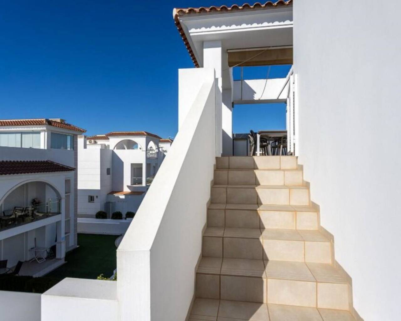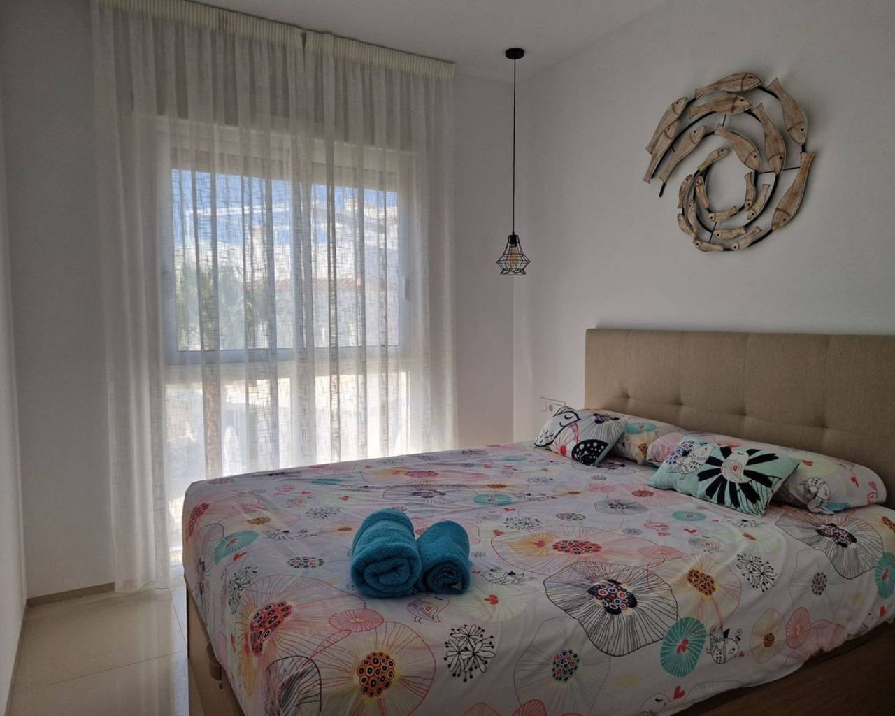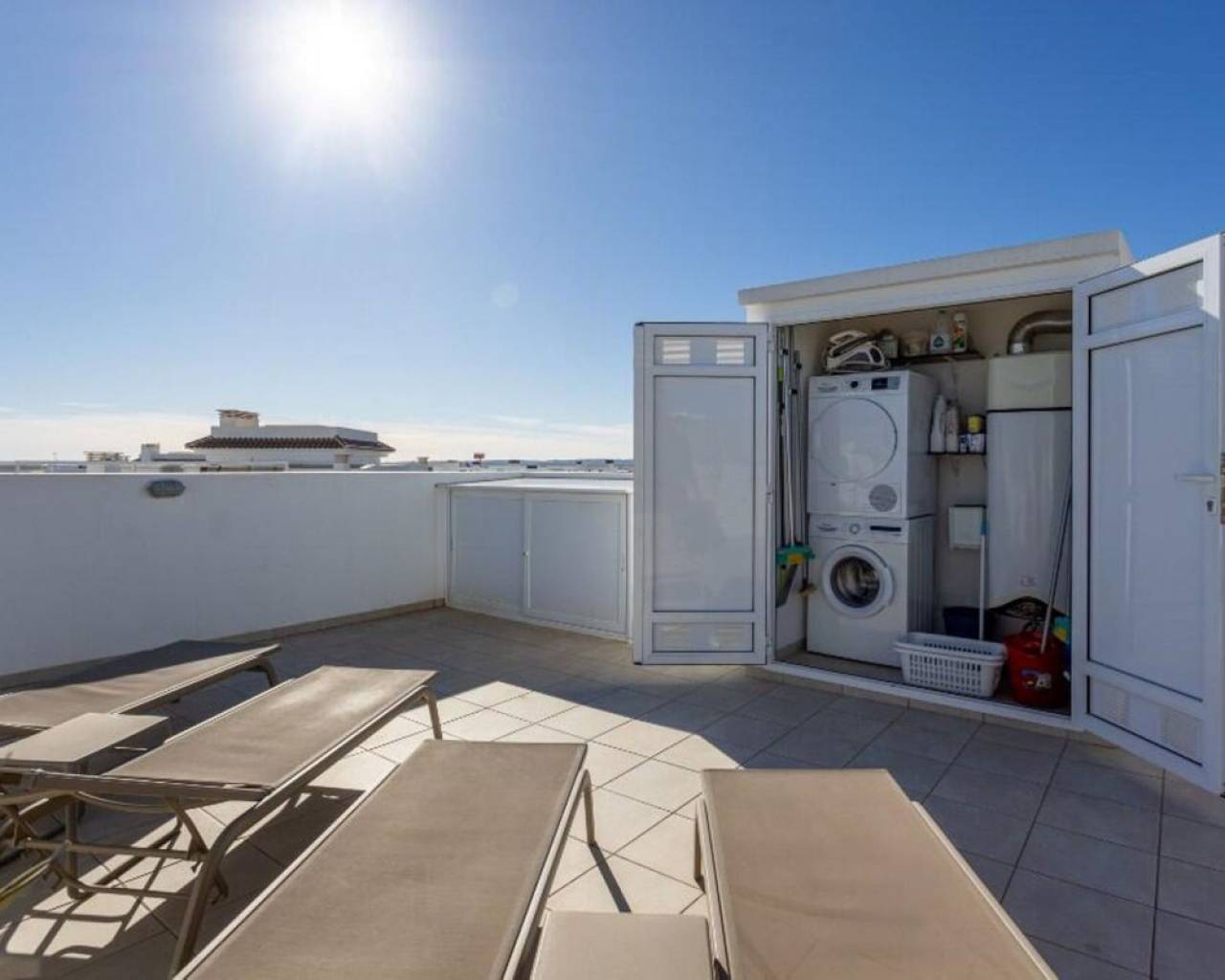 Enclavado en la impresionante Costa Blanca Sur, en la encantadora localidad de Rojales/Quesada, el ático 'Allegra' promete un refugio excepcional. A un paso del balneario de Torrevieja y cerca de la encantadora Guardamar del Segura, con sus hermosas playas de arena, este ático ofrece una accesibilidad inigualable. Con el Aeropuerto de Alicante-Elche convenientemente ubicado a solo 30 minutos, llegar a este hermoso destino es pan comido. El ático 'Allegra' presenta un meticuloso diseño con interiores modernos y está equipado con todas las comodidades modernas, ofreciendo un ambiente cálido y acogedor que le hará sentirse como en casa al instante. La propiedad cuenta con dos amplios dormitorios completamente amueblados, dos modernos baños y una cocina totalmente equipada. El amplio salón está decorado con muebles muy cómodos, y podrá disfrutar de su tiempo libre en dos terrazas, incluyendo un balcón con una mesa y cuatro sillas y una terraza excepcionalmente grande en la azotea. Desde aquí, podrá disfrutar de las impresionantes vistas a la laguna y al hermoso jardín con tres amplias piscinas comunitarias. Para quienes buscan comodidades adicionales, hay un parque infantil, gimnasio y pistas de tenis gratuitas en las inmediaciones. La terraza de la azotea es especialmente impresionante, con una amplia mesa de comedor con seis sillas bajo un toldo retráctil, un acogedor conjunto de salón, tumbonas, una cocina exterior completa con barbacoa, nevera y fregadero, así como una ducha exterior con agua fría y caliente. Además, el ático ofrece aparcamiento exterior seguro con tres puertas eléctricas y una plaza de aparcamiento privada, lo que garantiza tranquilidad durante toda su estancia. El ático 'Allegra' personifica la vida de lujo con su combinación de confort moderno, impresionantes vistas y cómodo acceso a lo mejor de la Costa Blanca Sur.