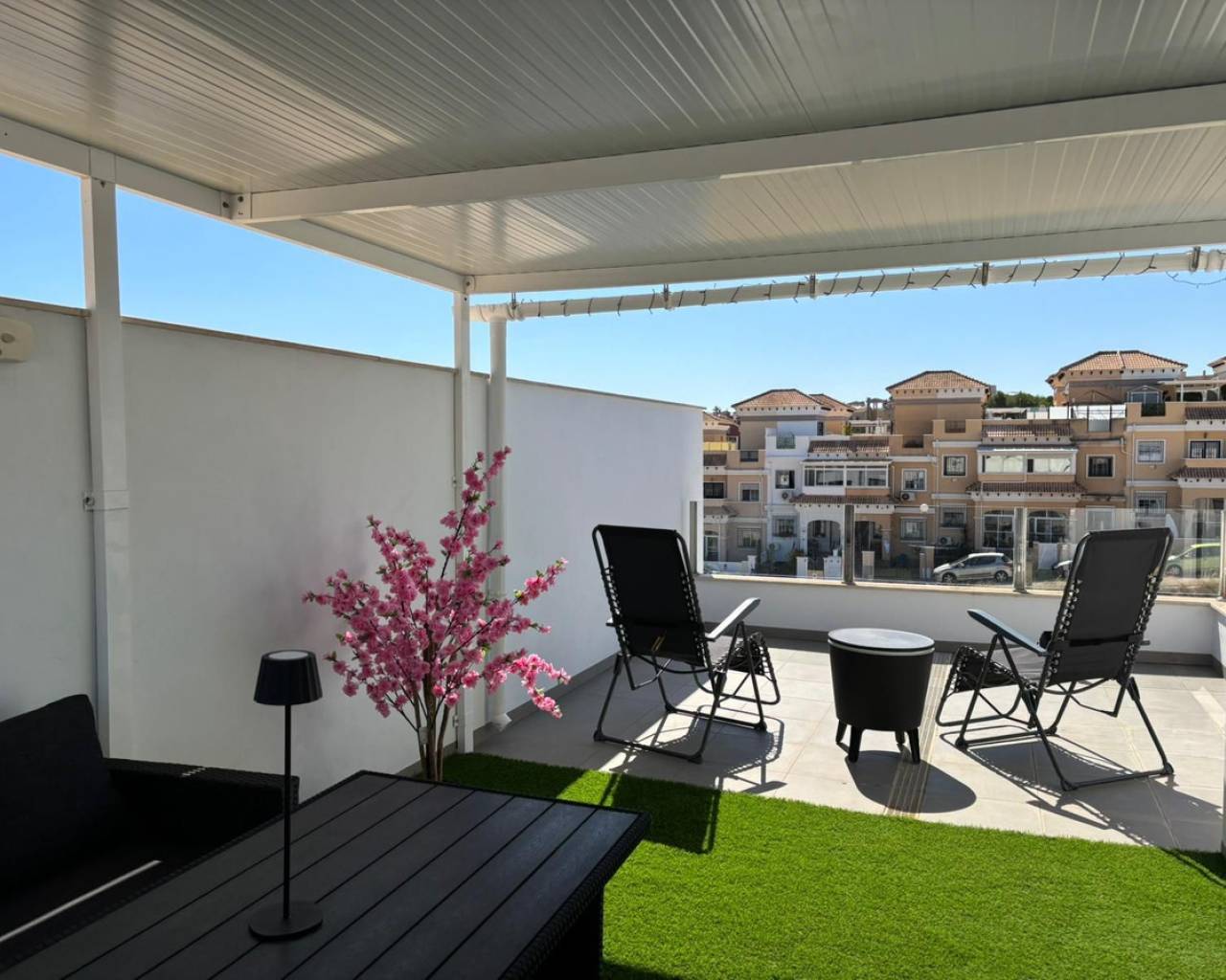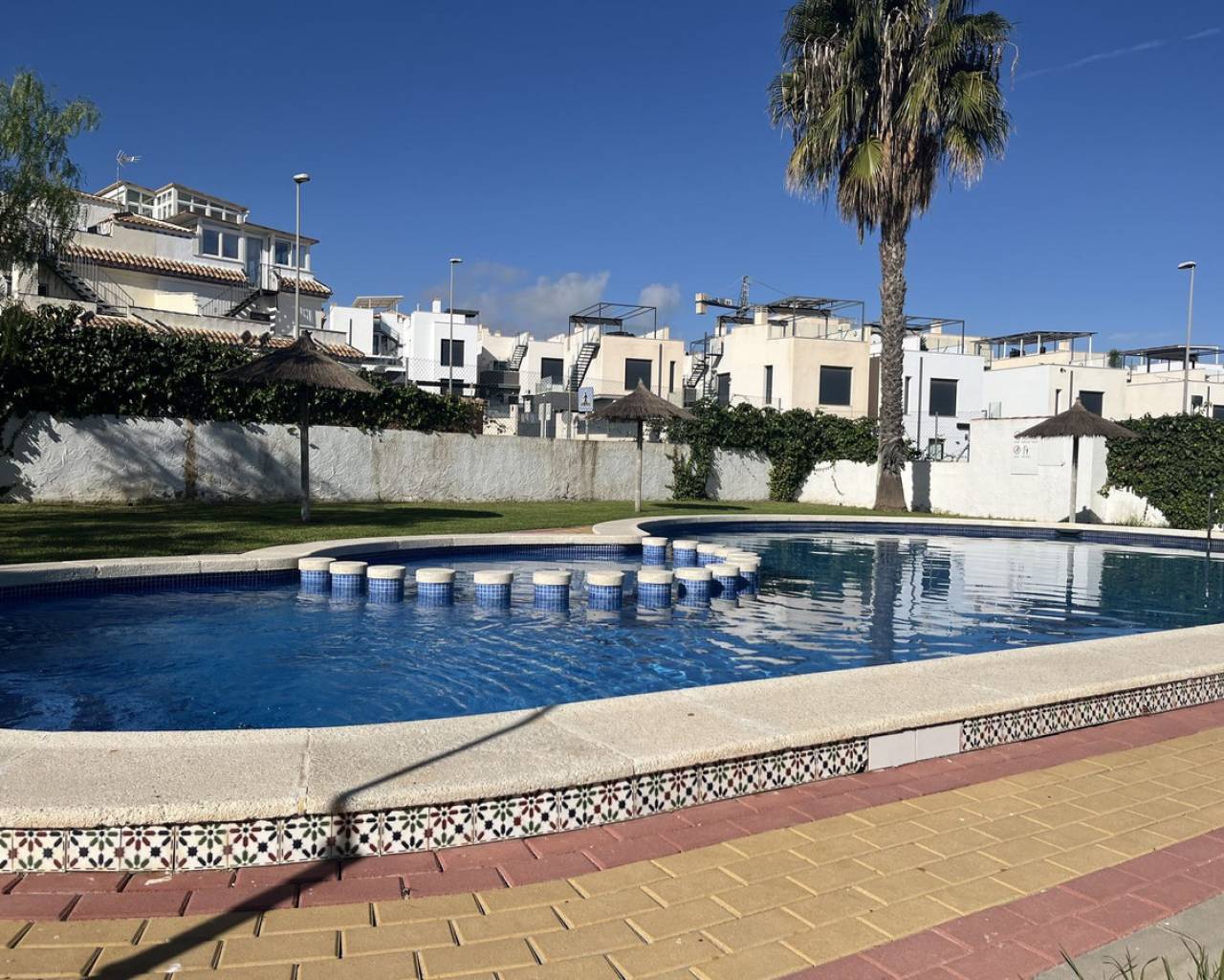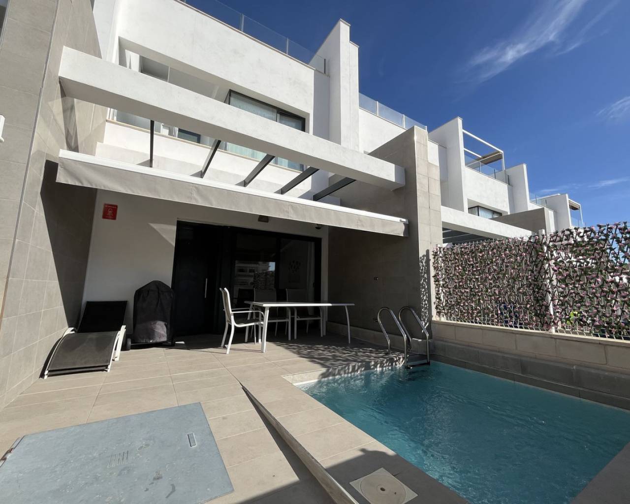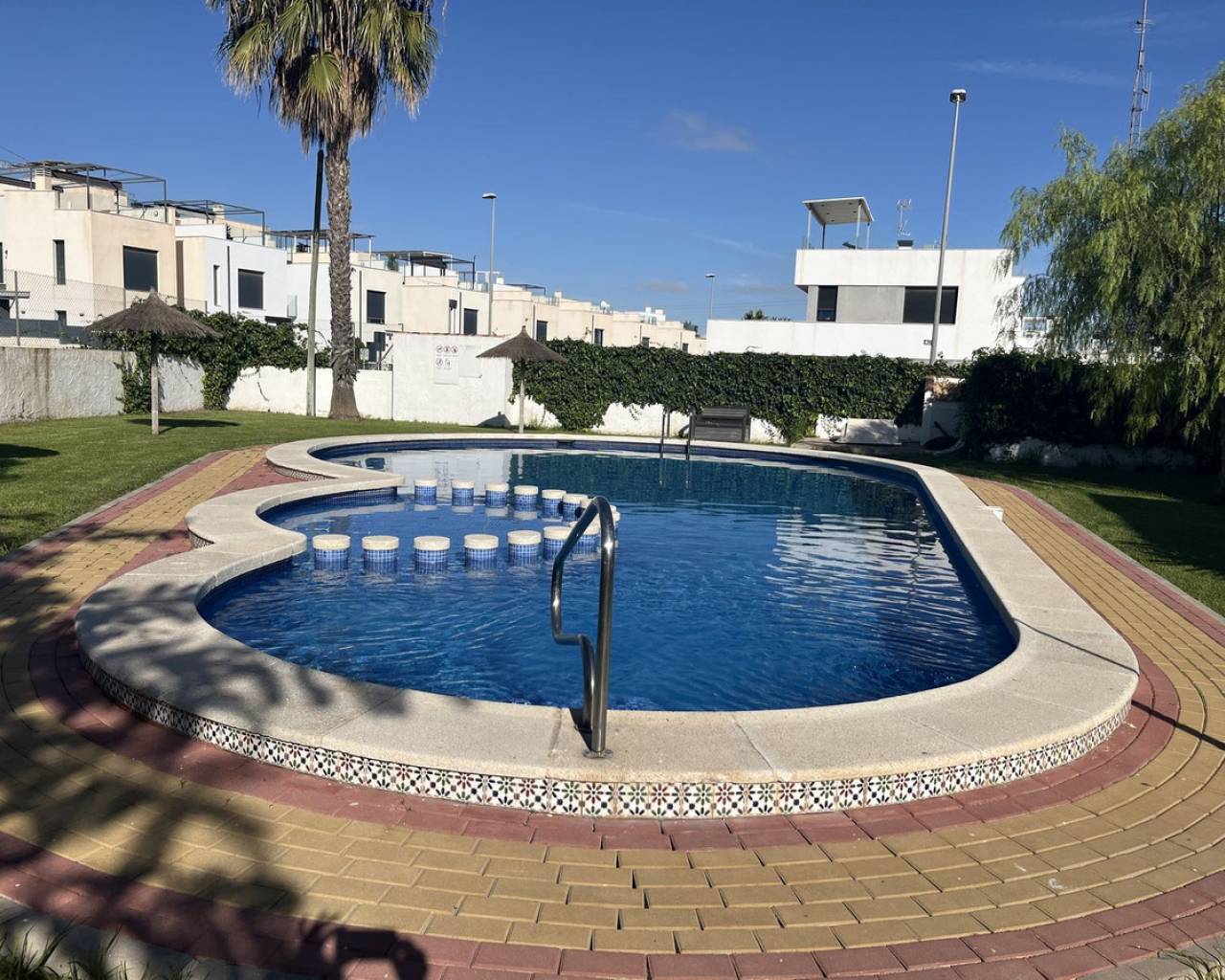 Casa adosada de 3 dormitorios con orientación sur, piscina privada y piscina comunitaria. Descubra el confort contemporáneo en esta impresionante casa adosada de 3 dormitorios y 3 baños, diseñada a la perfección para una vida moderna y relajada. Cada amplio dormitorio cuenta con su propio baño privado, ofreciendo máxima privacidad y comodidad para sus invitados. Disfrute al máximo de la vida al aire libre con su propia piscina privada, además de acceso a una piscina comunitaria impecablemente mantenida, rodeada de jardines paisajísticos, ideal para refrescarse en los días cálidos. Contemple las impresionantes vistas desde el espacioso solárium en la azotea, perfecto para tomar el sol o cenar en privado. La casa, orientada al sur, recibe abundante luz natural durante todo el día, creando un ambiente cálido y acogedor. Ubicación ideal a poca distancia de todos los servicios locales. La propiedad cuenta con licencia turística, ideal para inversión o alquiler vacacional.