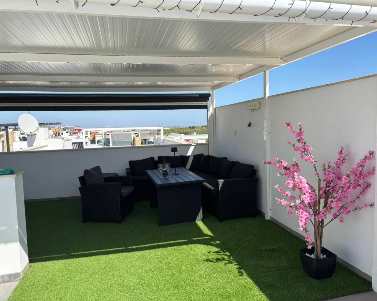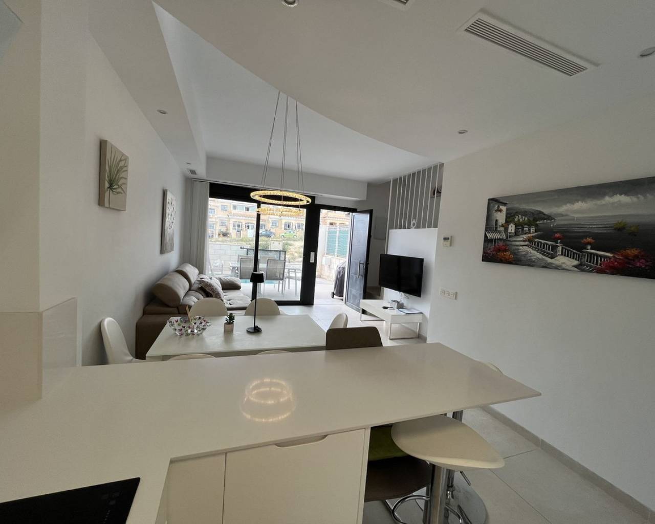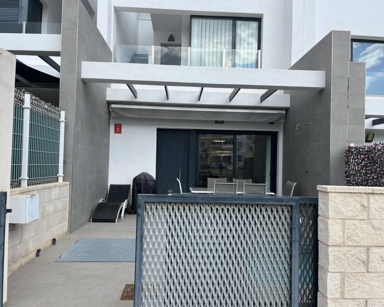 Casa adosada de 3 dormitorios con orientación sur, piscina privada y piscina comunitaria. Descubra el confort contemporáneo en esta impresionante casa adosada de 3 dormitorios y 3 baños, diseñada a la perfección para una vida moderna y relajada. Cada amplio dormitorio cuenta con su propio baño privado, ofreciendo máxima privacidad y comodidad para sus invitados. Disfrute al máximo de la vida al aire libre con su propia piscina privada, además de acceso a una piscina comunitaria impecablemente mantenida, rodeada de jardines paisajísticos, ideal para refrescarse en los días cálidos. Contemple las impresionantes vistas desde el espacioso solárium en la azotea, perfecto para tomar el sol o cenar en privado. La casa, orientada al sur, recibe abundante luz natural durante todo el día, creando un ambiente cálido y acogedor. Ubicación ideal a poca distancia de todos los servicios locales. La propiedad cuenta con licencia turística, ideal para inversión o alquiler vacacional.