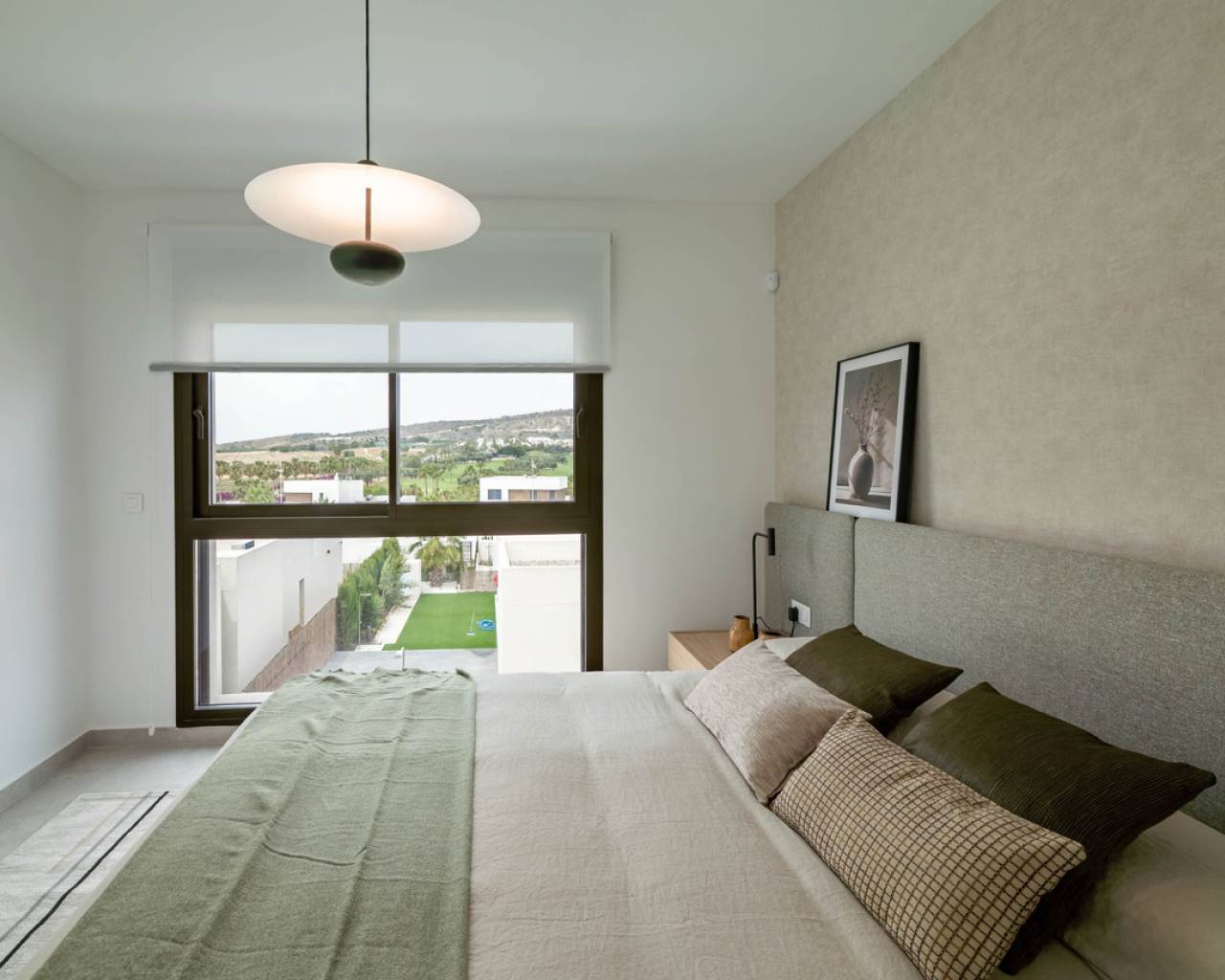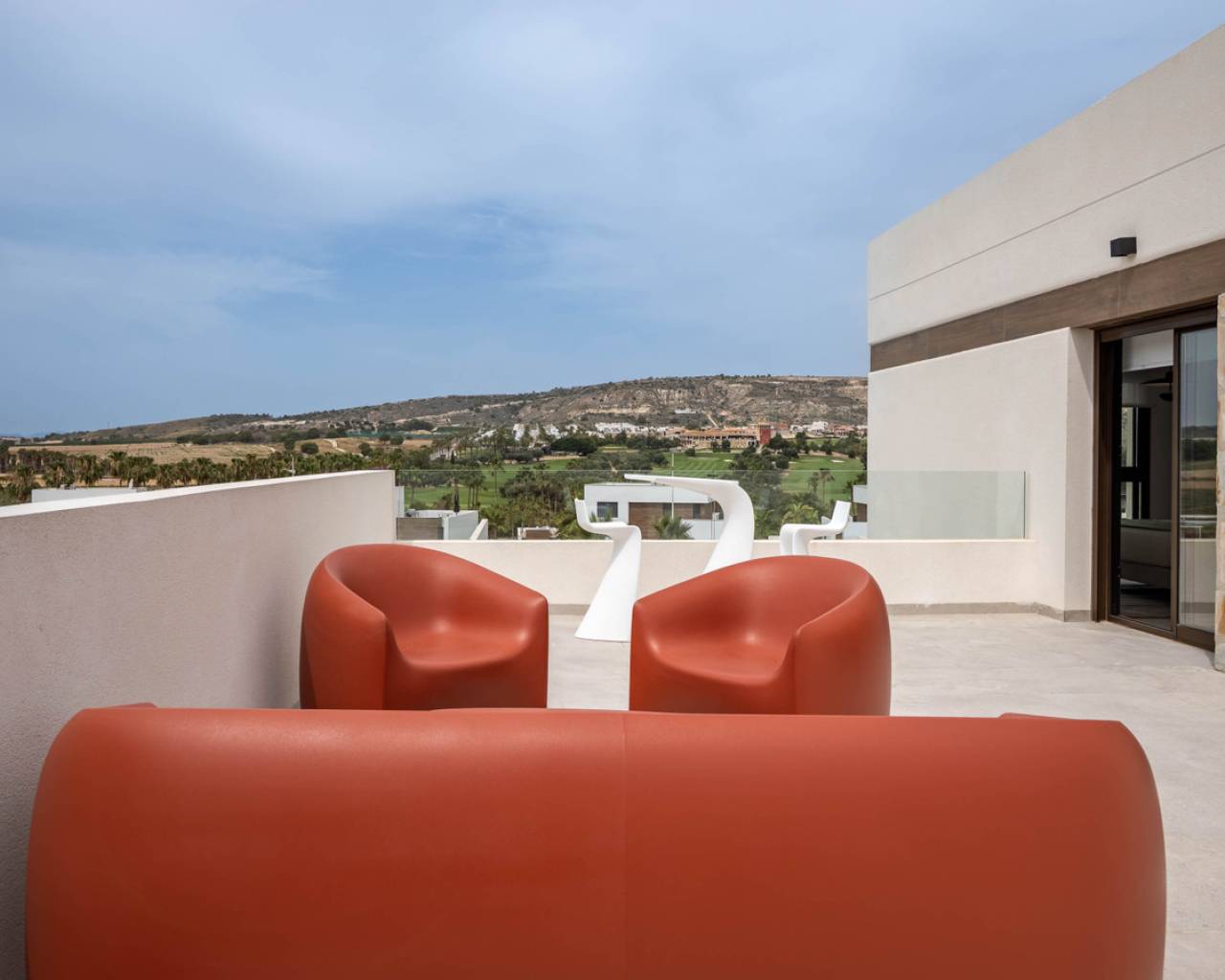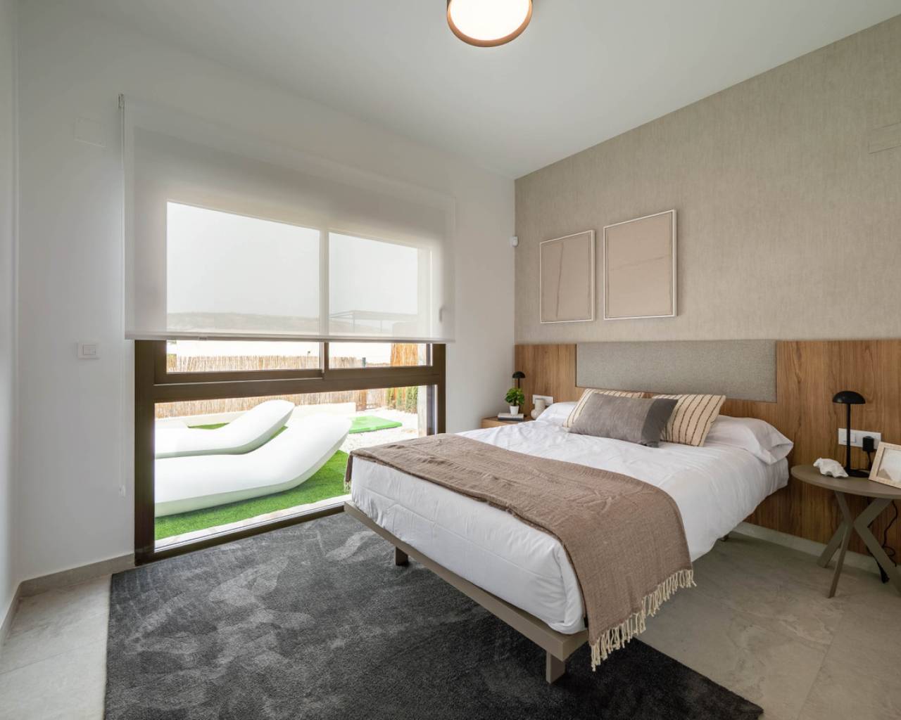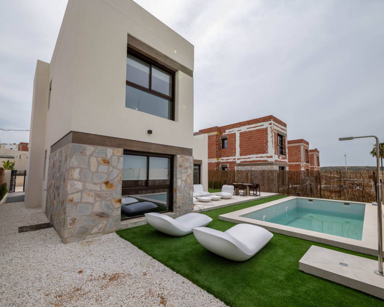 Estas Villas están situadas en Algorfa en el entorno de uno de los Resorts de 5 estrellas con campo de golf más exclusivos de España en el extremo sur de la provincia de Alicante. Su privilegiada ubicación junto a La Finca Golf & Spa Resort permite disfrutar de todos los servicios que ofrece el complejo. Además, se encuentra próximo a las más bellas playas del sur de la Costa Blanca y a lugares de excepcional belleza como las Salinas Rosadas de Torrevieja y las Dunas de Guardamar del Segura. Su proximidad y fácil acceso a la autopista AP-7 y a las principales carreteras nacionales conectan estas villas con numerosas localidades de la Costa Blanca, como Orihuela, Cartagena, Elche, Murcia y Alicante. Los aeropuertos de Alicante y Murcia están a menos de 40 km y ofrecen conexiones con las principales capitales europeas. Alicante, la capital de la provincia, está a menos de una hora en coche. El nuevo proyecto consta de 6 villas, cada una con 3 dormitorios y 2 baños en dos niveles, incluyendo una cocina totalmente equipada y una piscina privada. Características como aparcamiento interior privado, persianas eléctricas, aire acondicionado por conductos, un sistema domótico de gestión y un sistema de alarma totalmente equipado son algunas de las principales especificaciones de esta exclusiva promoción. Sol todo el día. Las propiedades de concepto abierto con ventanas y puertas correderas que permite la ventilación cruzada y deja entrar la luz. Las viviendas están situadas de tal forma que la luz entra por todas partes, pero al mismo tiempo ofrecen rincones frescos y acogedores. Diseño Exclusividad con diseño contemporáneo Estas villas nos conectan con las antiguas culturas mediterráneas y la tradición constructiva combinada con la arquitectura moderna para crear hogares con encanto, reflejando nuestro compromiso y esfuerzo por ofrecerle lo mejor en espacio y tendencias de diseño. El diseño combina líneas modernas con elementos tradicionales como la piedra en la fachada y la madera, añadiendo la calidez de la construcción tradicional. La distribución de las viviendas maximiza el aprovechamiento de la luz solar natural a lo largo del día y potencia la privacidad y la ventilación cruzada.
