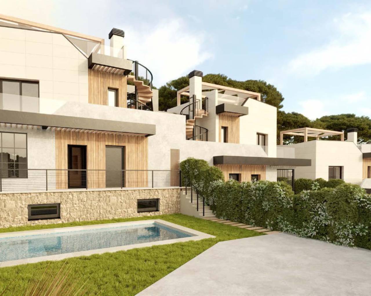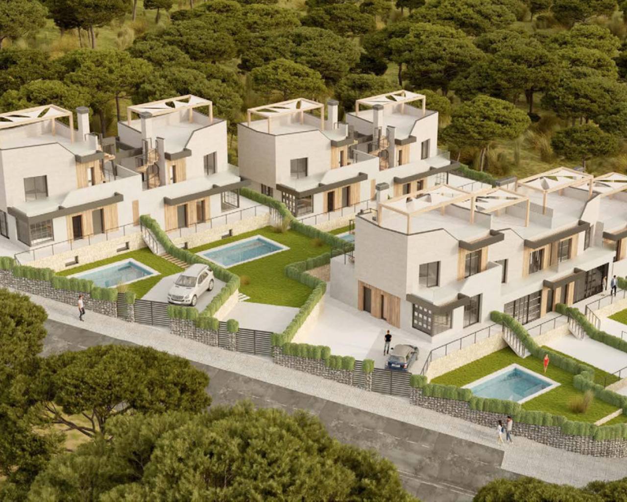 El residencial está diseñado con un enfoque en el usuario, dando prioridad al confort y a la calidad vital de sus espacios, con amplias y abiertas zonas comunes, así como completas áreas privadas, que incluyen baños, grandes terrazas o espacios de almacenamiento. Compuesto por 8 espaciosas y luminosas villas, el desarrollo se divide en cuatro alternativas de tipología de vivienda, con 3 dormitorios y 2 baños distribuidos en dos plantas. Sus parcelas pueden alcanzar hasta 412 m². Siente la libertad de estar rodeado de naturaleza a través de los grandes ventanales con vistas a las montañas y disfruta de la tranquilidad, la relajación y las magníficas temperaturas de esta zona mediterránea durante todo el año.