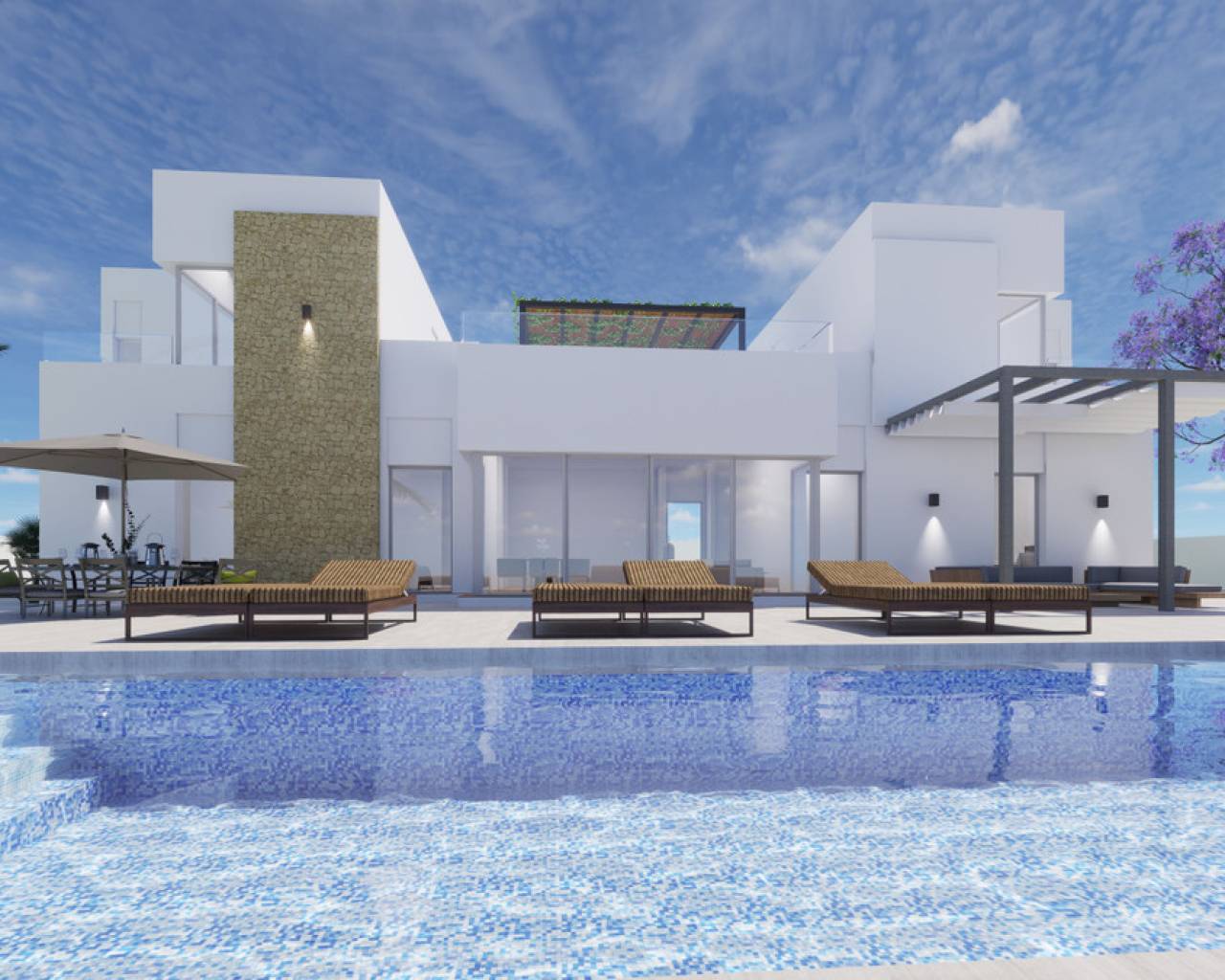 Villa de diseño contemporáneo en dos plantas de 6 dormitorios y 4 baños, en parcela de 1.147 m2 ubicado en la zona de Aguas Nuevas en Torrevieja.