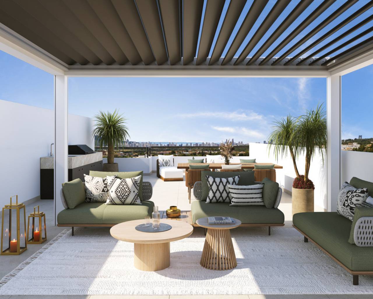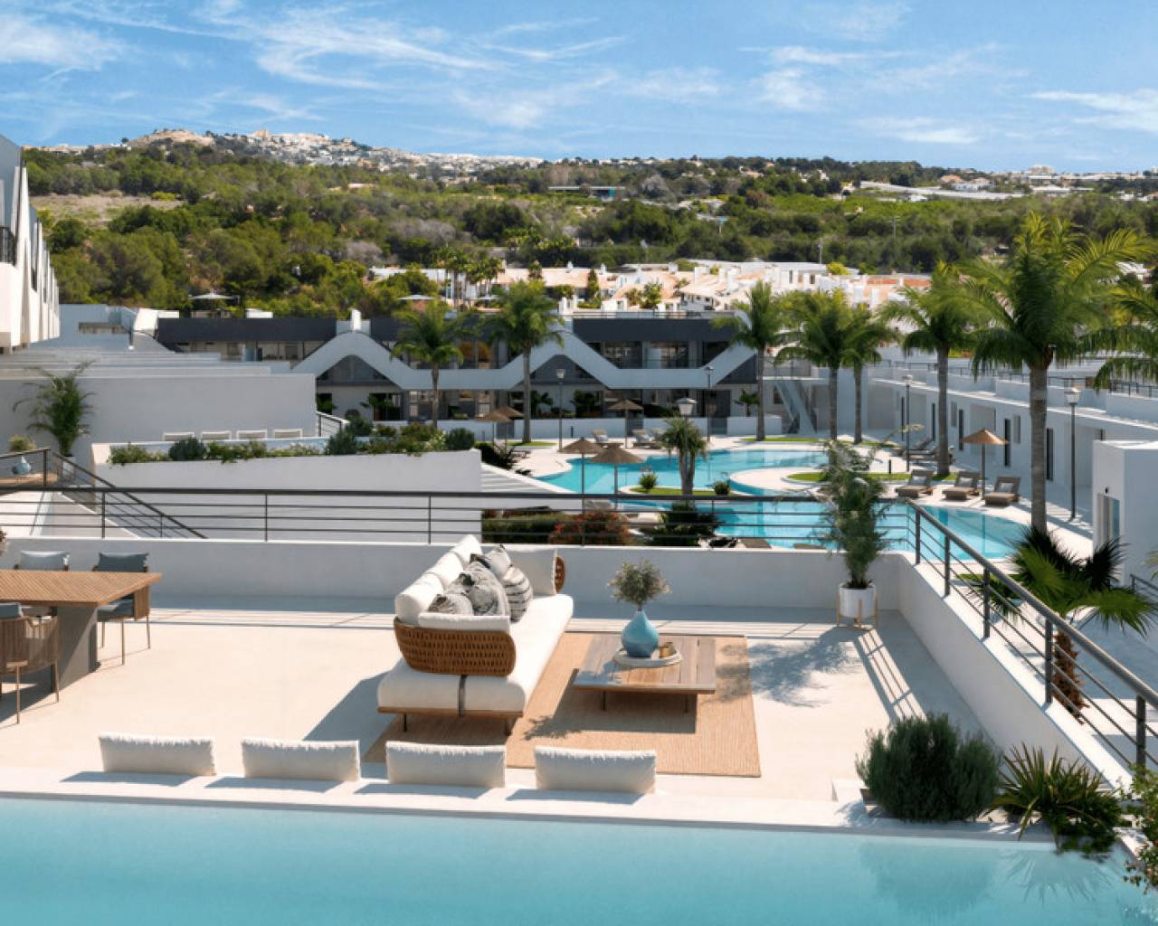 Presentamos un exclusivo complejo residencial en una zona elevada de Alfaz del Pi, rodeado de naturaleza mediterránea y con todos los servicios necesarios para la vida cotidiana. Este exclusivo proyecto de 123 apartamentos ha sido diseñado para quienes buscan tranquilidad, bienestar y un entorno cuidadosamente mantenido. Cada vivienda ofrece espacios pensados para el confort, con amplias terrazas, zonas ajardinadas y acceso a una piscina comunitaria, todo dentro de un ambiente diseñado para relajarse y disfrutar del exterior los 365 días del año. El diseño se complementa con zonas comunes que mejoran la experiencia de vida. Los apartamentos de 1, 2 y 3 dormitorios, predominantemente de 2 dormitorios, están diseñados con salones amplios y cocinas abiertas, grandes ventanales y acceso directo a terrazas orientadas al sur que llenan cada espacio de luz natural. Los dormitorios principales ofrecen amplitud y acabados de alta calidad. La mayoría de las unidades cuentan con jardín privado o solárium, perfectos para disfrutar del exterior en un ambiente privado y tranquilo. Para quienes buscan una experiencia aún más exclusiva, existe la opción de añadir jacuzzi o piscina privada. Además, cada propiedad incluye una plaza de aparcamiento privada para su máxima comodidad. Un diseño contemporáneo, funcional y acogedor que combina espacio, luminosidad y una verdadera conexión con el entorno mediterráneo.