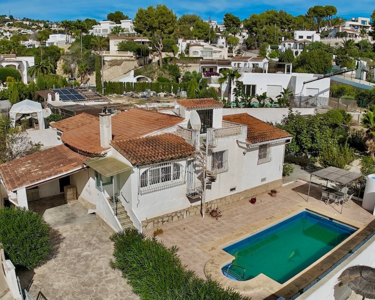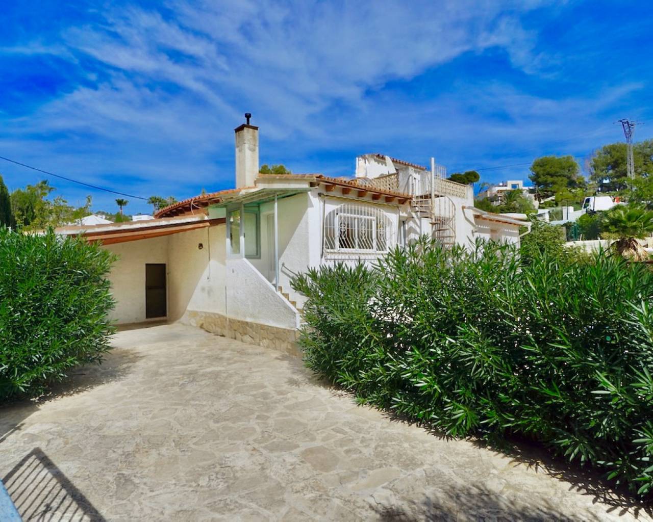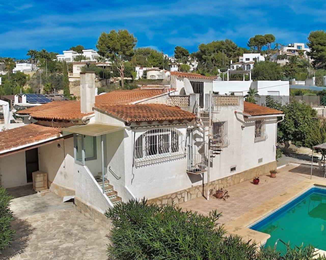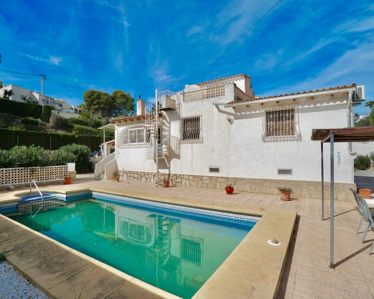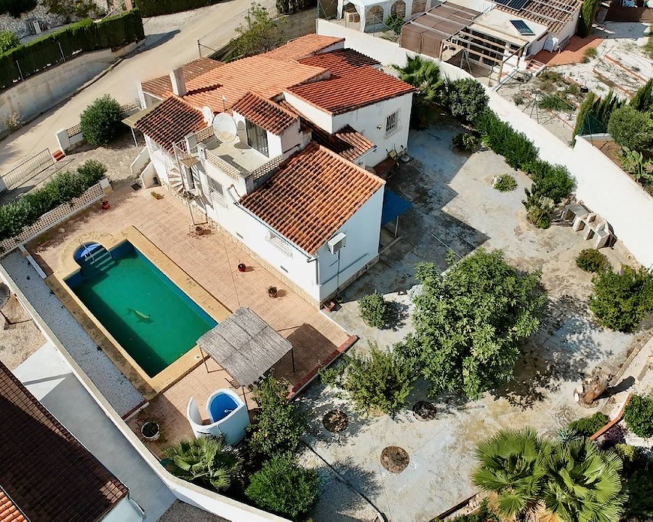 Villa en venta en La Fustera, Benissa, a solo 1 km de la playa y los servicios. Situada en una de las zonas más cotizadas de Benissa Costa, esta villa de estilo tradicional ofrece una excelente oportunidad para crear una encantadora casa mediterránea a pocos pasos de la playa, los restaurantes y las tiendas. Situada en una parcela llana de 822 m² con orientación sur y una superficie construida total de 110 m², la propiedad disfruta de un entorno tranquilo en una zona residencial bien establecida. La villa se distribuye en una sola planta y cuenta con tres dormitorios, dos baños y una oficina adicional que se puede convertir fácilmente en un cuarto dormitorio. La luminosa zona de salón, comedor y cocina de planta abierta incluye una chimenea con estufa de pellets, que crea un ambiente acogedor, mientras que la naya acristalada ofrece un lugar perfecto para disfrutar de las vistas al jardín durante todo el año. En el exterior, la villa cuenta con un jardín rústico de bajo mantenimiento, una piscina de 4x8 m y una cochera. Una escalera conduce a una terraza en la azotea con vistas parciales al mar, ideal para relajarse al sol. La propiedad está equipada con armarios empotrados y se beneficia de una distribución práctica llena de luz natural. Esta villa tiene un gran potencial para convertirse en un hermoso refugio costero en una ubicación privilegiada cerca de todos los servicios. Características principales: • Ubicación privilegiada: 1 km de la playa, tiendas y restaurantes. • Villa de una sola planta con encanto tradicional. • 3 dormitorios, 2 baños + despacho (posibilidad de cuarto dormitorio). • Salón, comedor y cocina diáfanos con chimenea de pellets. • Naya acristalada para uso durante todo el año. • Piscina de 4x8 m y azotea con vistas al mar. • Orientación sur, luminosa y soleada. • Cochera y trastero. • Jardín rústico y de fácil mantenimiento. • Armarios empotrados. • Gran potencial de renovación. Una villa acogedora y luminosa con carácter, perfectamente situada en una de las zonas más deseadas de Benissa Costa, ideal como casa de vacaciones o proyecto de renovación.Póngase en contacto con nosotros para concertar una visita.