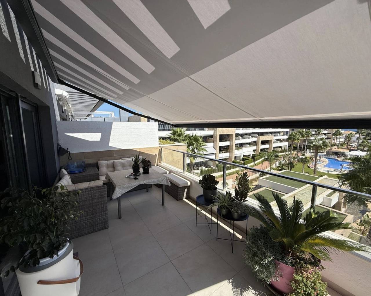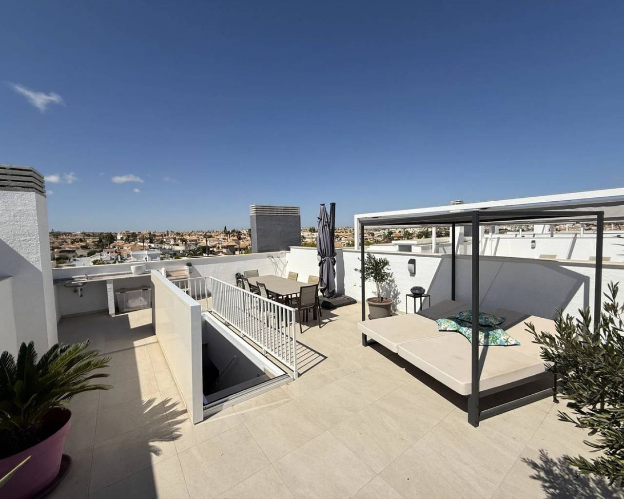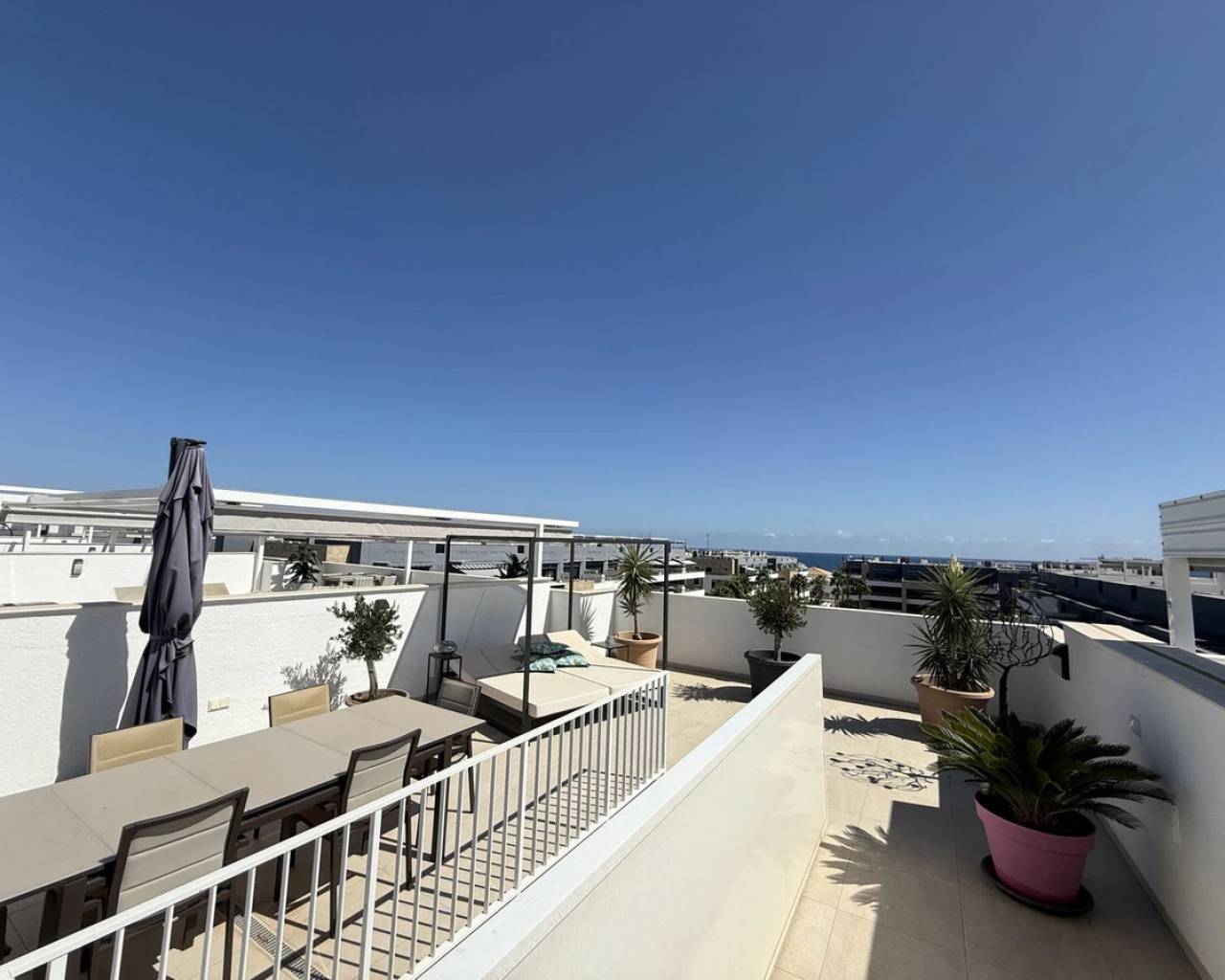 Impresionante ático de 2 dormitorios y 2 baños con amplio solárium, aparcamiento seguro y trastero en Playa Flamenca Village. Presentamos este ático seminuevo, de tan solo un año de antigüedad y con orientación sur, ubicado en la codiciada urbanización de Playa Flamenca. Esta propiedad ofrece la combinación perfecta de vida moderna y comodidades de resort. Dentro de las comunidades cerradas, los residentes disfrutan de acceso exclusivo a cuatro piscinas, jardines, gimnasio, área de juegos para niños, sauna, jacuzzi y un bar, todo esto a solo unos pasos de su puerta. El apartamento dispone de: 2 dormitorios luminosos (uno con baño en suite) 2 baños modernos 80m² construidos Amplia cocina abierta y sala de estar. Amplio balcón privado con vistas al mar, a la piscina y al jardín. Amplio solárium en la azotea de 68 m², perfecto para entretenerse o relajarse bajo el sol. Plaza de aparcamiento privado subterráneo con trastero seguro de 7m² Con aire acondicionado por conductos, doble acristalamiento, armarios empotrados, ascensor y persianas eléctricas , esta casa está diseñada para la comodidad y conveniencia. La ubicación es inmejorable, a poca distancia de Playa Flamenca, de las populares zonas comerciales, del vibrante mercado local y de una amplia gama de restaurantes y opciones de ocio. Una vez aparcado el coche, todo lo que necesita está a la vuelta de la esquina. Este ático contemporáneo de 80 m² es ideal como residencia permanente, casa de vacaciones o propiedad de inversión.