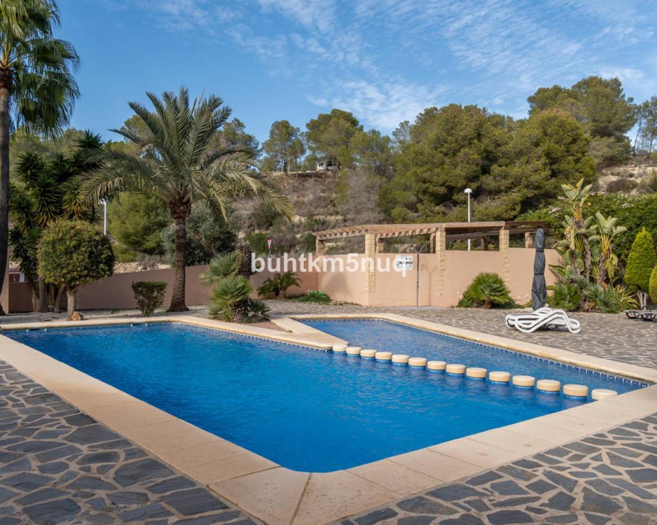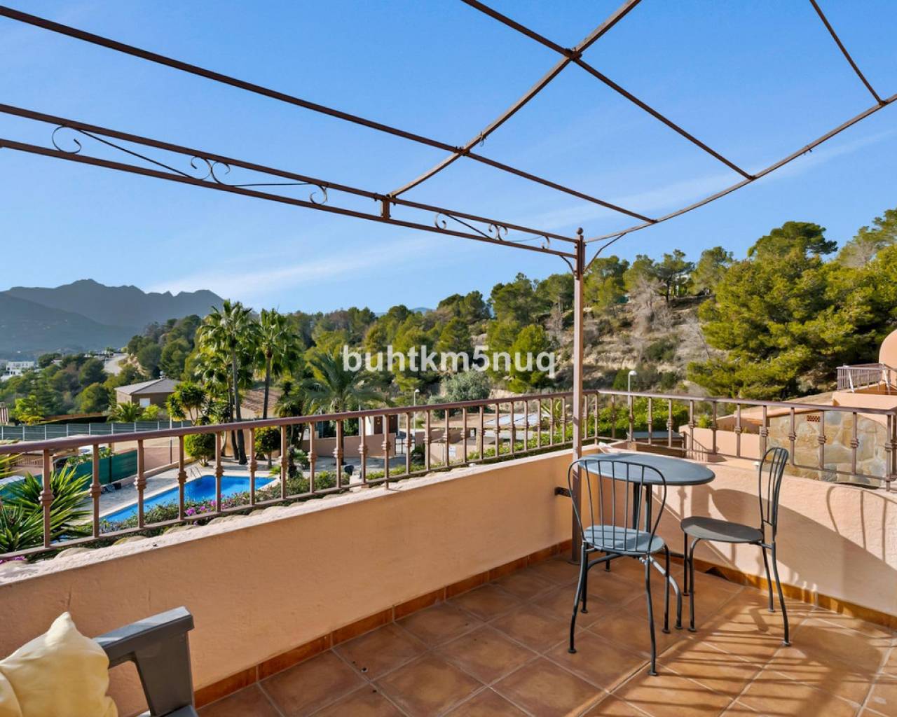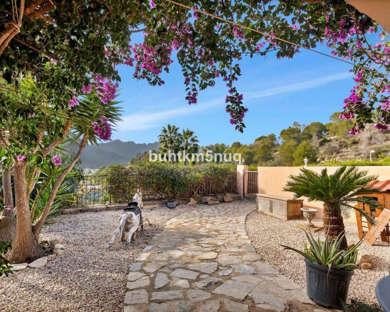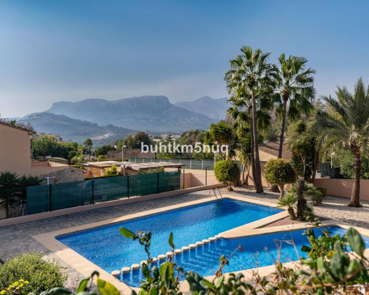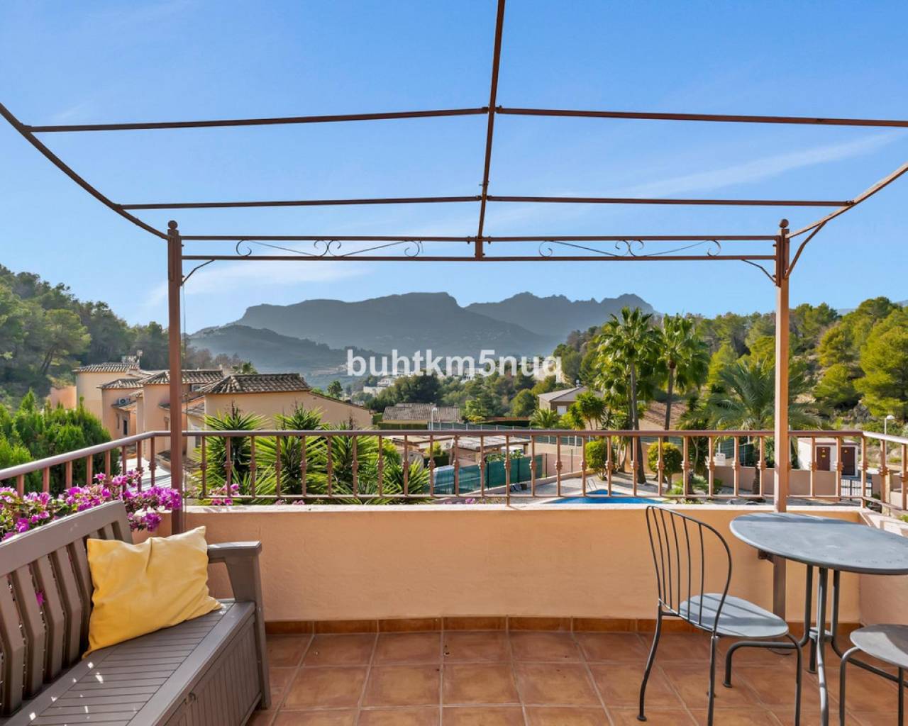 Acogedor adosado esquina con tres dormitorios, situado en una zona residencial tranquila y verde en Calpe. La propiedad forma parte de un pequeño y cuidado complejo con piscina comunitaria y cuenta con su propia pérgola.~La vivienda ofrece buenas y agradables características básicas, como doble acristalamiento, excelente orientación y una distribución cómoda y práctica. Gracias a su ubicación favorable, se puede disfrutar del sol durante todo el día y de unas preciosas vistas a la montaña, creando una sensación de vida relajada y agradable.~Con aproximadamente 90 m2 de superficie útil, varias terrazas y una parcela privada con jardín mediterráneo, esta es una casa encantadora para quienes buscan tranquilidad, espacio y comodidad, a pocos minutos en coche del centro y las playas de Calpe.