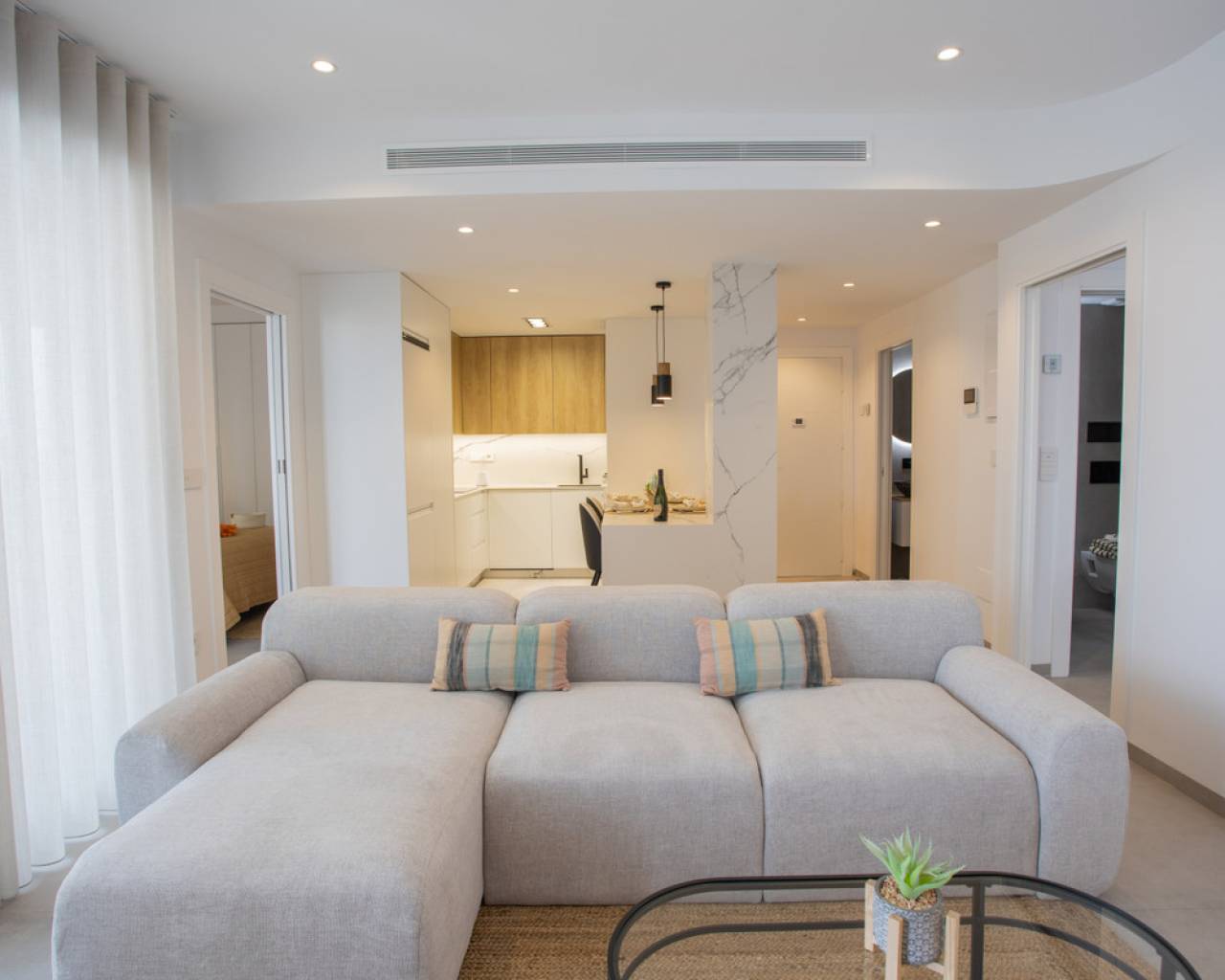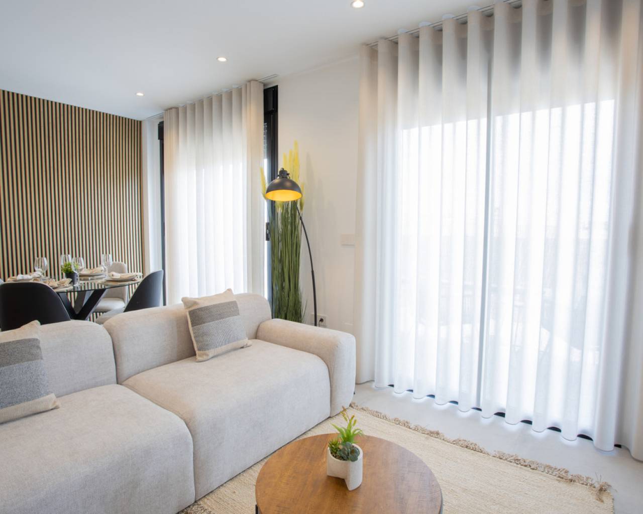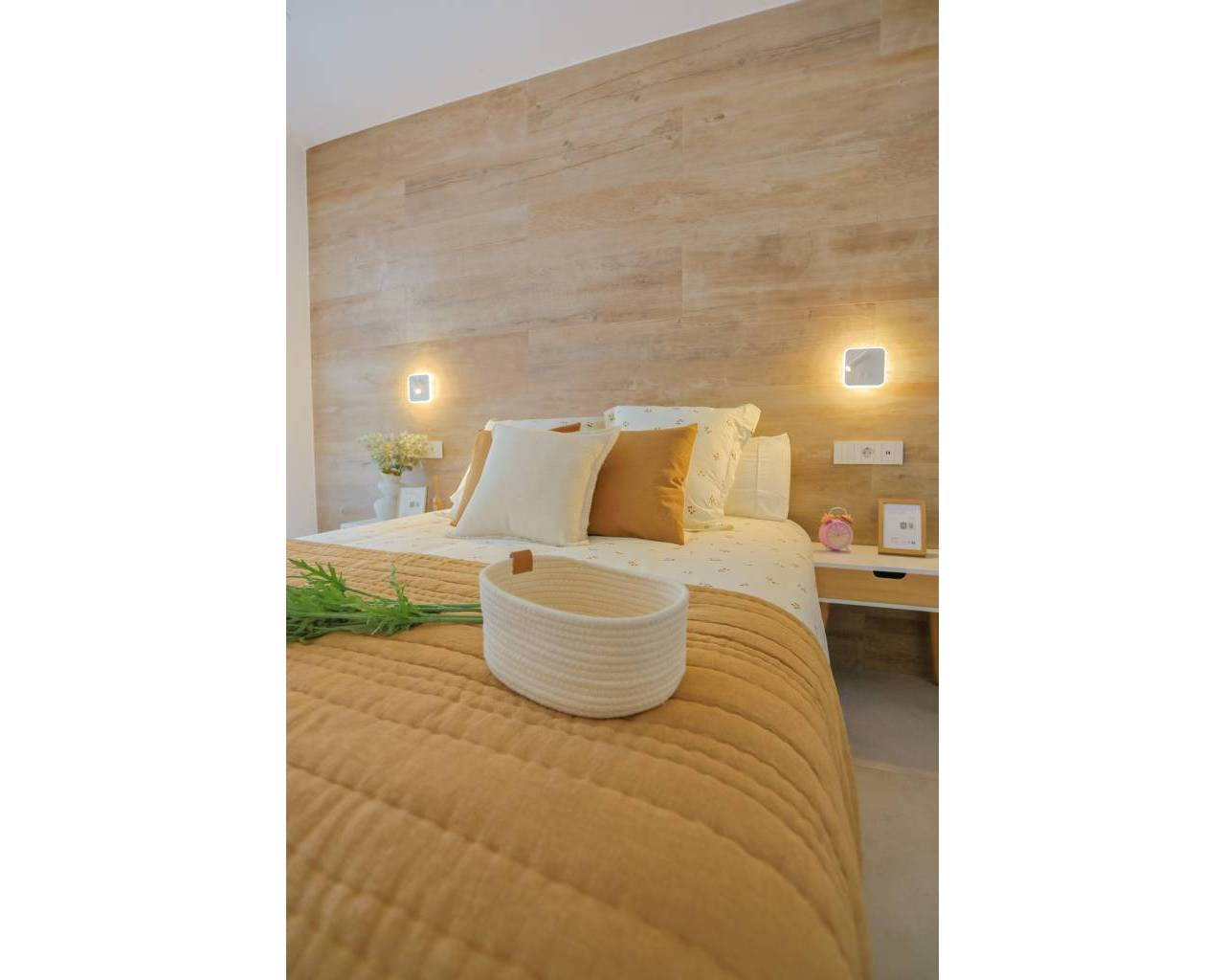 Este desarrollo es un grupo de viviendas modernas completamente equipadas de dos y tres dormitorios, a solo dos minutos a pie del centro de San Pedro del Pinatar. Las viviendas del último piso tienen un gran solárium con cocina exterior. Las viviendas del primer piso disponen de una amplia terraza. COMPROMISO CON LA SOSTENIBILIDAD Las zonas comunes disfrutan de la máxima luz solar. La piscina tiene unas dimensiones de 115 m², con zona de baño y cama de agua. Se incluye una bomba de calor para calentar el agua y alargar la temporada de baño. VIDA AL AIRE LIBRE Los residentes pueden disfrutar de tomar el sol en el área de la piscina, rodeada de vegetación y diseñada para garantizar la máxima privacidad. LAS VIVIENDAS APARTAMENTOS DE DISEÑO SOFISTICADOS, DISCRETOS Y ATEMPORALES Las viviendas tienen dos y tres dormitorios, dos baños y una amplia zona de día, equipada con una generosa cocina y un salón-comedor abierto a la terraza con grandes ventanas que proporcionan continuidad entre el interior y el exterior, garantizando así la experiencia de vivir al aire libre. SABORES NATIVOS Las habitaciones son amplias y llenas de luz natural, con un toque elegante que aporta comodidad a los hogares. Las especificaciones del edificio aseguran que los materiales utilizados otorgan un acabado natural, con detalles en madera cálida y texturas que recuerdan a la naturaleza y en armonía con el entorno. El dormitorio principal tiene un baño interior. El baño está equipado con amplios espacios de almacenamiento y una ducha. *Nota: Paquete COMPLETO Apartamento + Plaza de Aparcamiento Abierta Estándar 10.000€