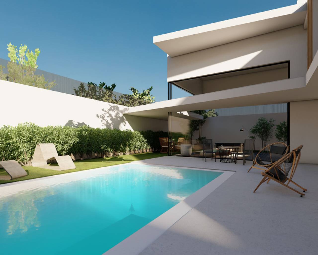 La vivienda cuenta con 3 dormitorios y 4 baños, cocina terminada con electrodomésticos, aire acondicionado y persianas eléctricas. Dispone de piscina privada de 6x3 m y ofrece la posibilidad de elegir pavimento, azulejos y muebles de baño, permitiendo personalizar la vivienda a tu gusto.