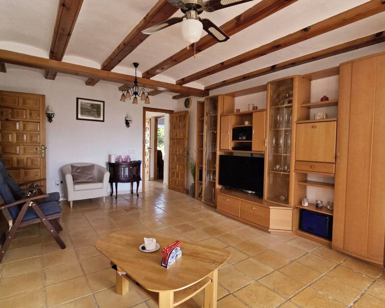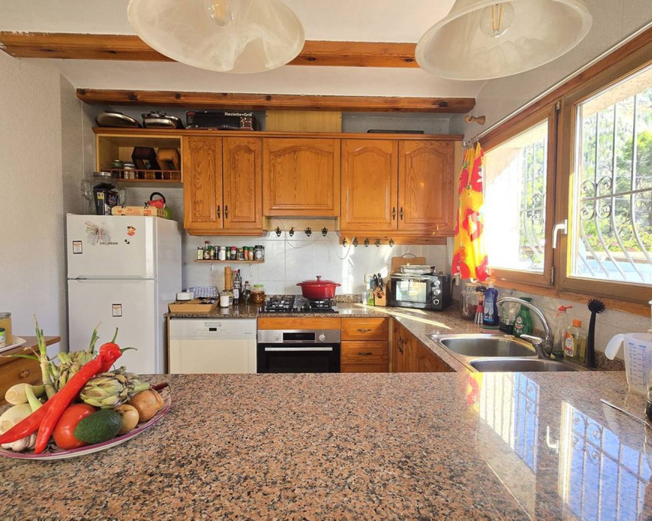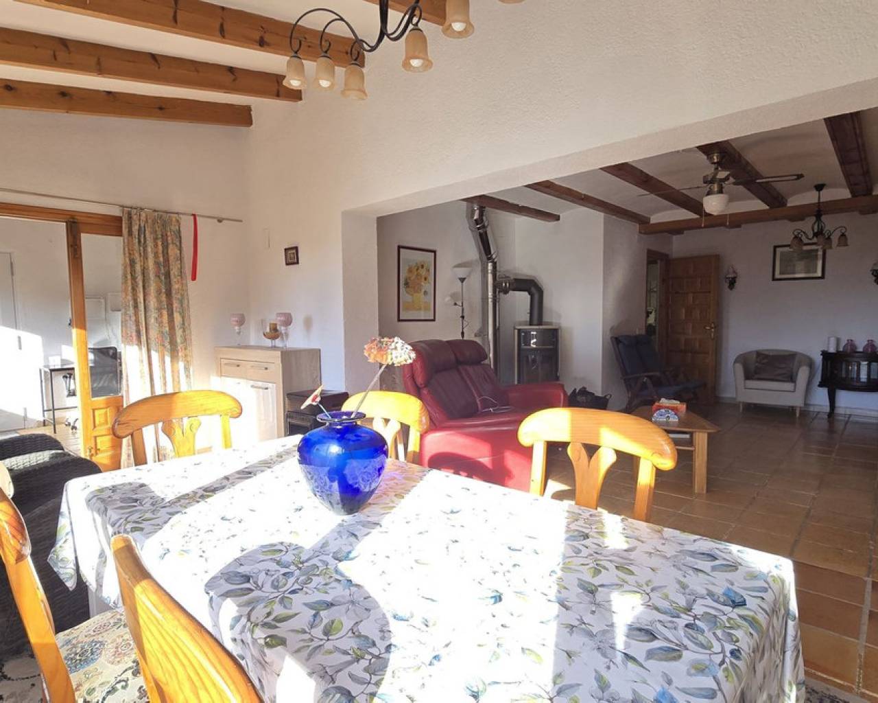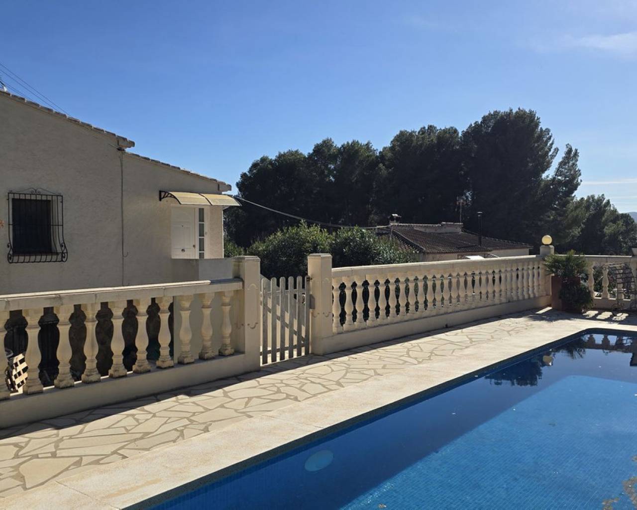 Esta villa, situada en un lugar tranquilo y soleado, ofrece una hermosa vista del Montgó y se destaca, entre otras cosas, por su ubicación cercana al campo de golf La Sella, así como por su buena conexión con Jávea, Jesús Pobre y Denia. La casa ofrece mucho espacio, privacidad y opciones de uso flexibles, ideal para familias, invitados o para combinar vivir y alquilar. La planta principal incluye un amplio y abierto salón-comedor, una cocina independiente completamente equipada con un pequeño rincón para desayunar, tres dormitorios con armarios empotrados y dos baños. Una estufa de pellets proporciona un calor y ambiente agradables; la mayoría de las ventanas son de doble acristalamiento y dos de los dormitorios cuentan con aire acondicionado. En el sótano se encuentra un apartamento independiente con tres dormitorios, salón, cocina y baño, ideal para visitantes o como unidad de vivienda completamente autónoma. La planta superior es fácilmente accesible desde la calle más alta, mientras que la superficie habitacional inferior con el apartamento independiente tiene su propio acceso desde la calle más baja. Esto crea dos áreas independientes, de fácil acceso, con óptima privacidad y uso flexible. Además, la villa cuenta con una piscina privada, terrazas soleadas, un carport en la planta superior y otro en el sótano, y amplios trasteros. Posee un buen aislamiento estructural, las instalaciones son de fácil acceso en la zona del sótano, lo que facilita el mantenimiento y posibles ajustes. Una villa versátil en una ubicación muy buena, donde el entorno tranquilo y la hermosa vista de la montaña contribuyen a un agradable ambiente residencial.