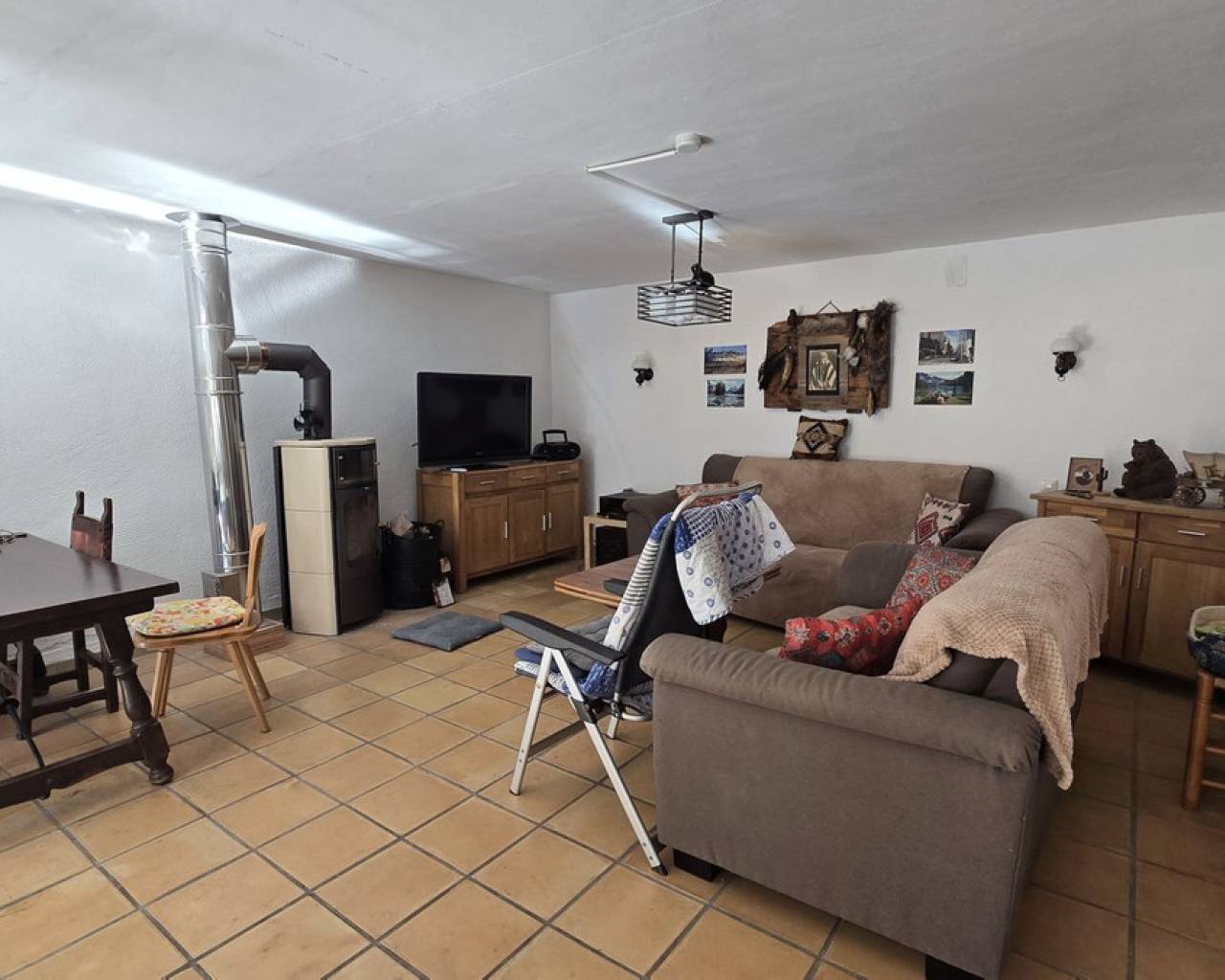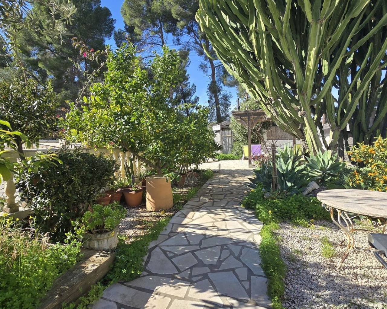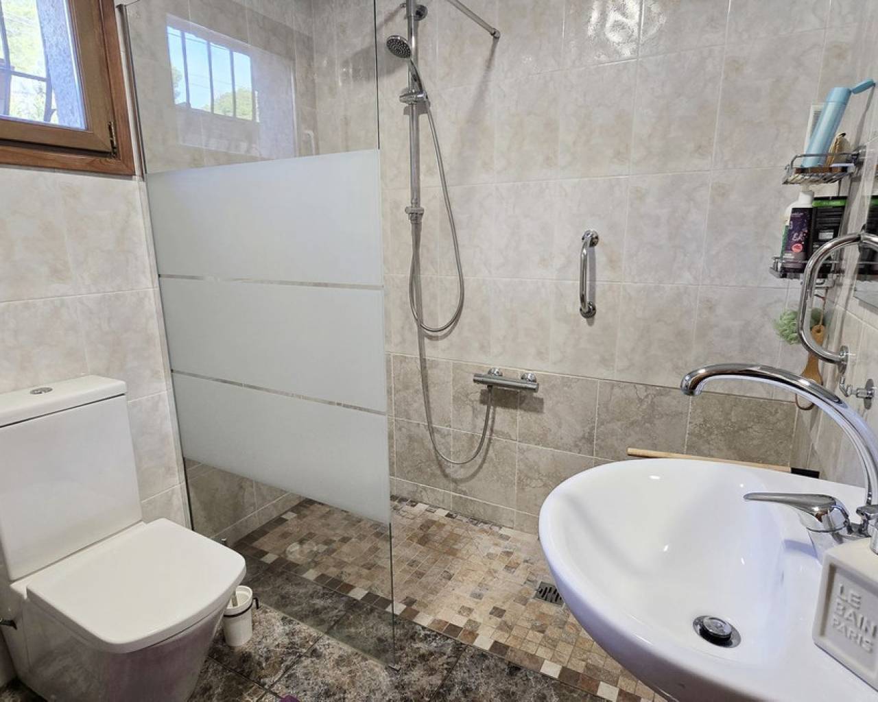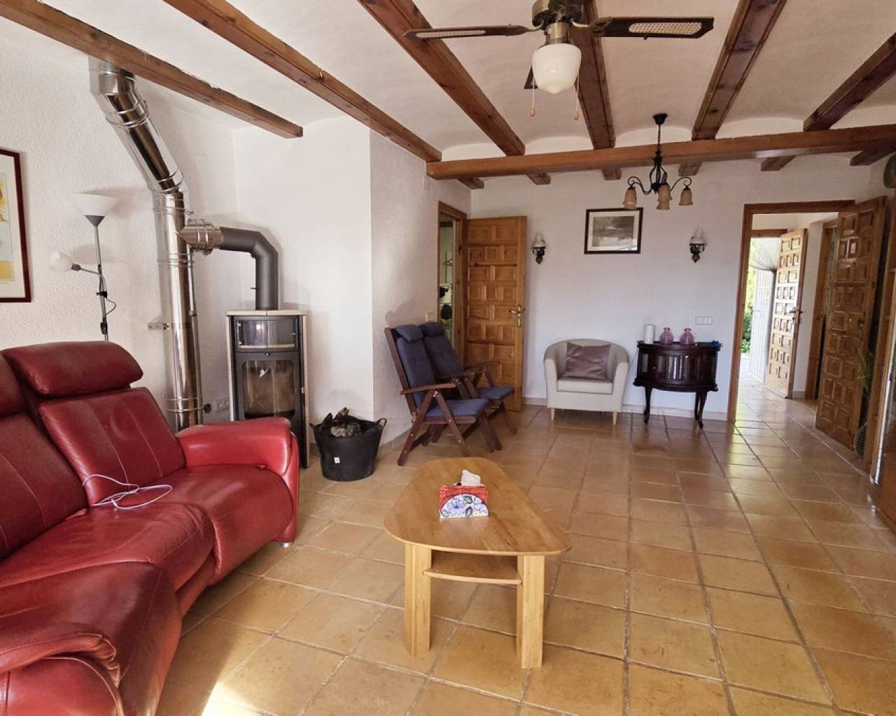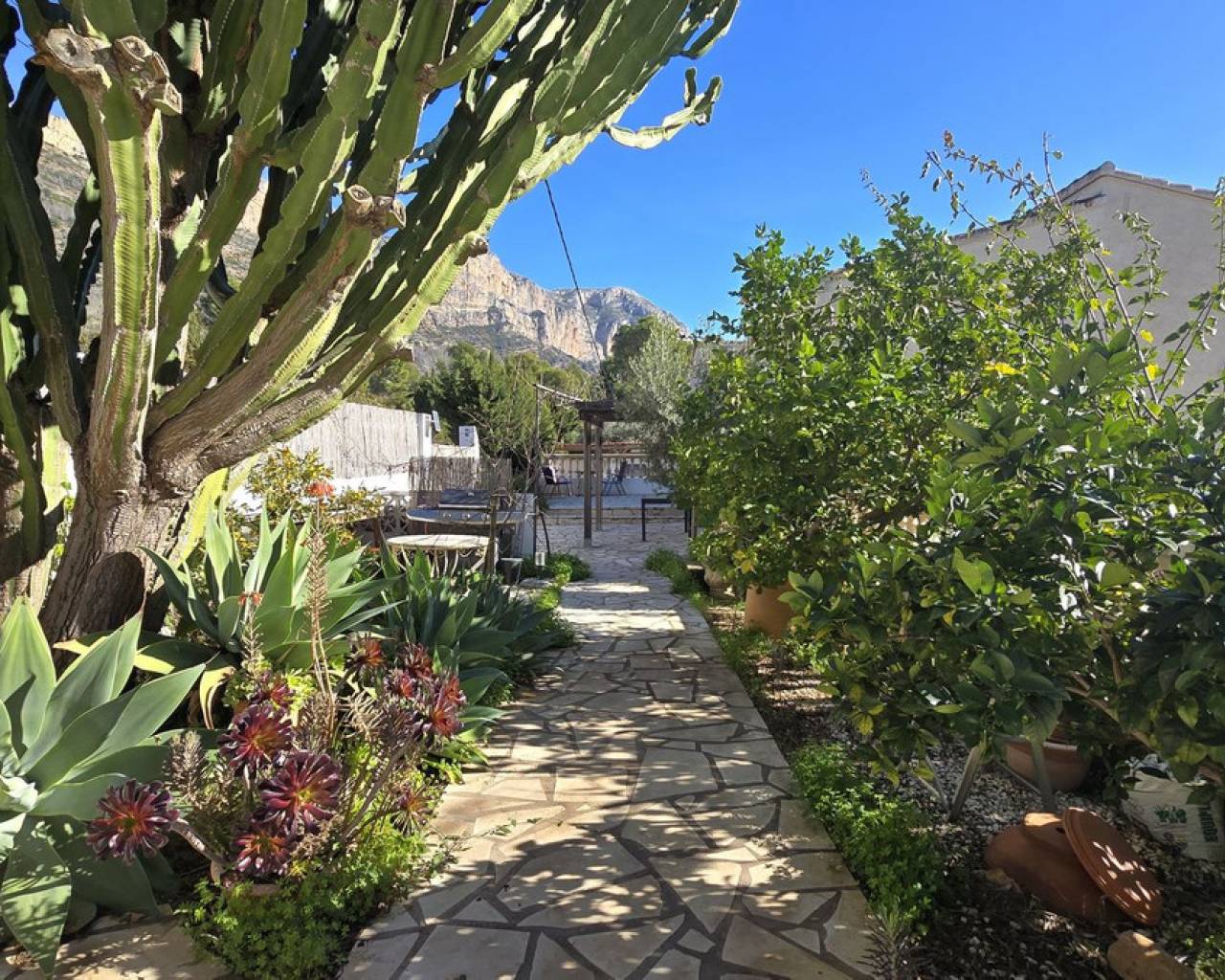 Esta villa, situada en un lugar tranquilo y soleado, ofrece una hermosa vista del Montgó y se destaca, entre otras cosas, por su ubicación cercana al campo de golf La Sella, así como por su buena conexión con Jávea, Jesús Pobre y Denia. La casa ofrece mucho espacio, privacidad y opciones de uso flexibles, ideal para familias, invitados o para combinar vivir y alquilar. La planta principal incluye un amplio y abierto salón-comedor, una cocina independiente completamente equipada con un pequeño rincón para desayunar, tres dormitorios con armarios empotrados y dos baños. Una estufa de pellets proporciona un calor y ambiente agradables; la mayoría de las ventanas son de doble acristalamiento y dos de los dormitorios cuentan con aire acondicionado. En el sótano se encuentra un apartamento independiente con tres dormitorios, salón, cocina y baño, ideal para visitantes o como unidad de vivienda completamente autónoma. La planta superior es fácilmente accesible desde la calle más alta, mientras que la superficie habitacional inferior con el apartamento independiente tiene su propio acceso desde la calle más baja. Esto crea dos áreas independientes, de fácil acceso, con óptima privacidad y uso flexible. Además, la villa cuenta con una piscina privada, terrazas soleadas, un carport en la planta superior y otro en el sótano, y amplios trasteros. Posee un buen aislamiento estructural, las instalaciones son de fácil acceso en la zona del sótano, lo que facilita el mantenimiento y posibles ajustes. Una villa versátil en una ubicación muy buena, donde el entorno tranquilo y la hermosa vista de la montaña contribuyen a un agradable ambiente residencial.