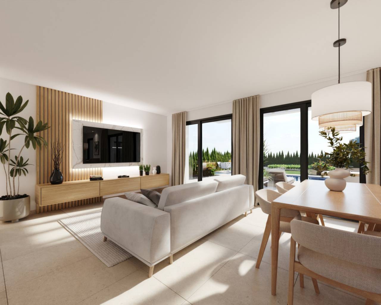 Villas de nueva construcción con grandes parcelas de más de 540 m² en el resort de golf Hacienda del Álamo en Murcia. Estas villas tienen toda la zona de estar en una sola planta, con piscinas privadas, grandes jardines y una terraza en la azotea. Constan de tres dormitorios y dos baños, así como una sala de estar y comedor con cocina abierta. Los interiores contarán con abundante luz natural gracias a los grandes ventanales y su orientación soleada. Estas propiedades son perfectas para quienes buscan una hermosa casa de vacaciones o una residencia permanente en España. Como puede verse en las imágenes, las parcelas tienen espacio para un huerto, por lo que si deseas combinar golf, "agricultura" y sol, estas serán ideales. Cerca se encuentra el hotel del campo de golf, que dispone de bar y restaurante, y también está cerca la localidad de Fuente Álamo de Murcia. La ciudad de Murcia está a solo 40 minutos en coche, donde encontrarás tiendas, restaurantes de alta cocina y el ambiente de una gran ciudad. El aeropuerto internacional de Murcia está a solo 20 minutos en coche, lo que resulta muy conveniente.